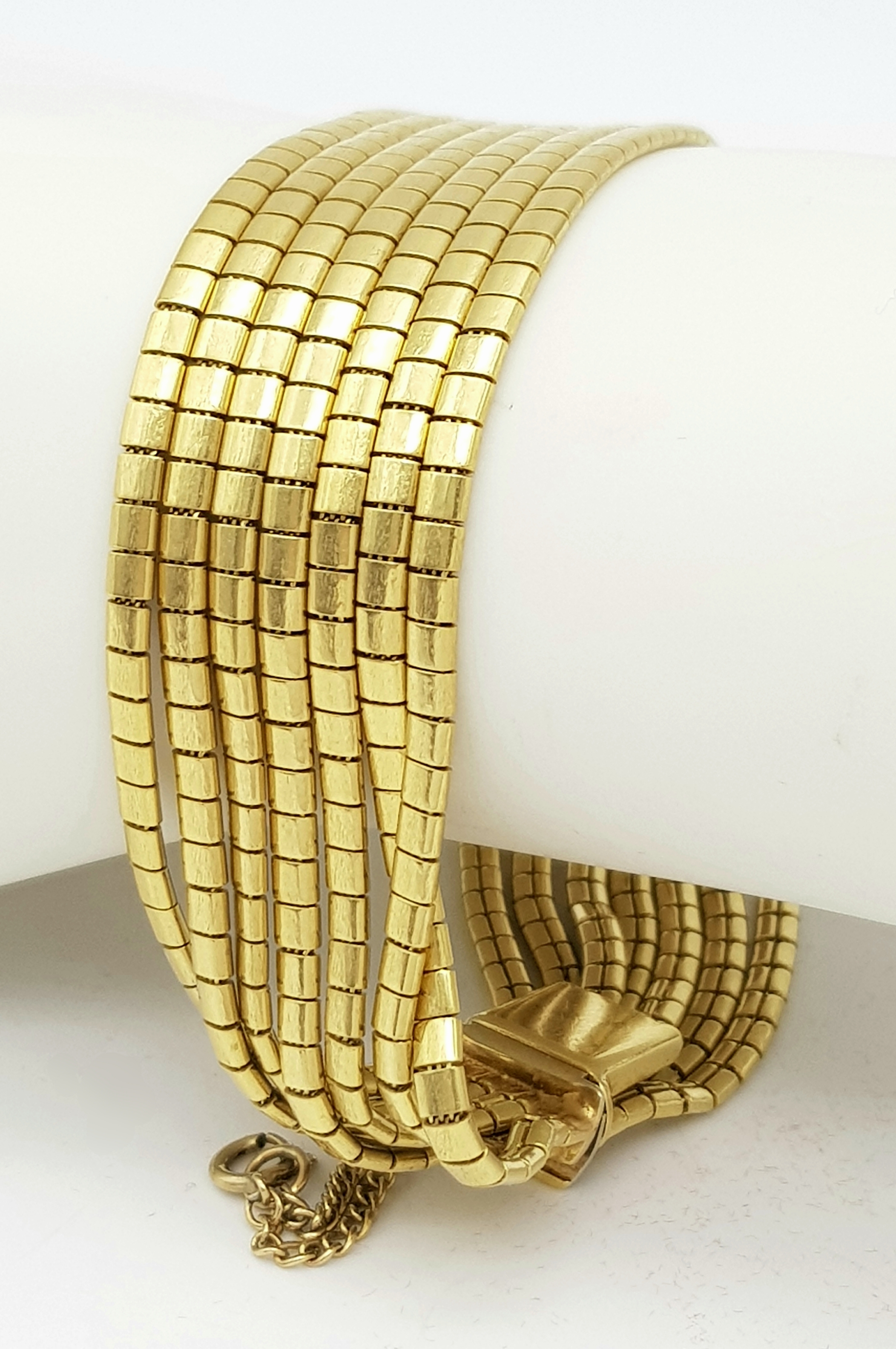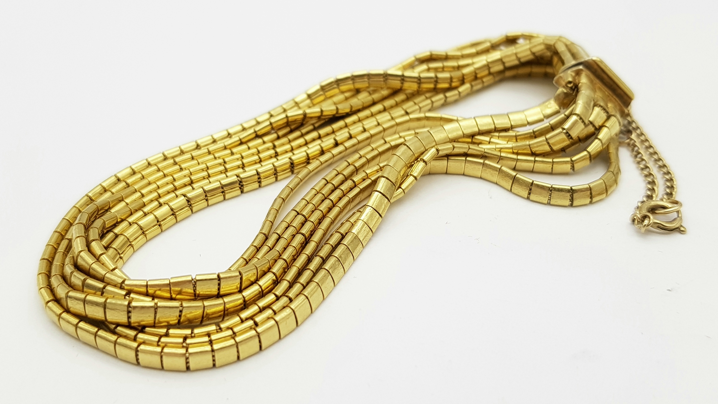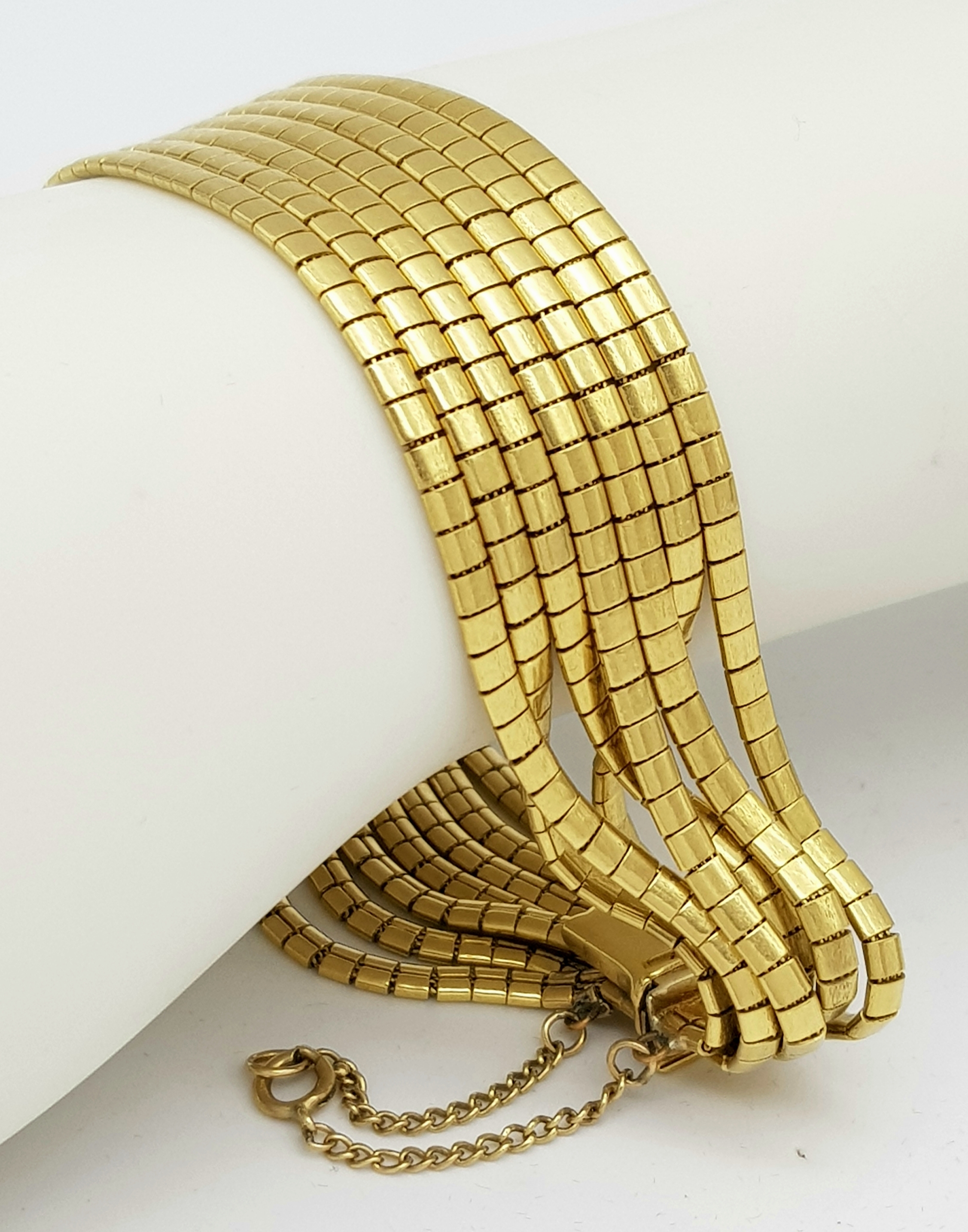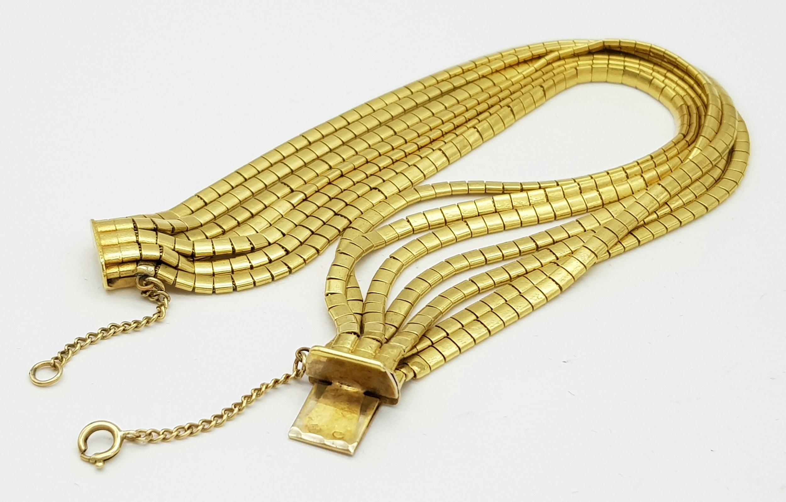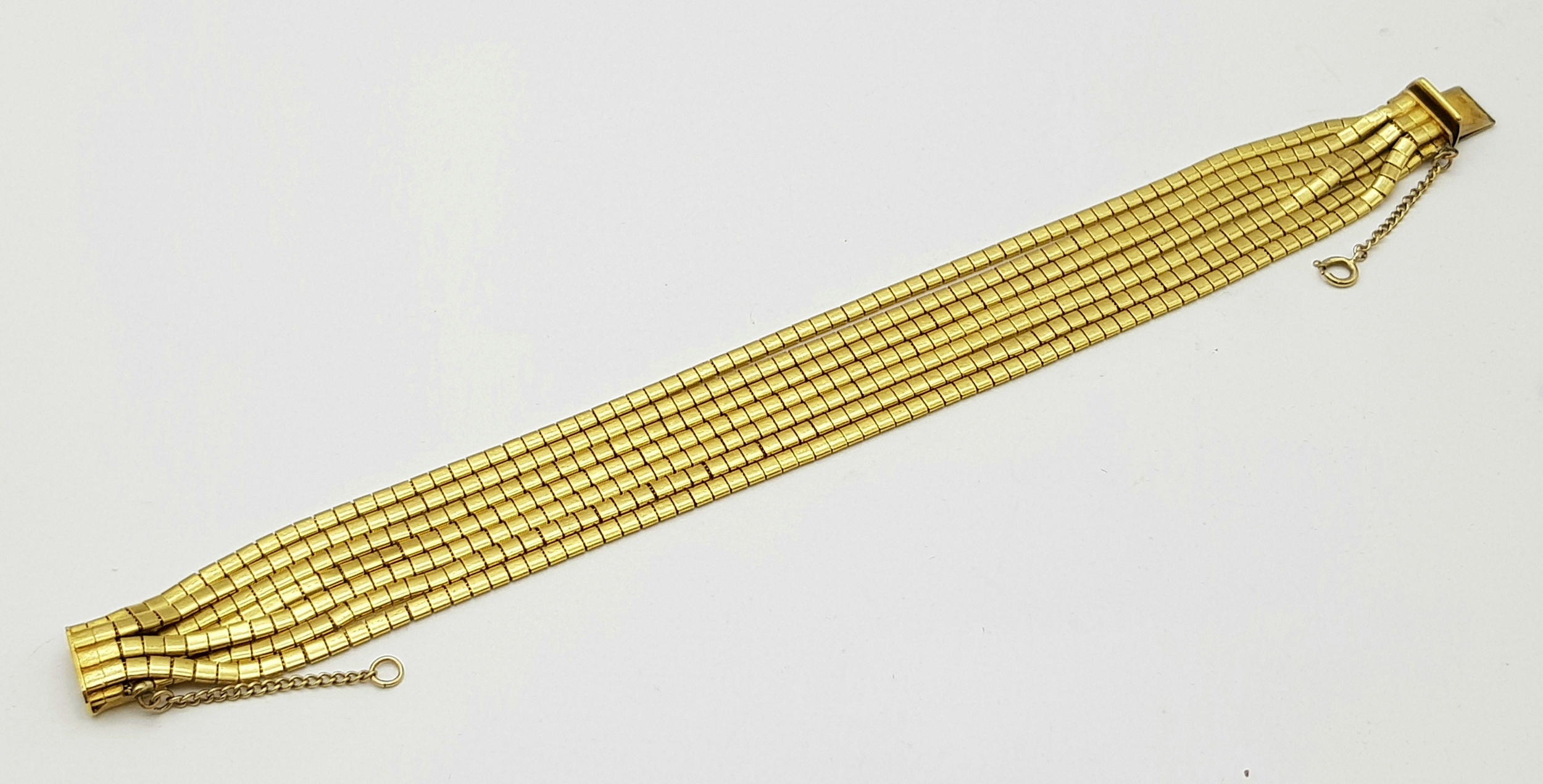 A Beautiful 18K Yellow Gold (tested) Seven Strand Link Bracelet. Clip open design with safety chain. 18cm. 48.2g.