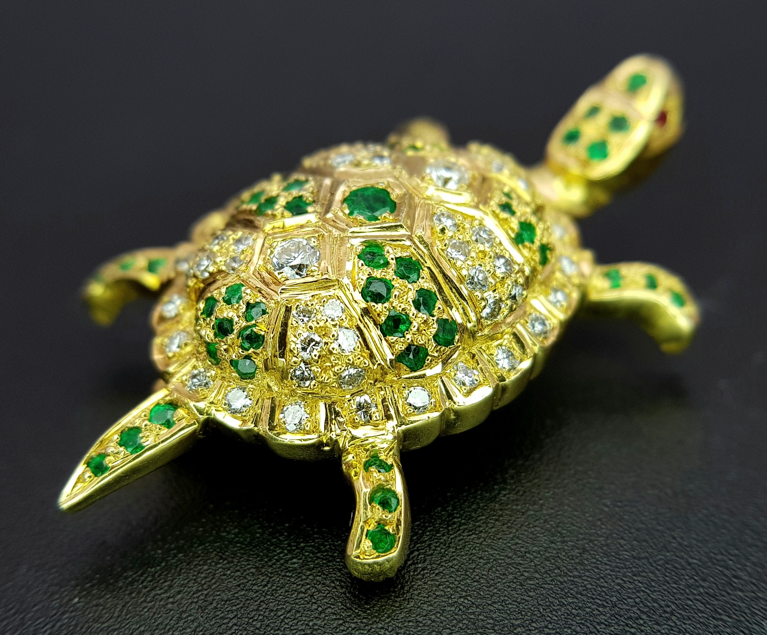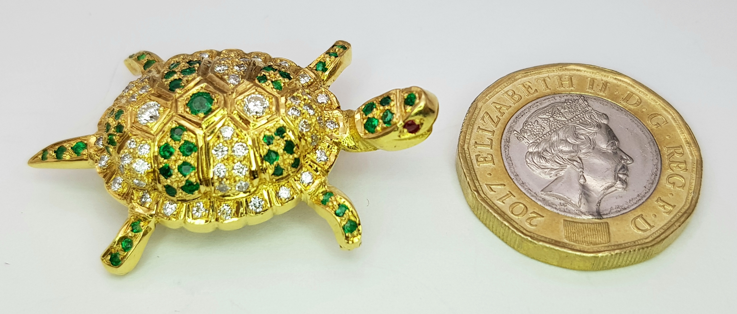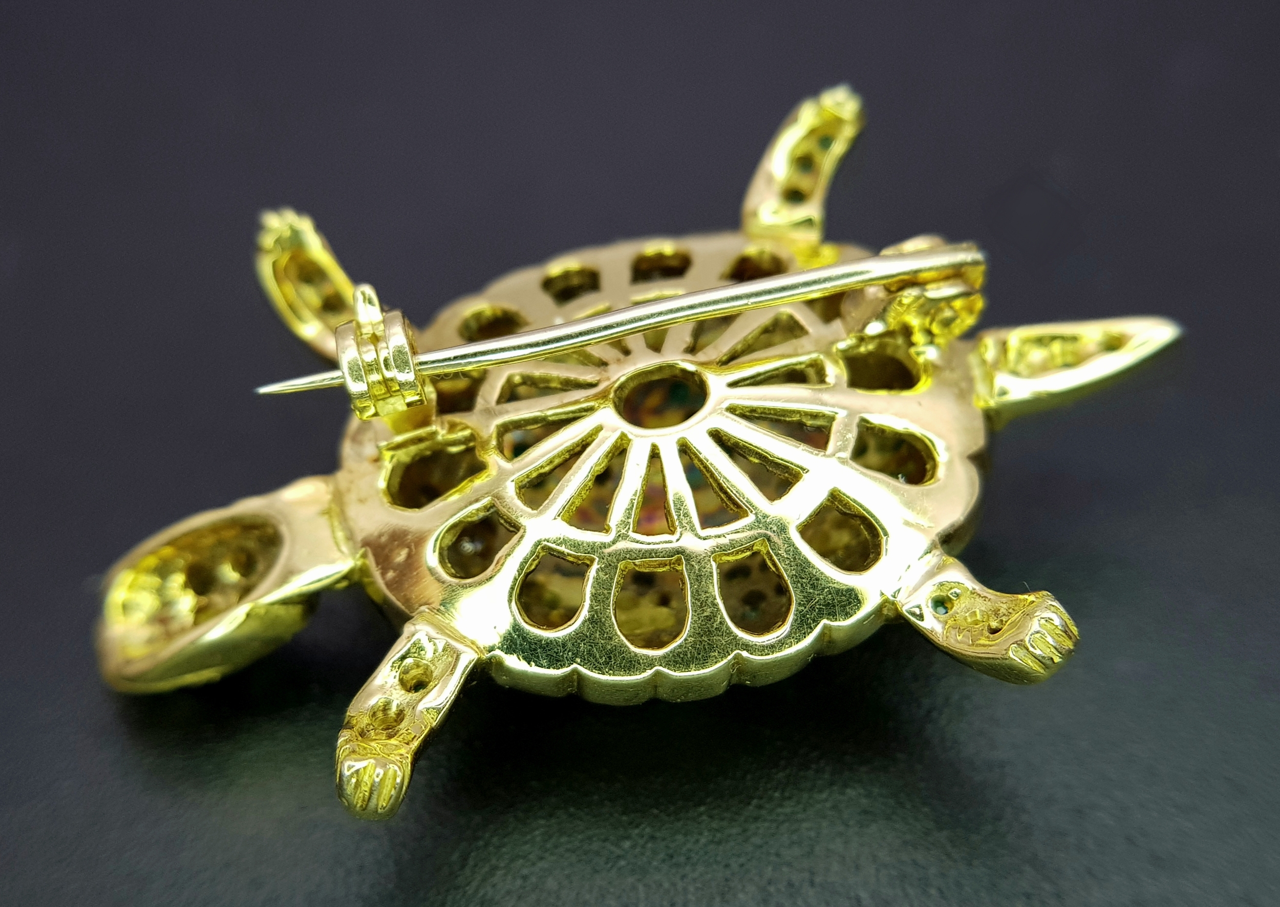 An 18K YELLOW GOLD DIAMOND AND EMERALD SET TURTLE PIN BROOCH 12.4G WFBB. Ref: TH 7001