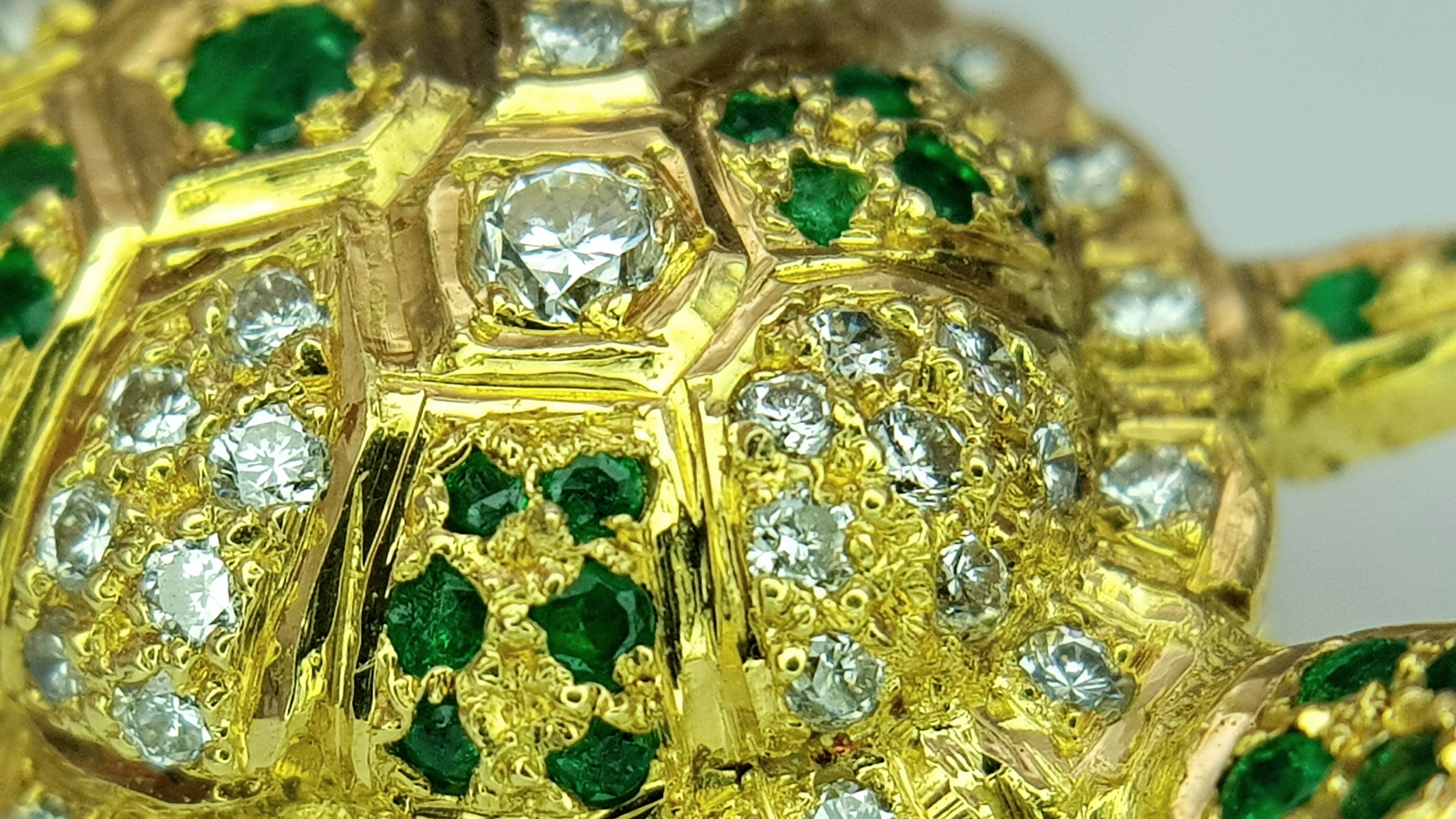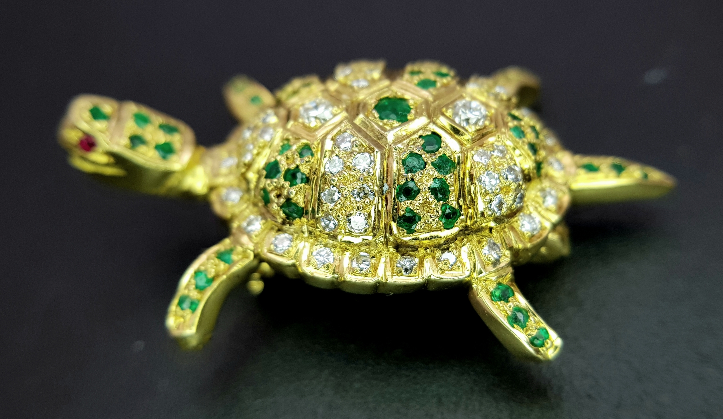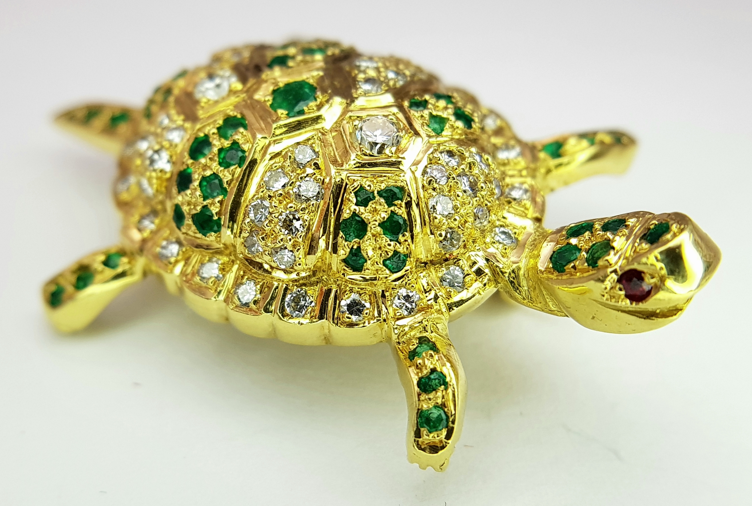 An 18K YELLOW GOLD DIAMOND AND EMERALD SET TURTLE PIN BROOCH 12.4G WFBB. Ref: TH 7001