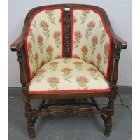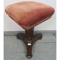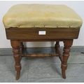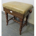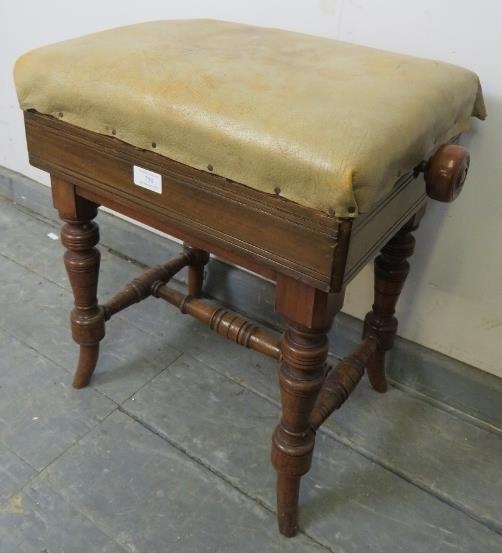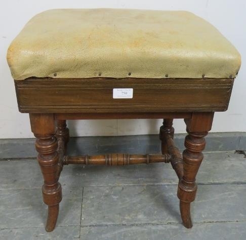 An Edwardian walnut height-adjustable music stool, upholstered in beige leather, on tapering turned supports united by a turned ‘H’ stretcher. H50 W50 D35 (approx).