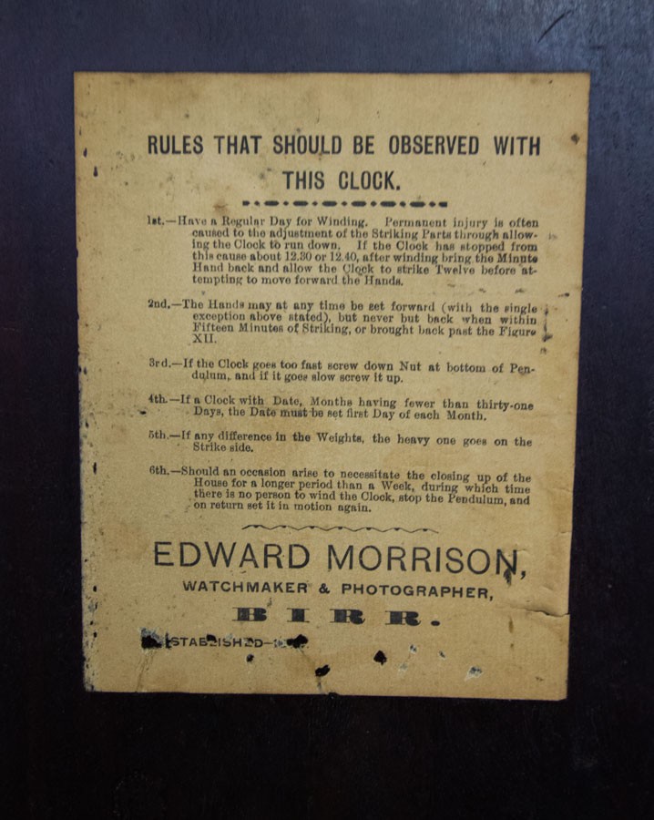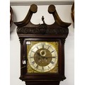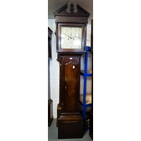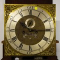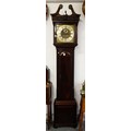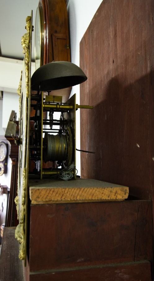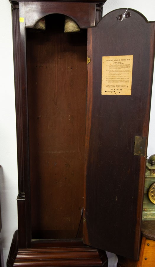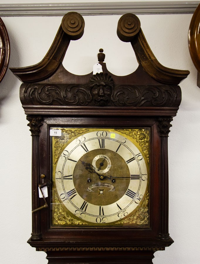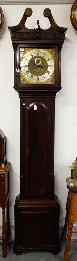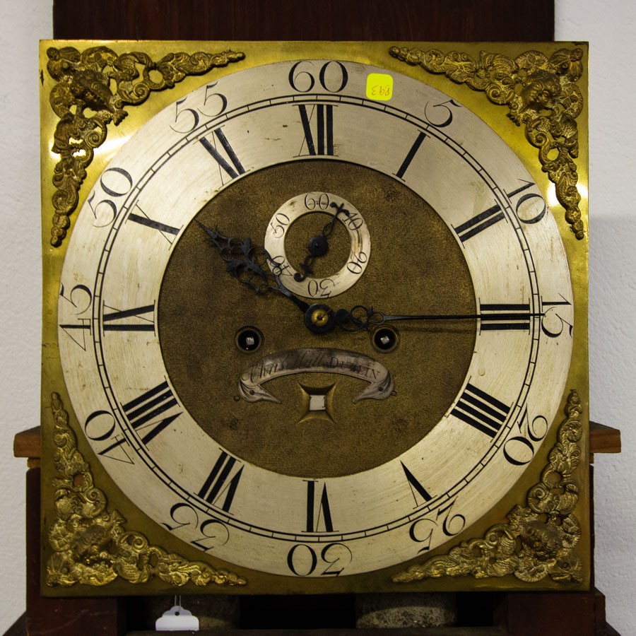 IRISH MAHOGANY CHIPPENDALE LONGCASE CLOCK, 13¼ -INCH SQUARE BRASS DIAL SIGNED ‘CHRISR. HULL / DUBLIN’ ON A BANNER, SQUARE DATE APERTURE, MASK AND SCROLLS TO CORNICE, QUARTER COLUMNS TO TRUNK, REEDING TO BASE, GREEK KEY MOULDINGS, WITH KEY, PENDULUM, AND TWO WEIGHTS, CA.1760