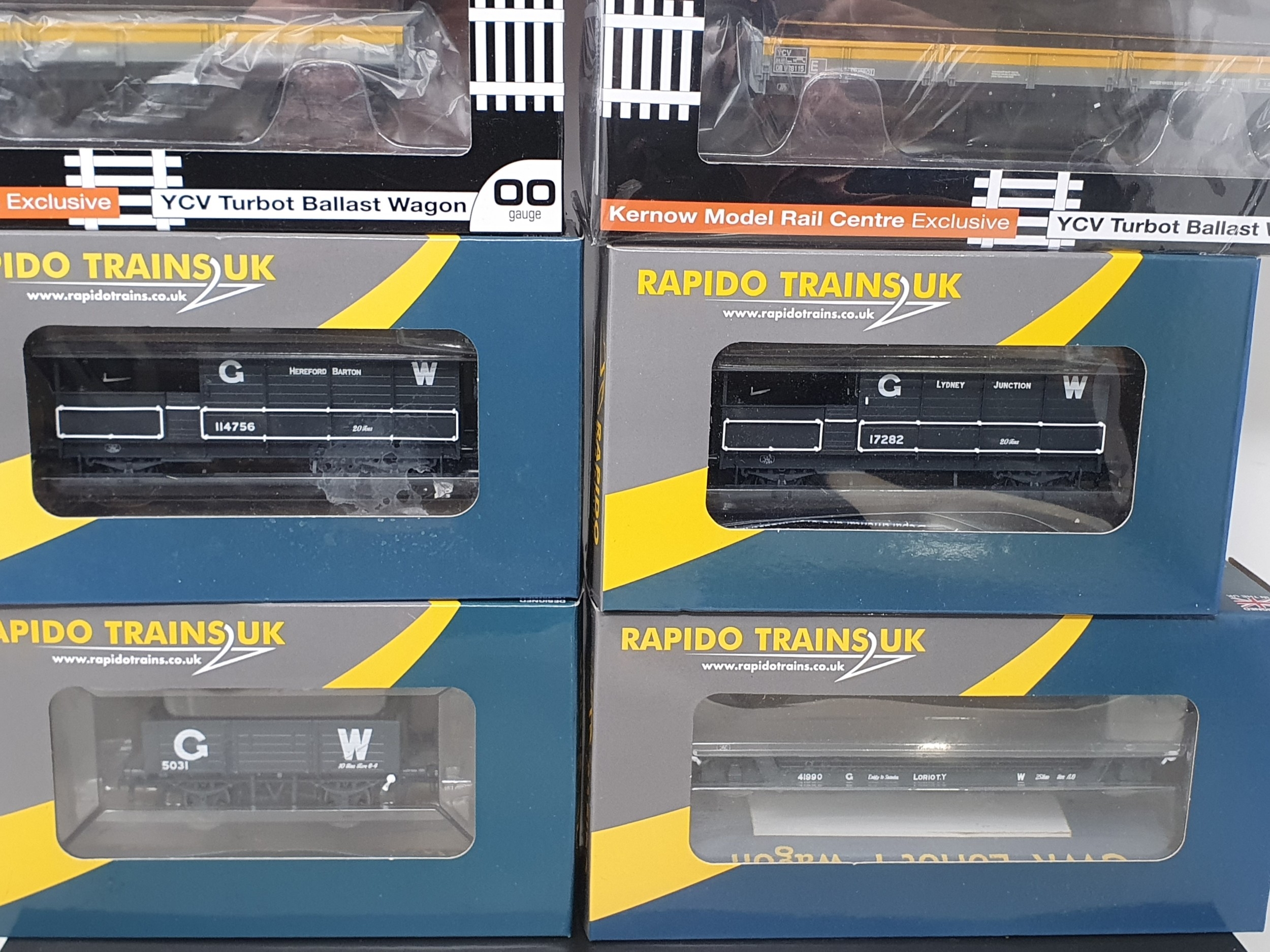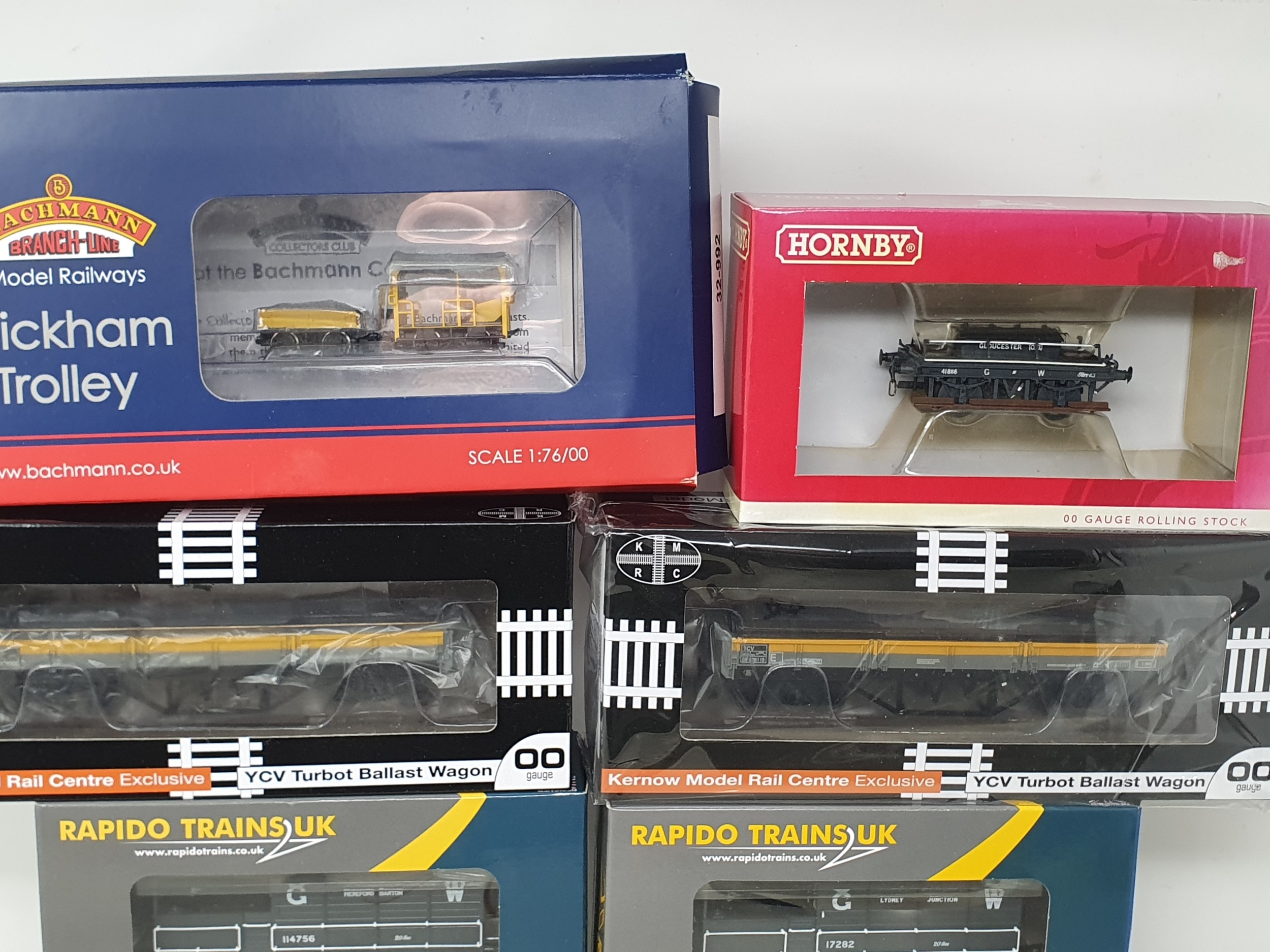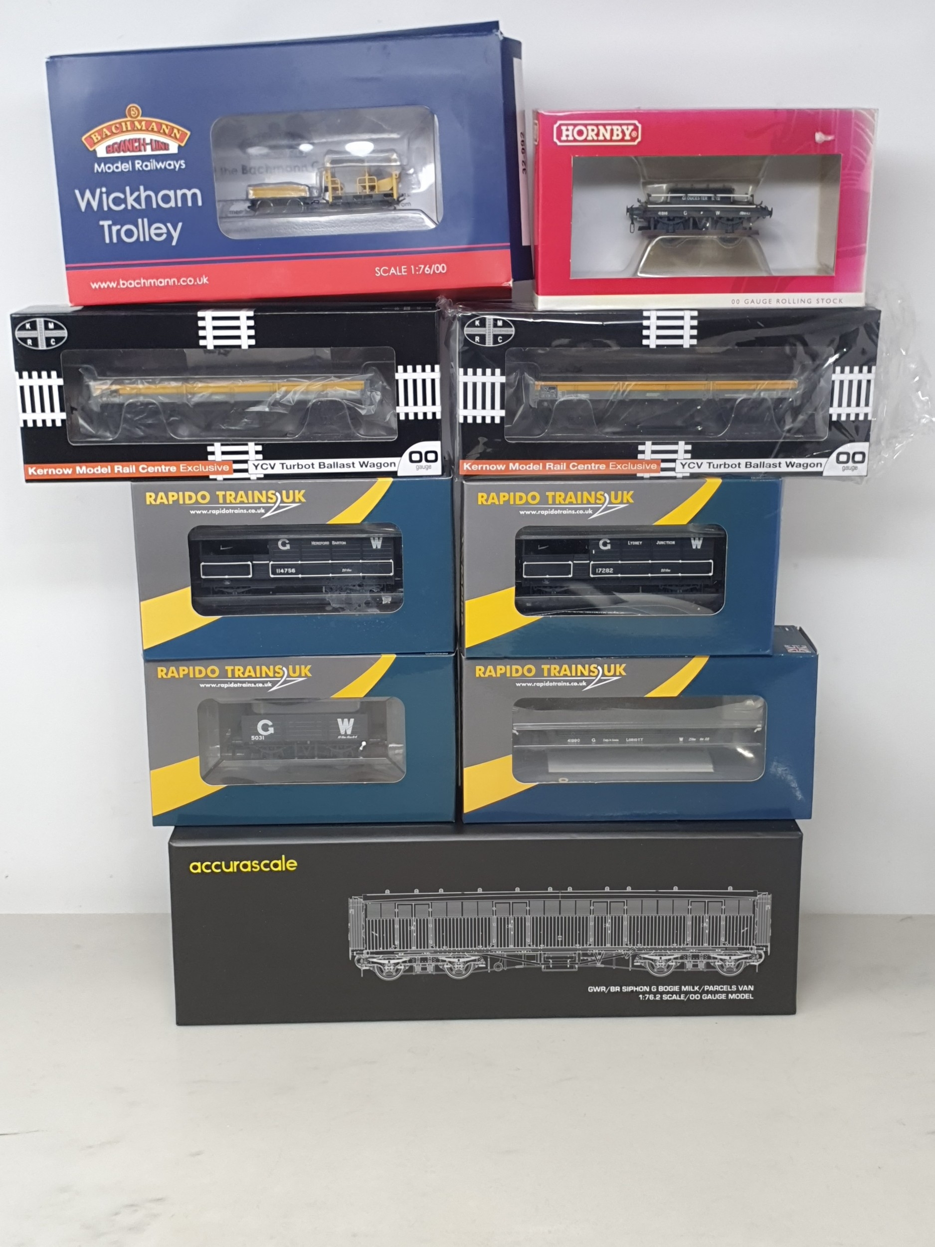 Nine boxed items of 00 gauge Rolling Stock comprising Accurascale Siphon G Pattern O.33 in GWR brown, a Bachmann 32-992 Wickham Trolley Car, 2x Kernow Models Centre YCV Turbot Bogie Ballast Wagons, Hornby R6642A GWR Shunters Truck Gloucester, Rapido Trains GWR Open B No.5031, Loriot Y, AA20 'Toad' Hereford GW grey, and aAA20 'Toad' Lydney Junction No.17282, all unused, boxes Nr perfect except Wickham which is slightly crushed on one end