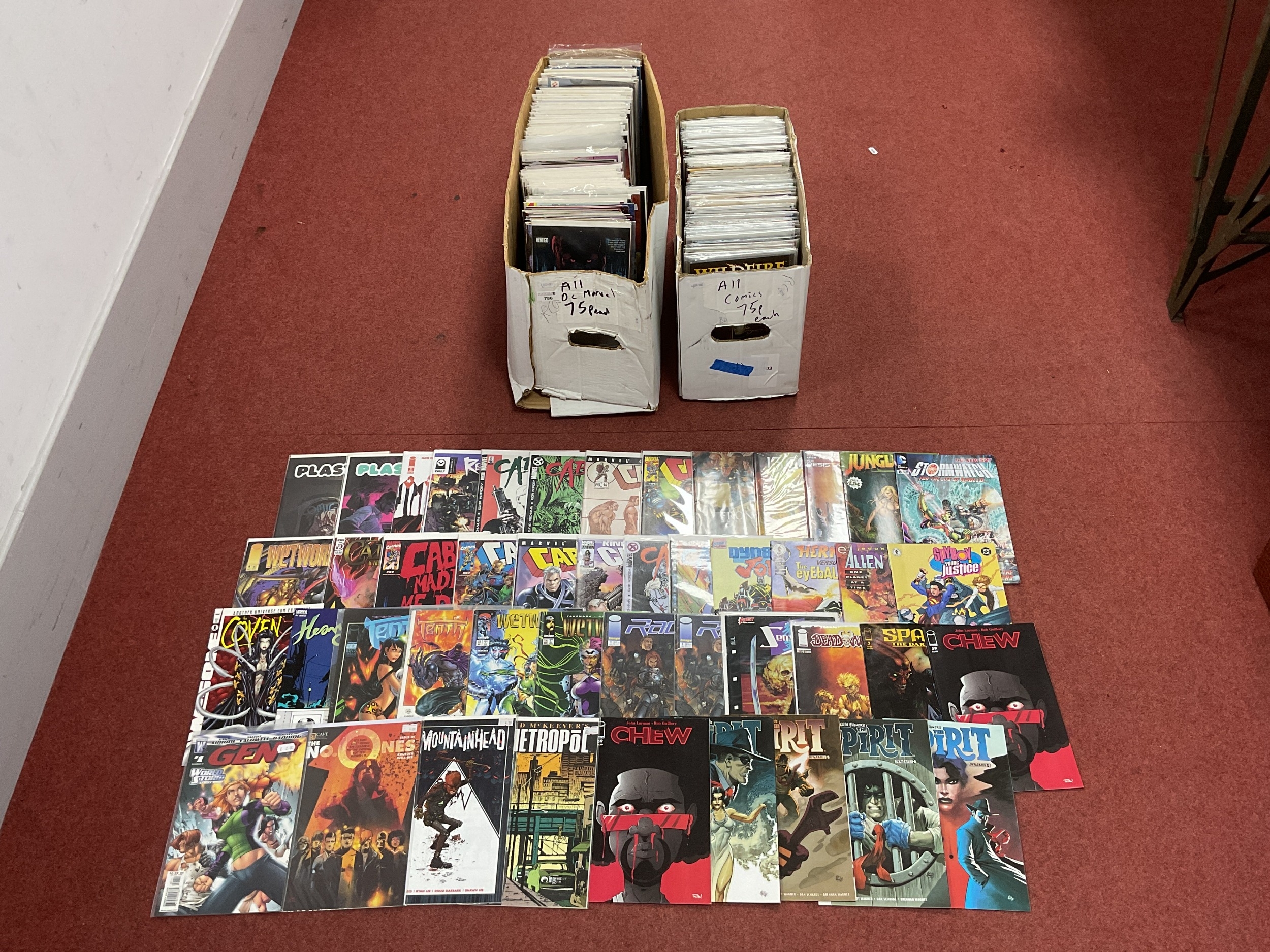 Approximately Four Hundred and Fifty Five Modern Comics, by DC, Marvel, First Comics, Wildstorm, Vertigo, Image and others. Including Spawn The Dark Ages #2, The League Of Extraordinary Gentlemen Vol.2 #6, Plastic #4, Izombie #9, Dead World #4, Cable #84, #96, #100, etc. Some Duplication. (Two Boxes).