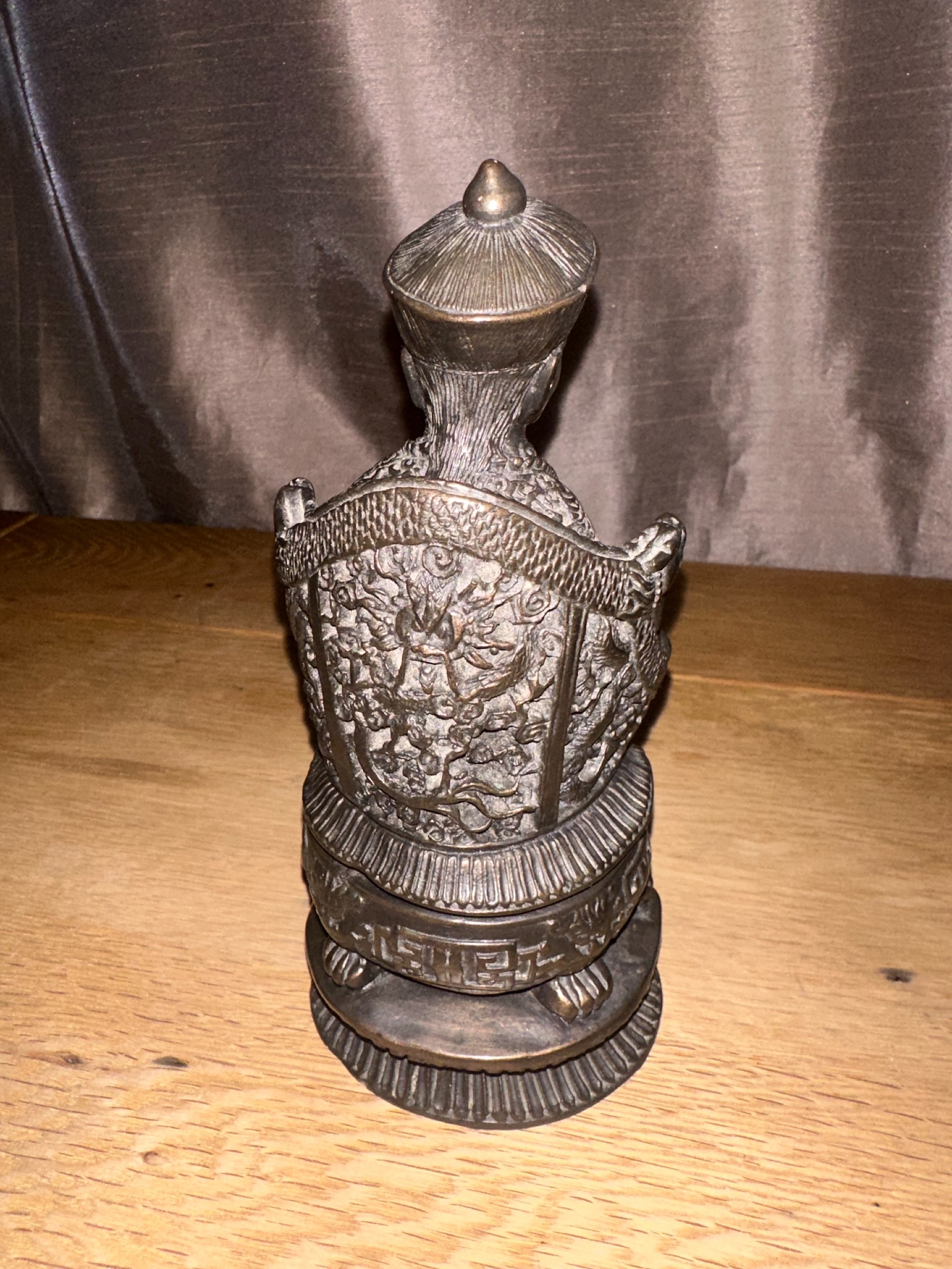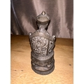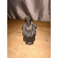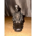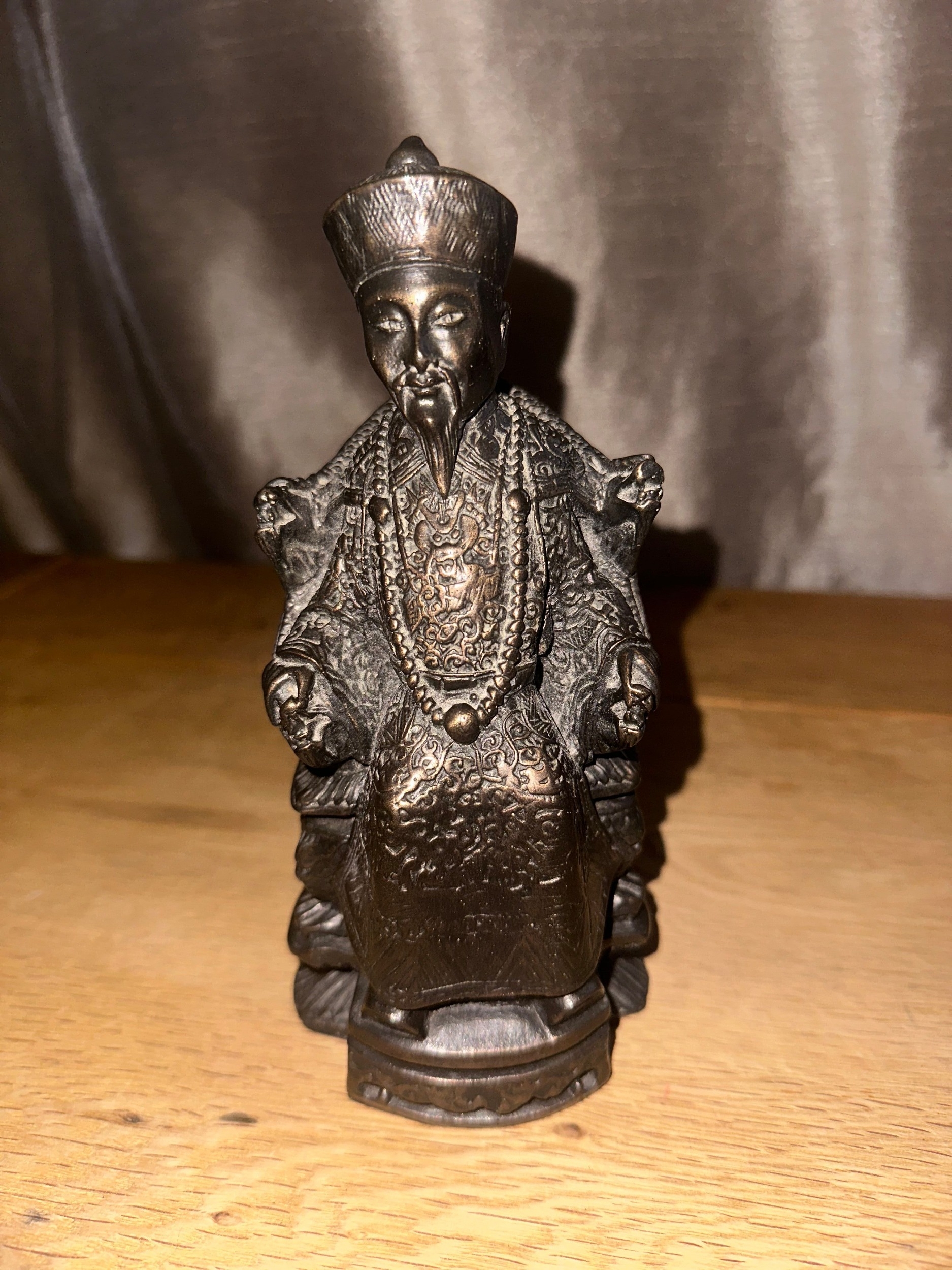 A single figural statuette, identified through market consensus as depicting Chhatrapati Shivaji Maharaj in a seated pose. The sculpture is cast in bronze or a dark metal alloy. The figure is shown wearing highly detailed formal robes, multiple beaded necklaces (court beads or malas), and a formal court hat, seated upon a throne-like chair structure. The back of the chair and the base feature intricate relief decorations, including stylized meander motifs and mythological patterns. No legible text or character markings are visible.
