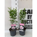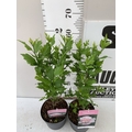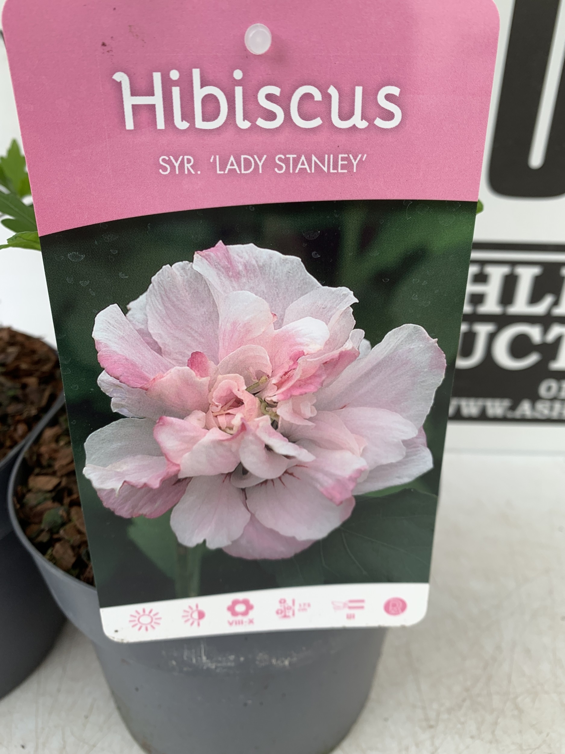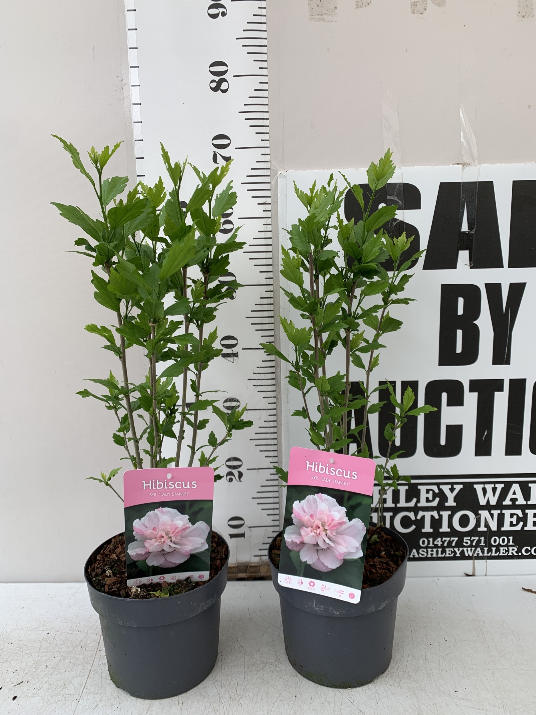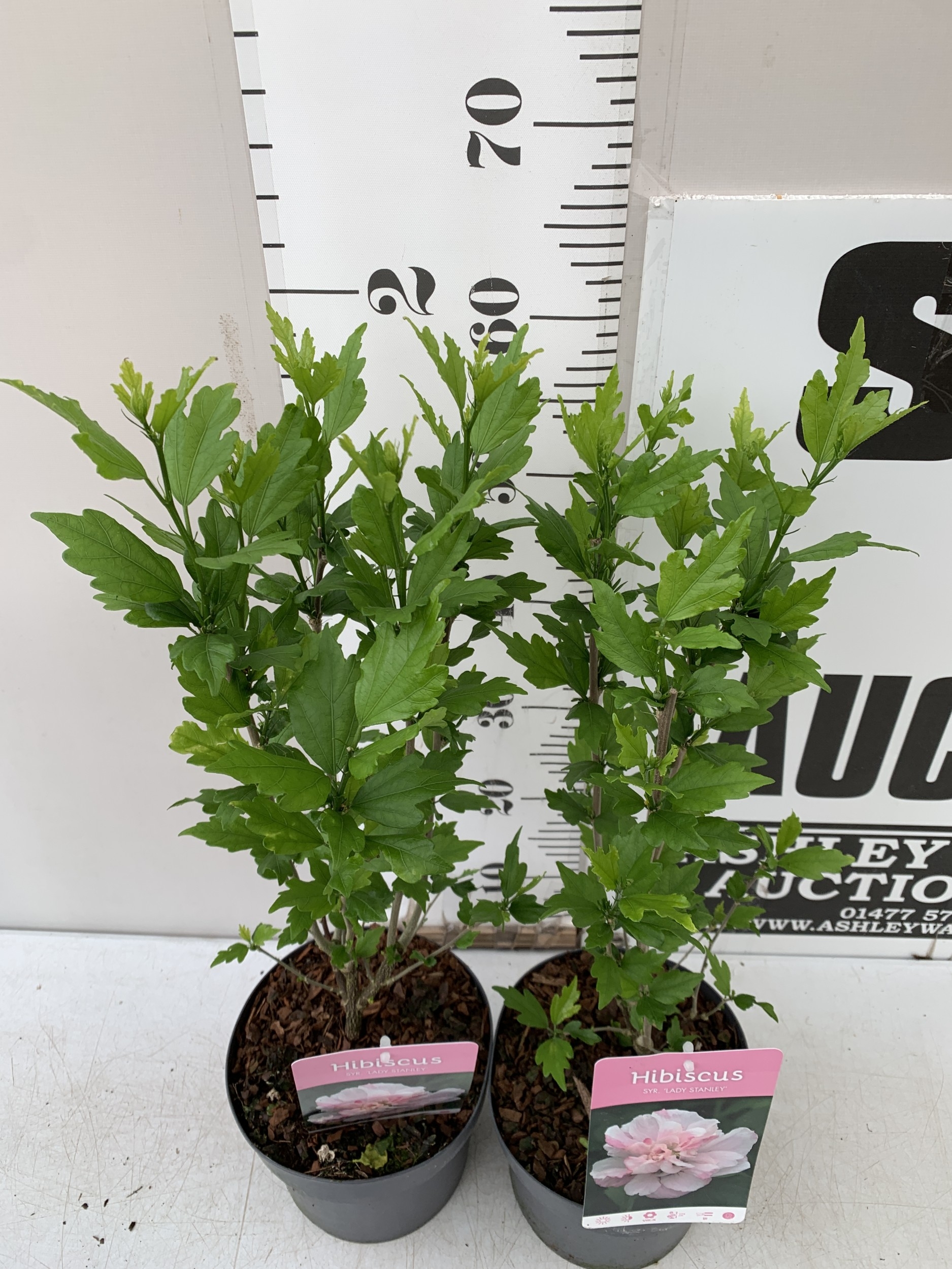 TWO PINK HIBISCUS SYRIACUS 'LADY STANLEY' IN 3 LTR POTS. APPROX 70CM TALL, TO BE SOLD FOR THE TWO