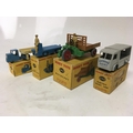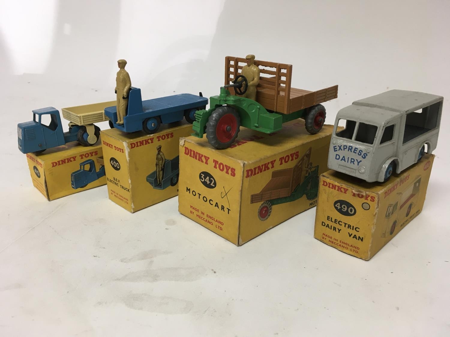 Dinky toys, #415 Mechanical horse and open wagon, #400 BEV electric truck, #342 Motocart and #490 Electric dairy van, boxed