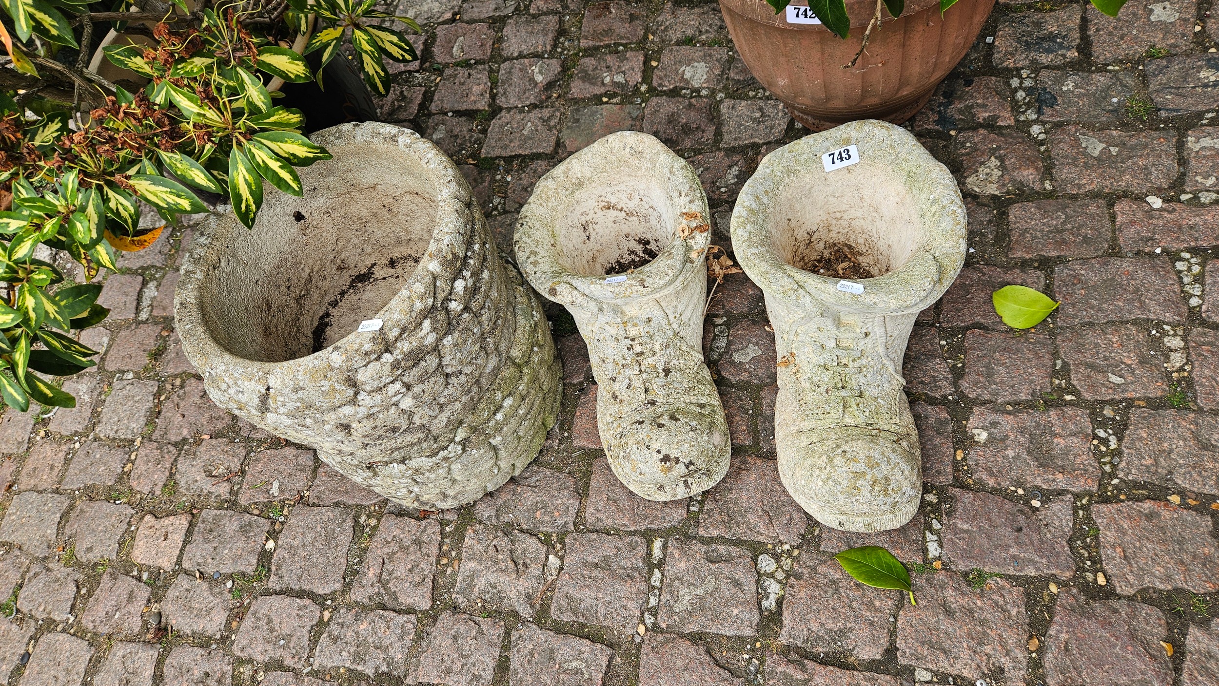 Pair of Circular Concrete Garden Planters and a Pair of Concrete Boot Planters