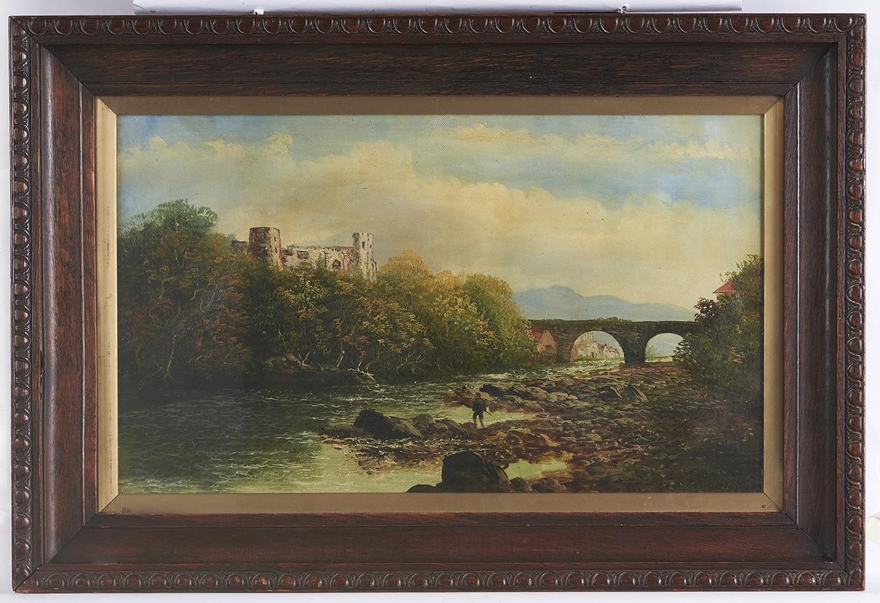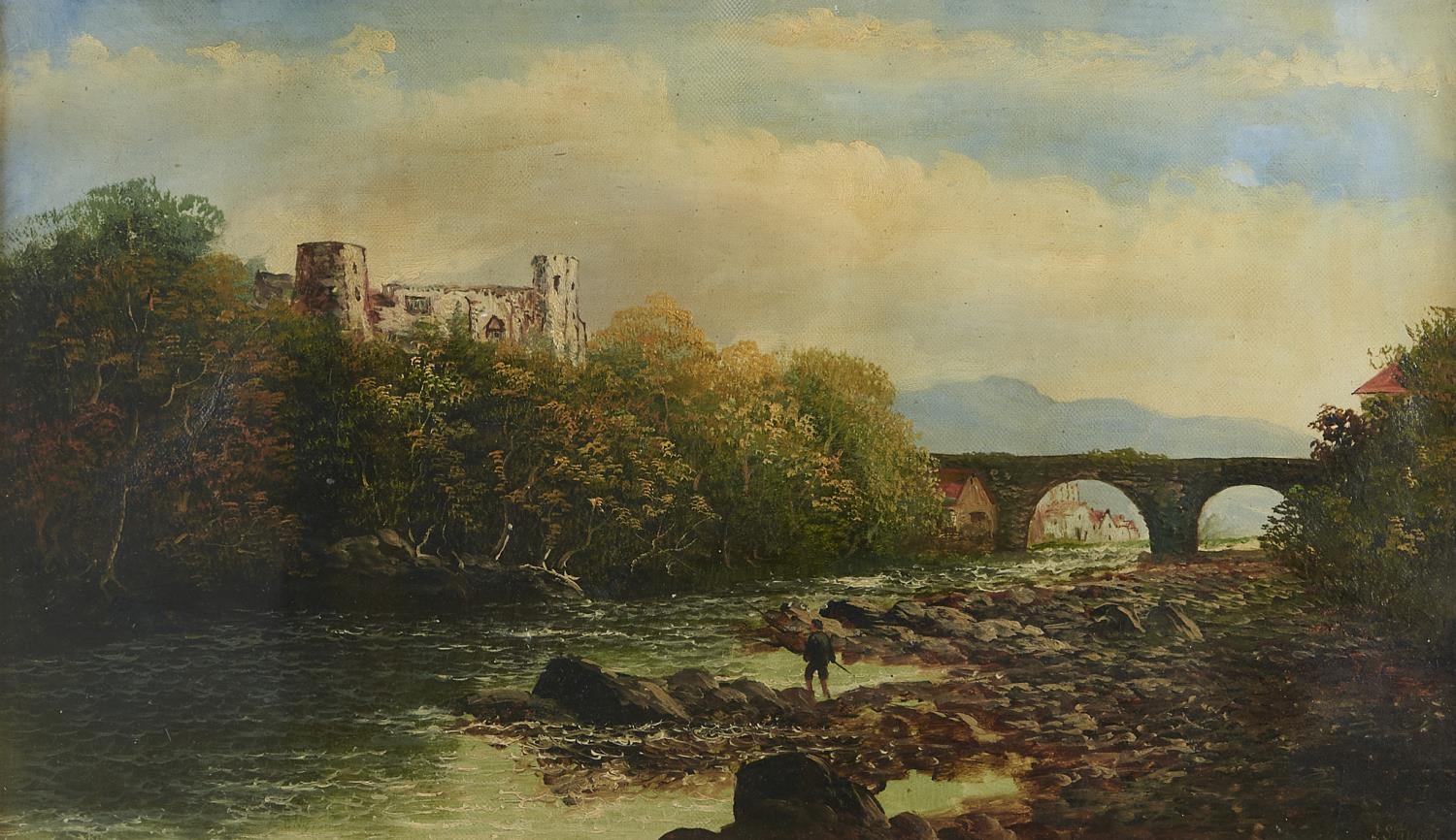 J Stanton (early 20th c) - An Angler on a Riverbank near a Castle, signed, oil on canvas, 29 x 51cm