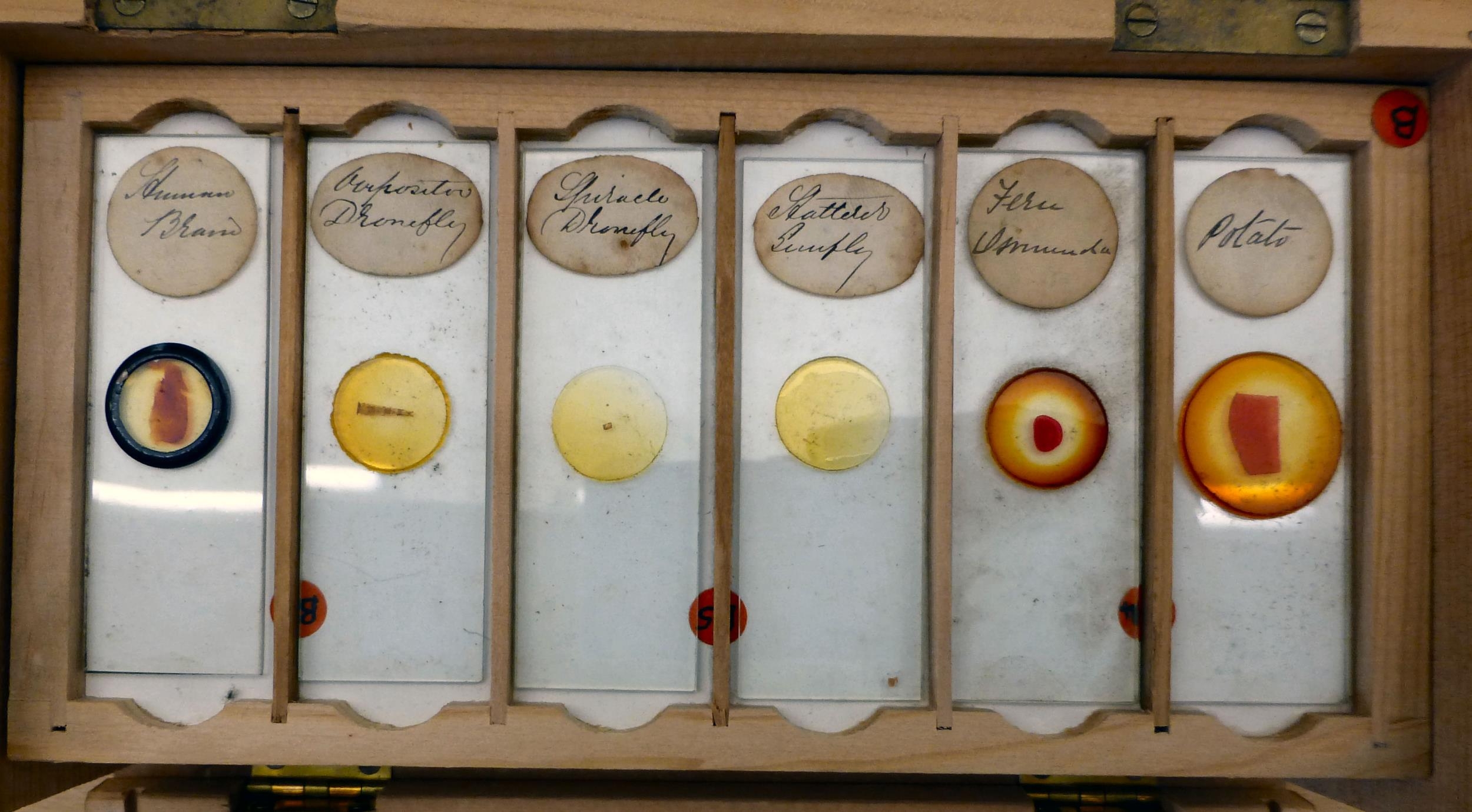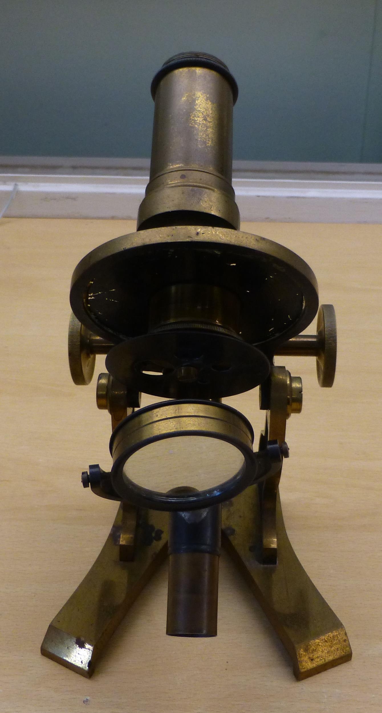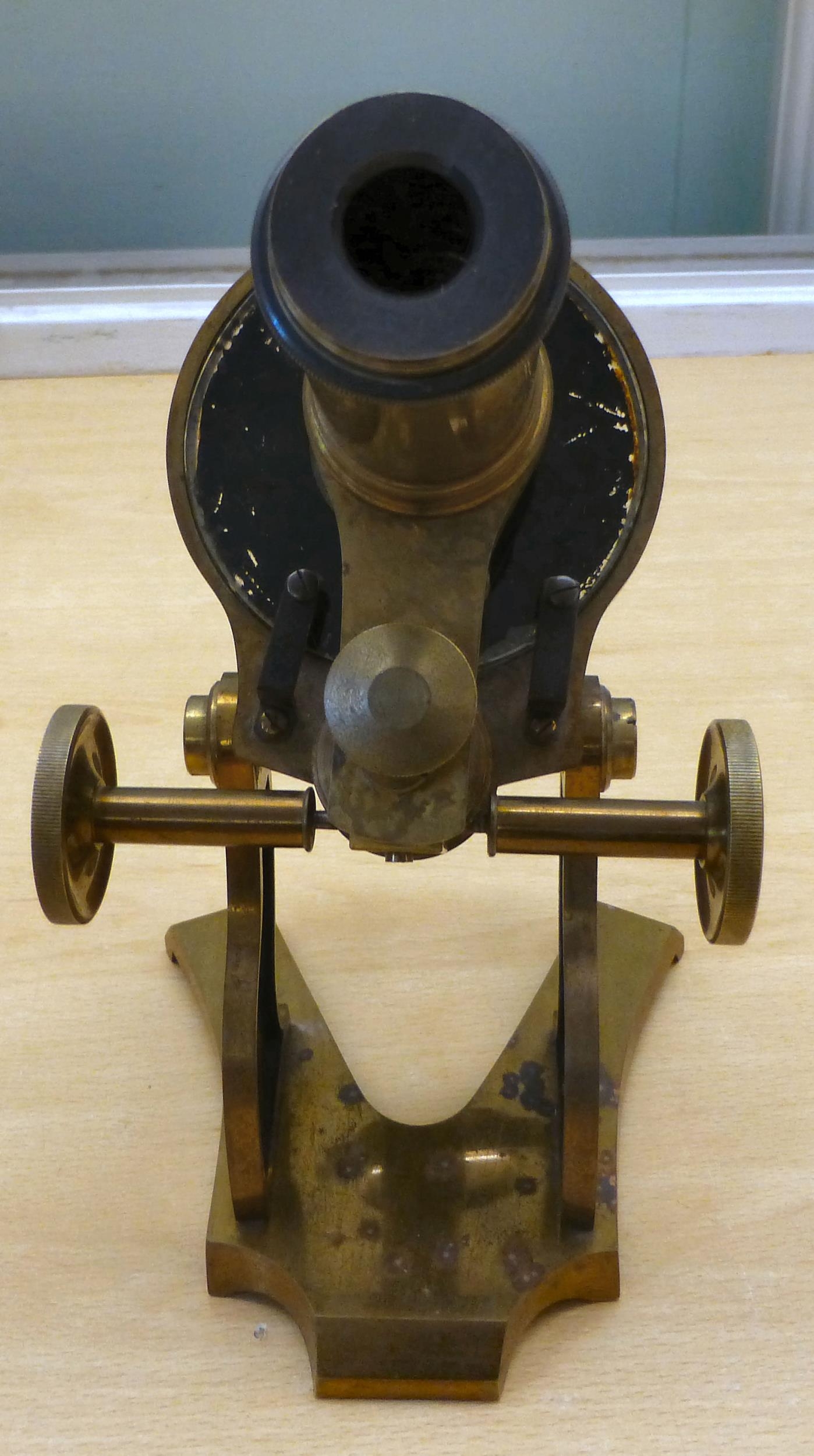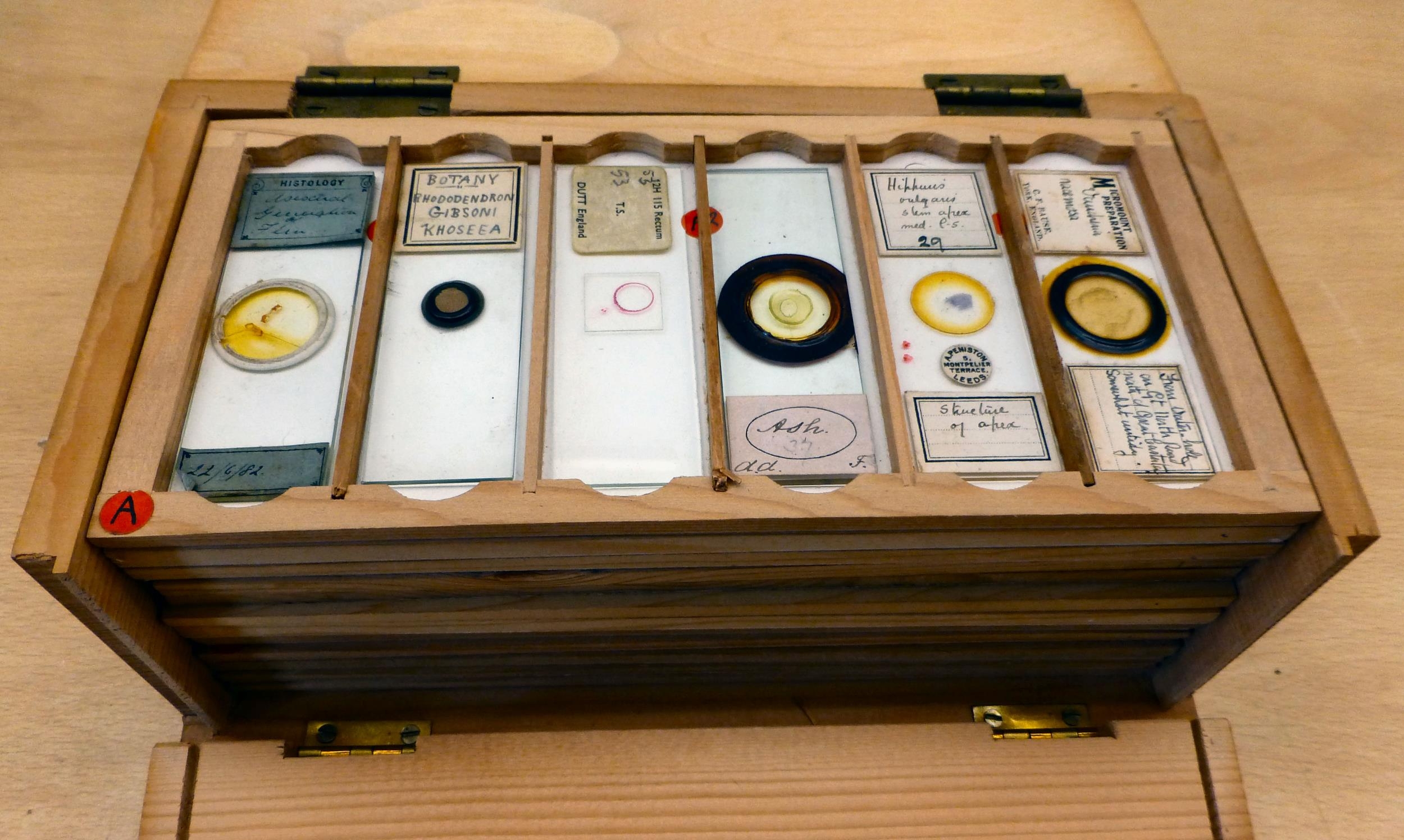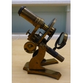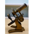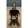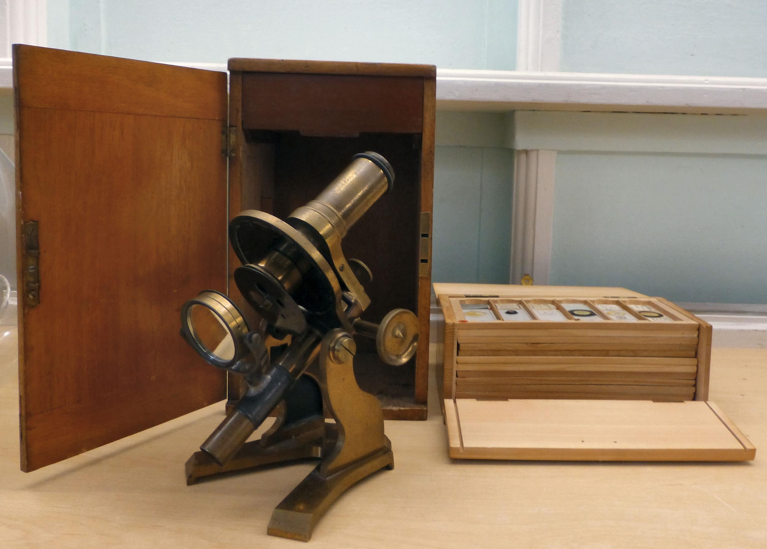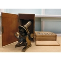 A lacquered brass microscope 9"h in a mahogany case; and approx. sixty slides