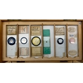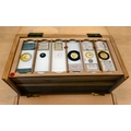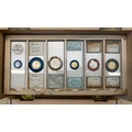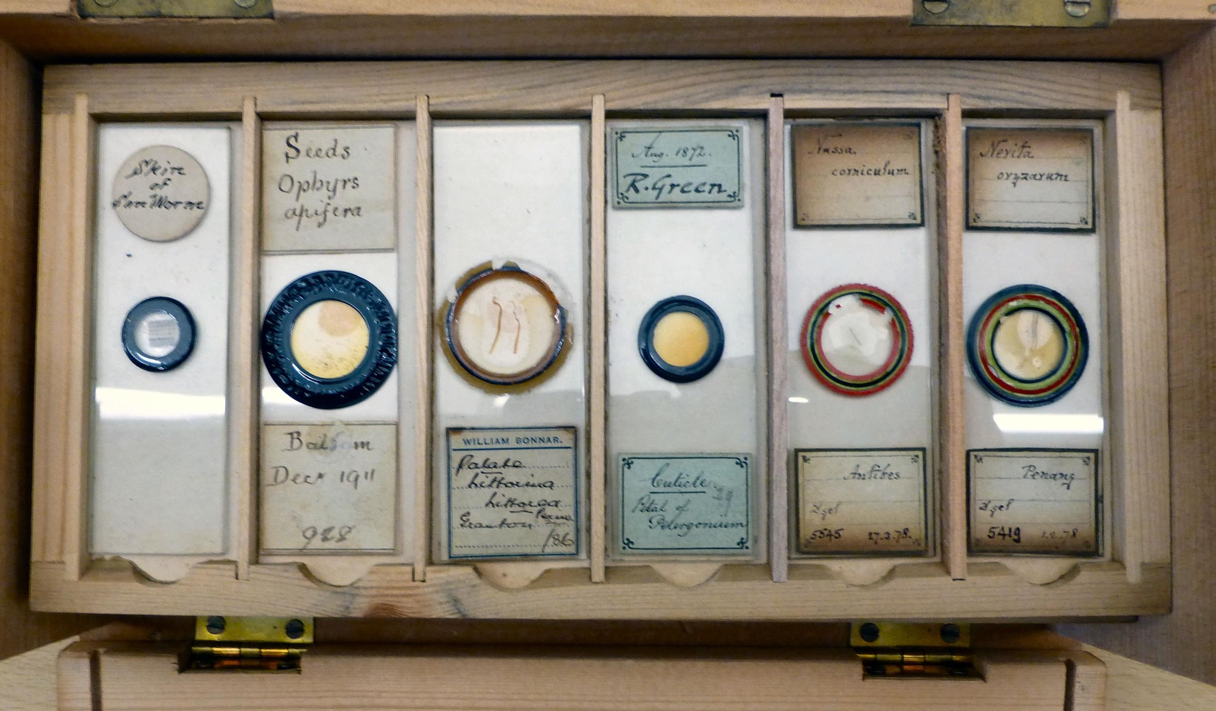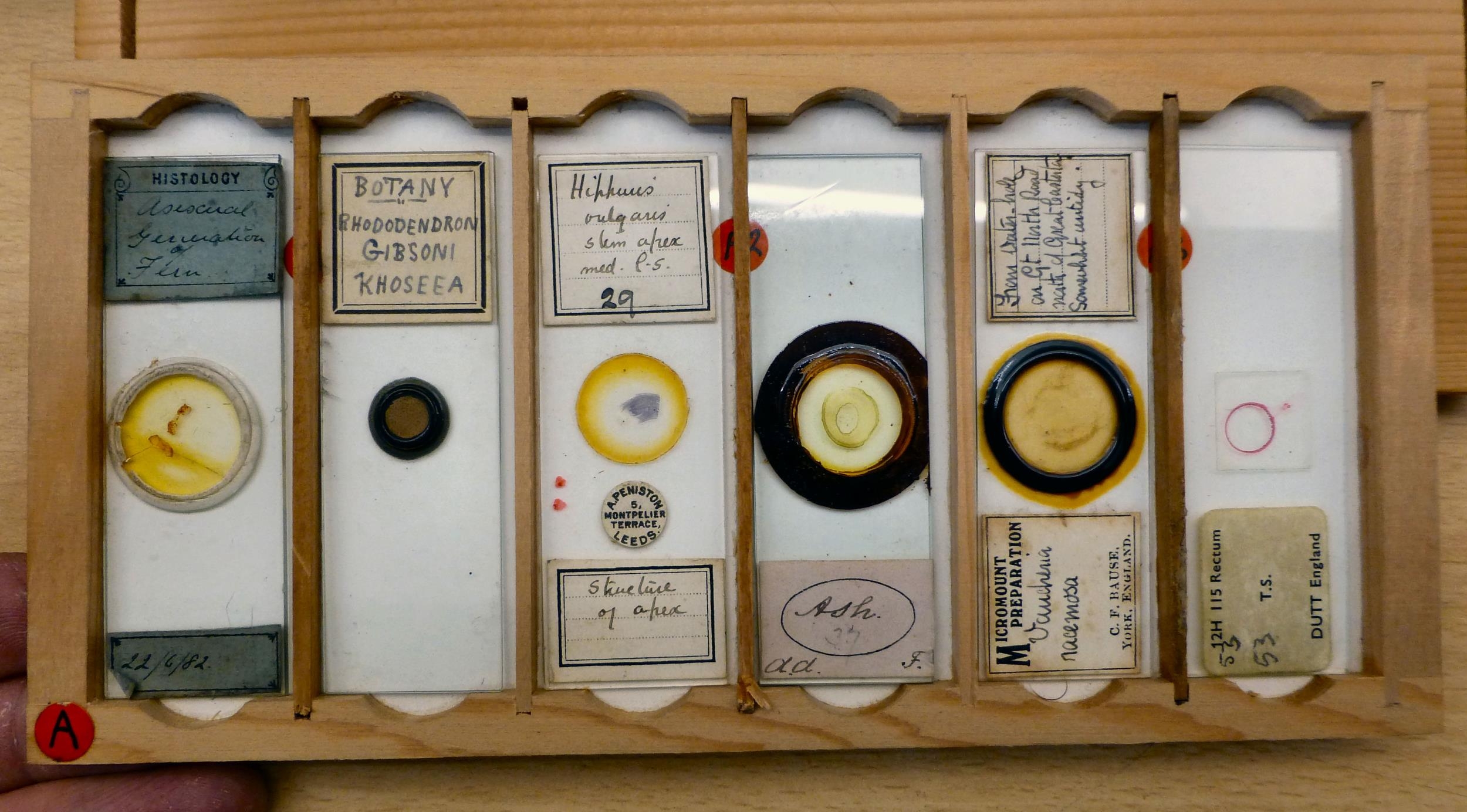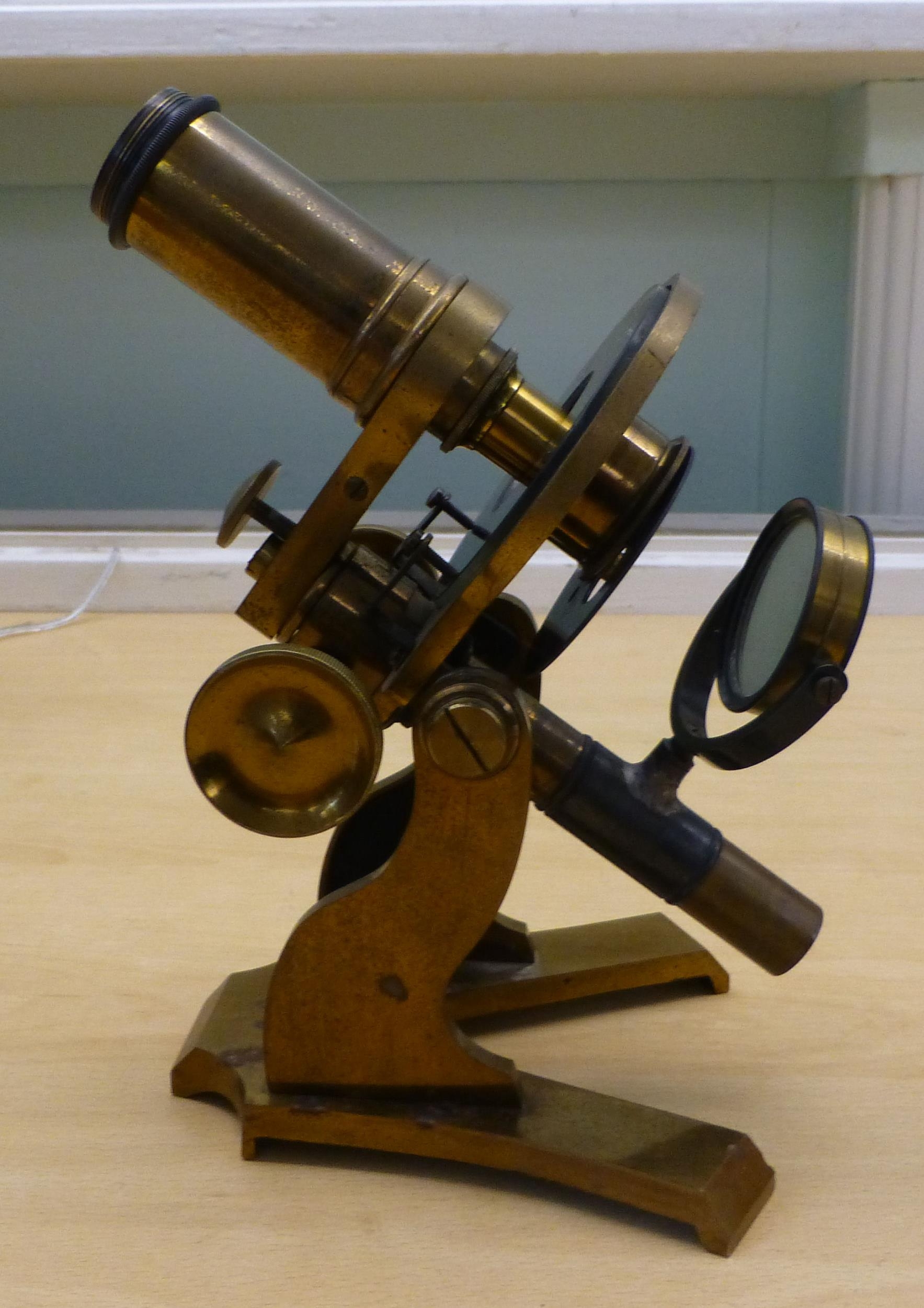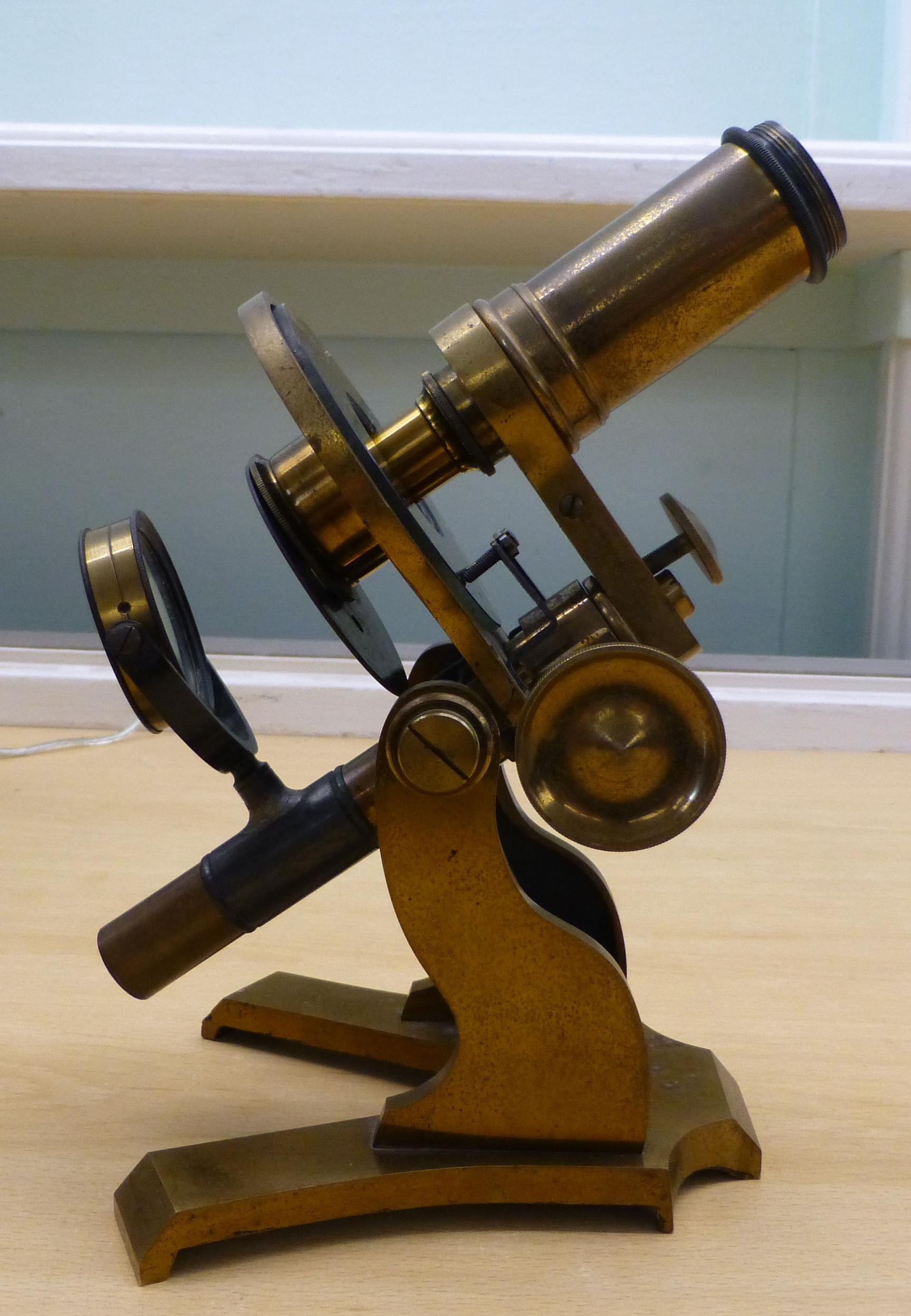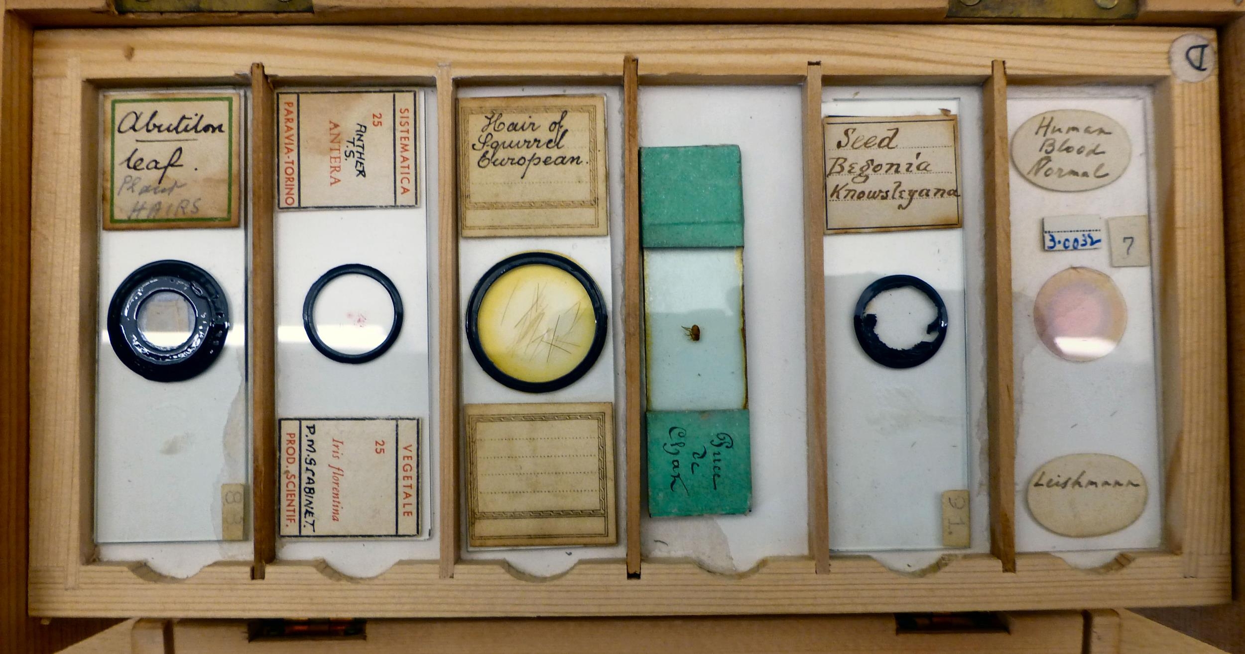 A lacquered brass microscope 9"h in a mahogany case; and approx. sixty slides