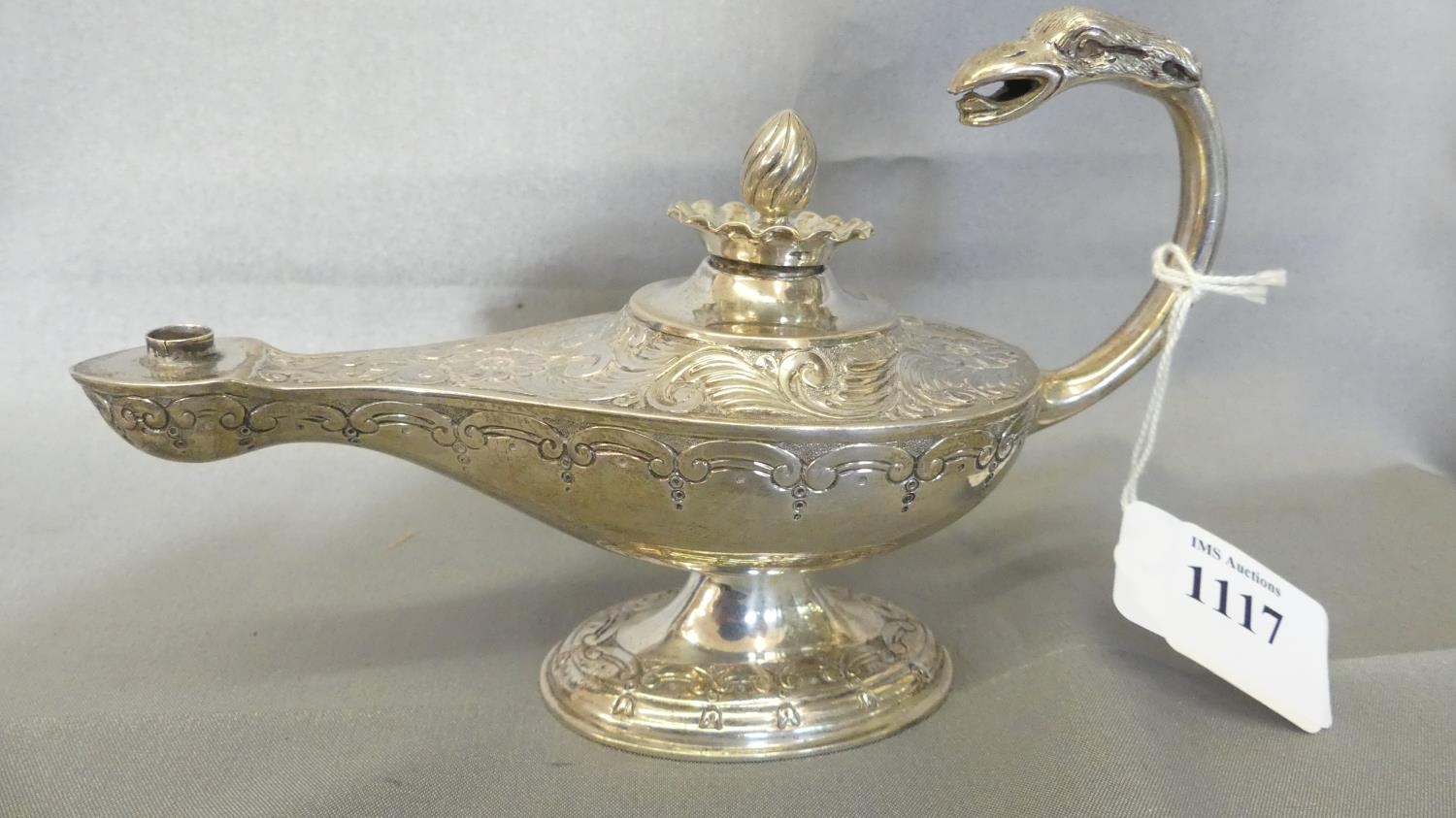Scottish Silver Table Lighter in the form of a Roman Oil Lamp with Swan Handle, 4.1oz Troy.