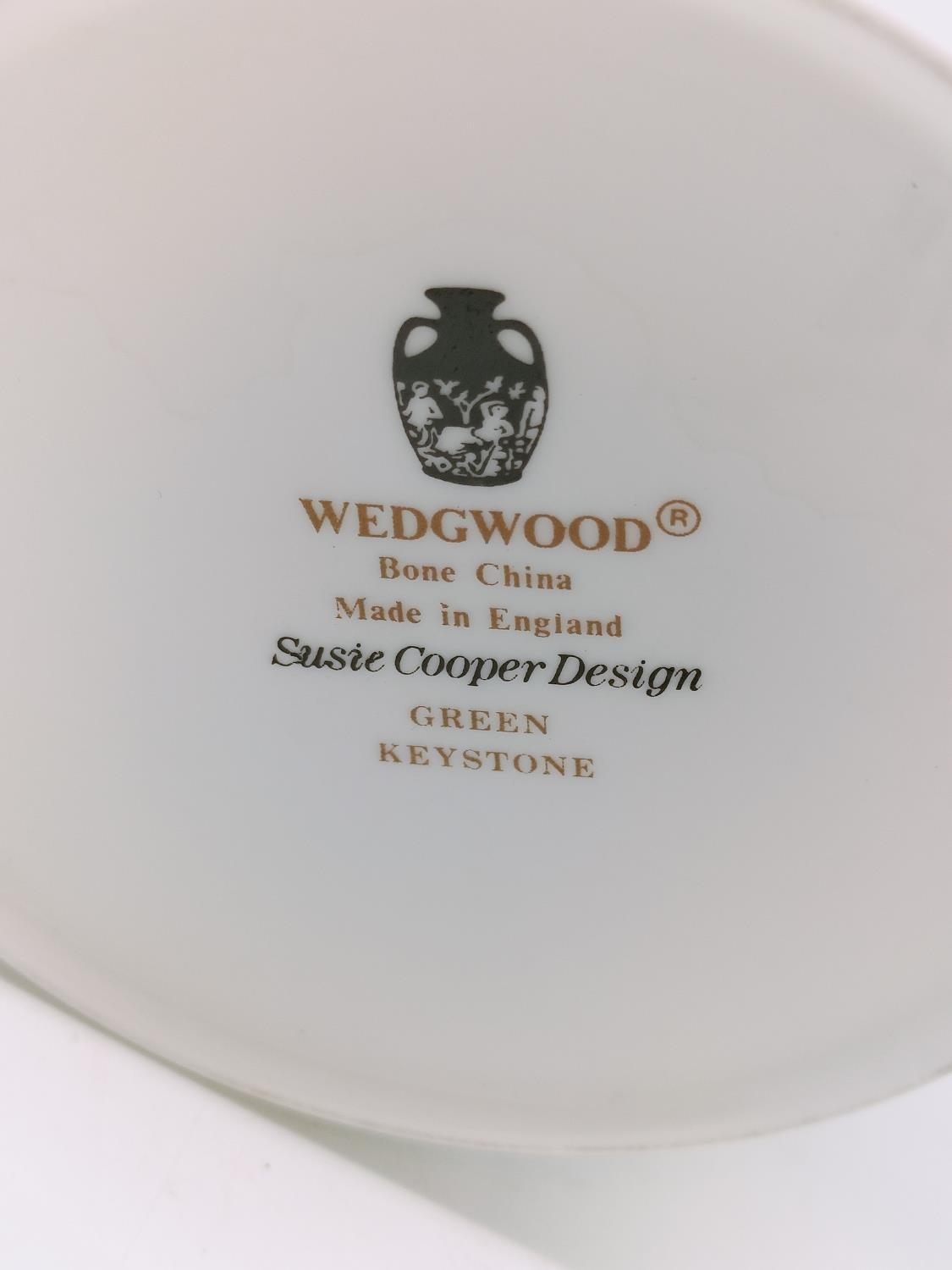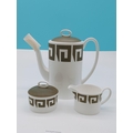 Susie Cooper Design for Wedgwood 21cm Coffee Pot, Lidded Sugar and Cream Jug in the 'Green Keystone' Pattern. Unused.
