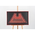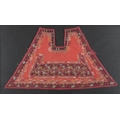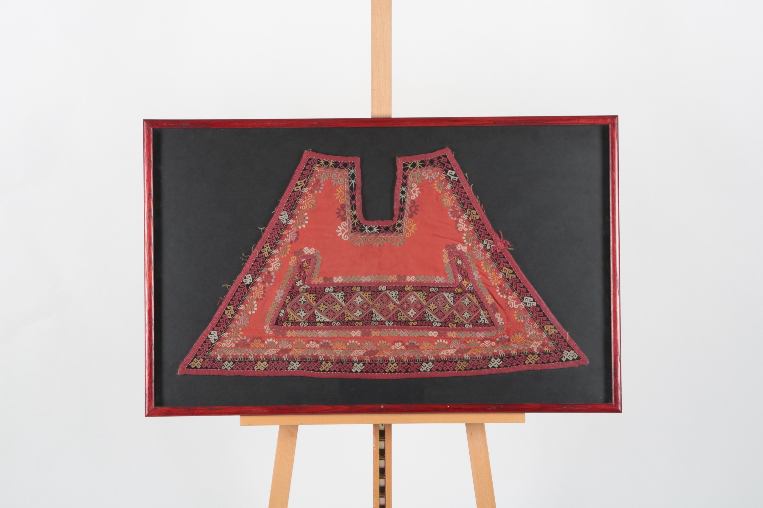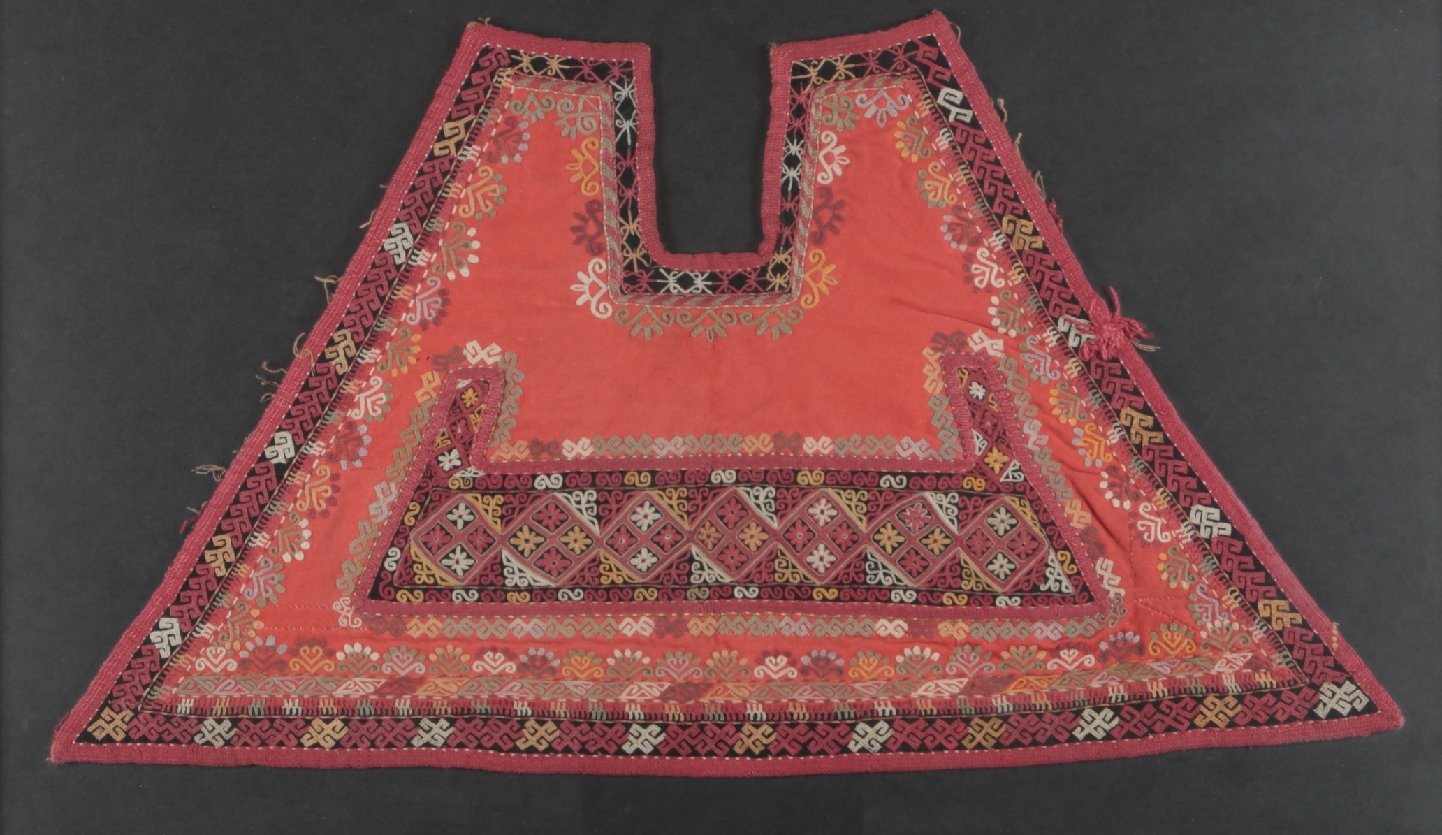 A late 19th century framed, young woman's Kiymeshek garment, of the Karakalpak people, Uzbekistan, embroidered in multicoloured silks in fine ornate chain stitched motifs on a red fabric ground, 80cm wide at base x 44cm high.