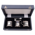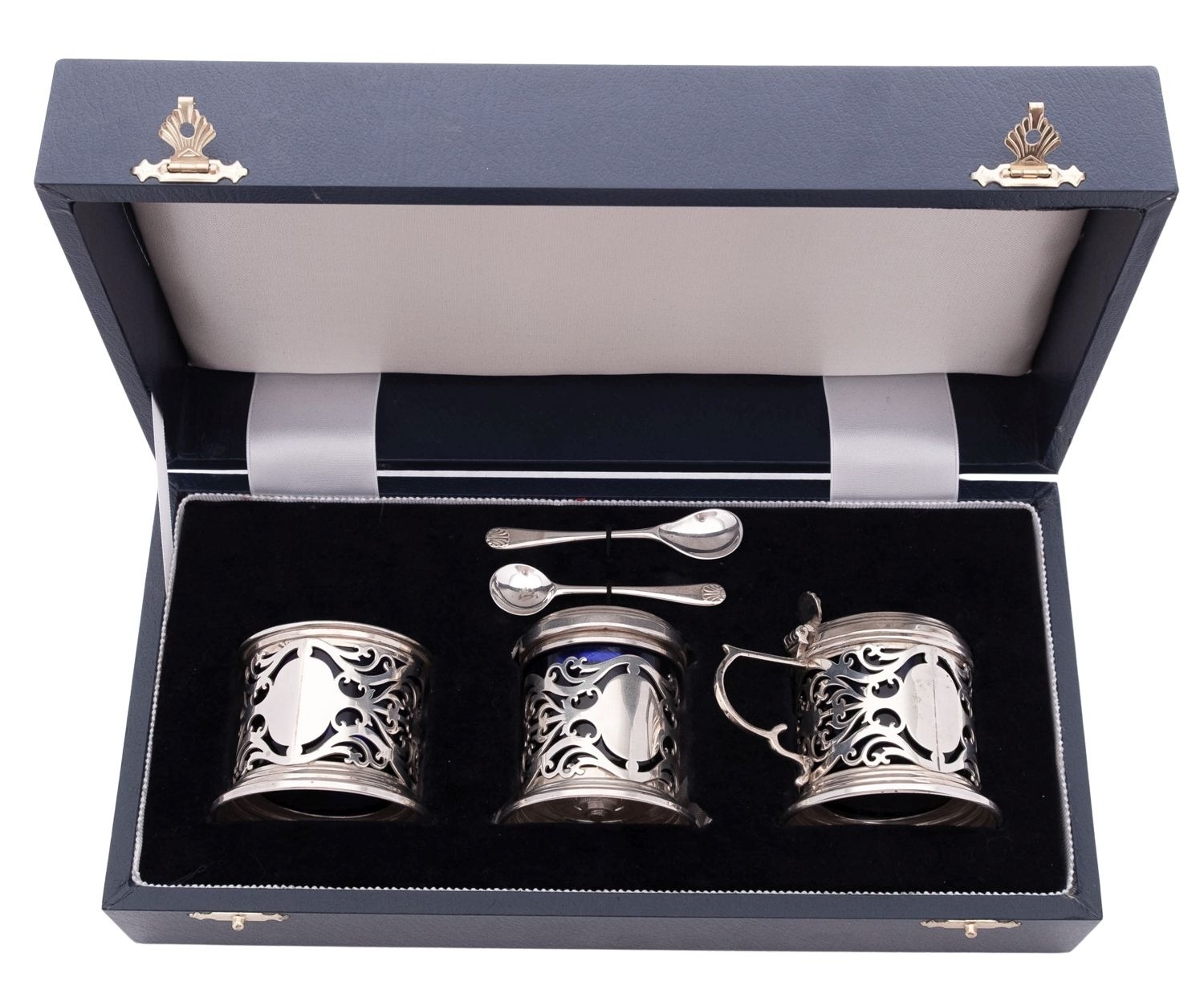 A modern cased three-piece silver condiment set, circular form, with pierced bodies and blue glass liners, with associated salt & mustard spoon, contained in original fitted box, by W.I Broadway & Co, Birmingham 1997; the case 10'' (25.3cm) long; 5.7ozt