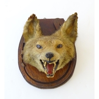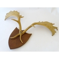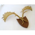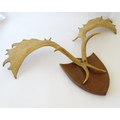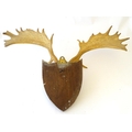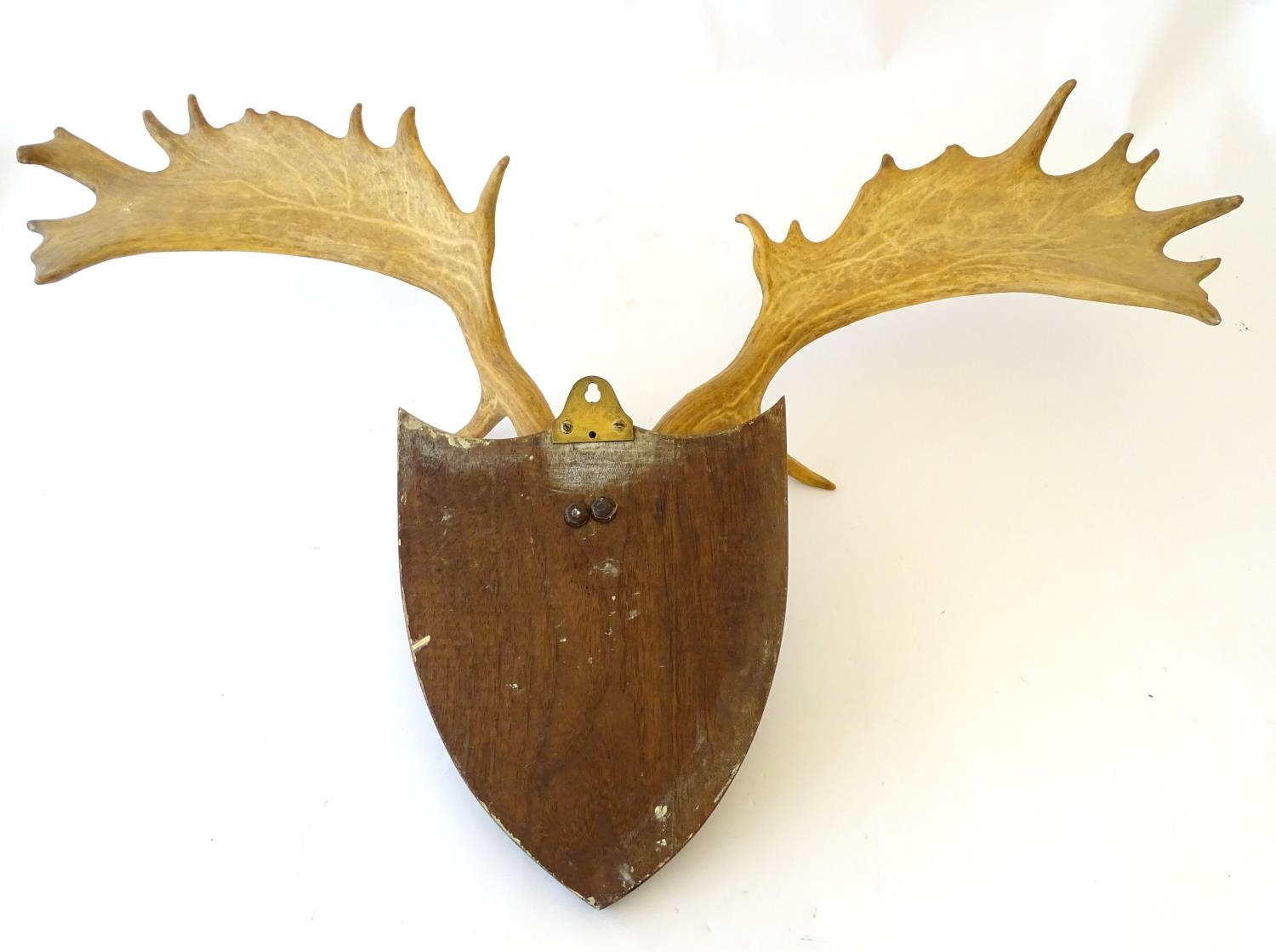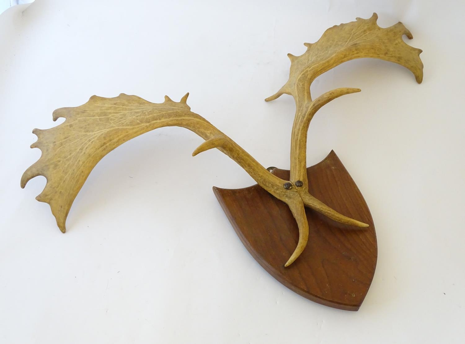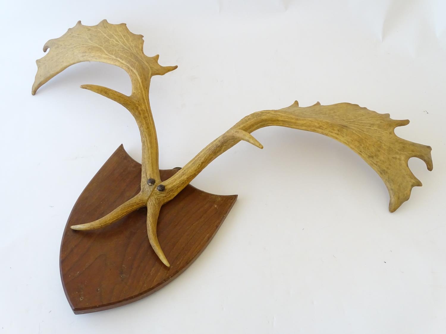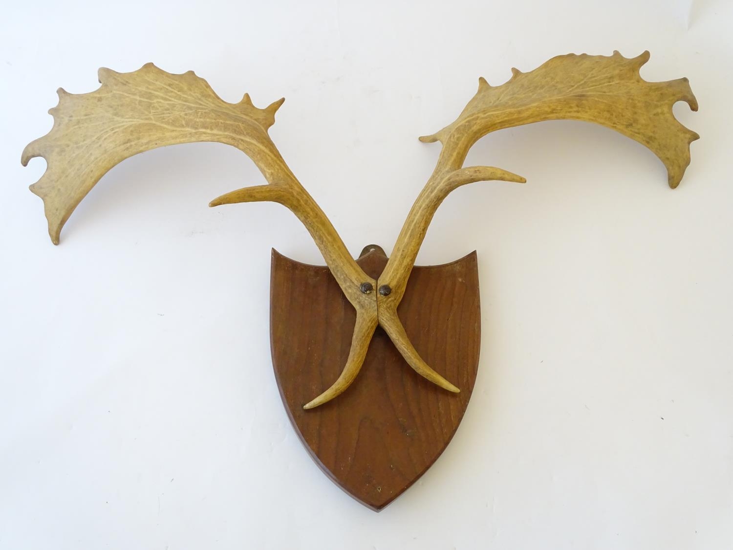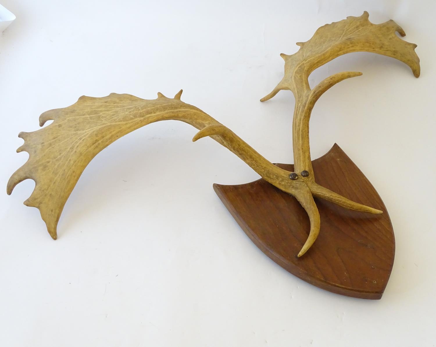 Taxidermy: a 20thC Continental mount of Fallow deer antlers, affixed to an oak shield plinth, 35" wide x 25" tall