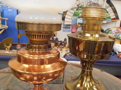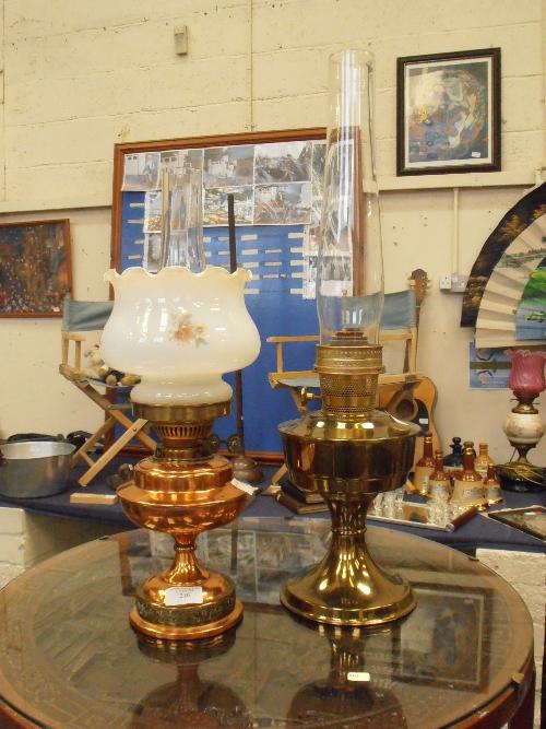 TWO OIL LAMPS BOTH WITH FUNNELS ONE WITH GLOBE SHADE