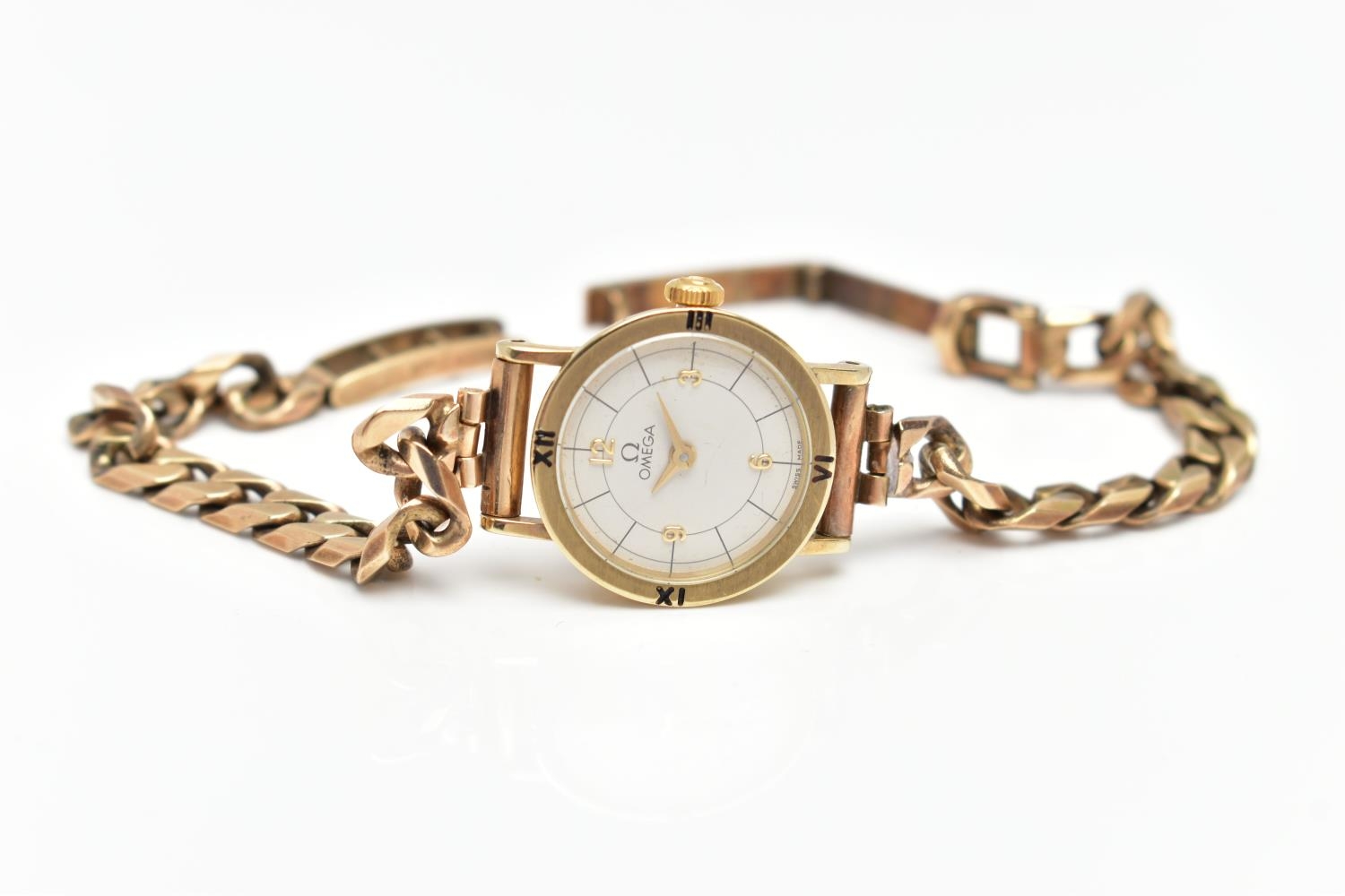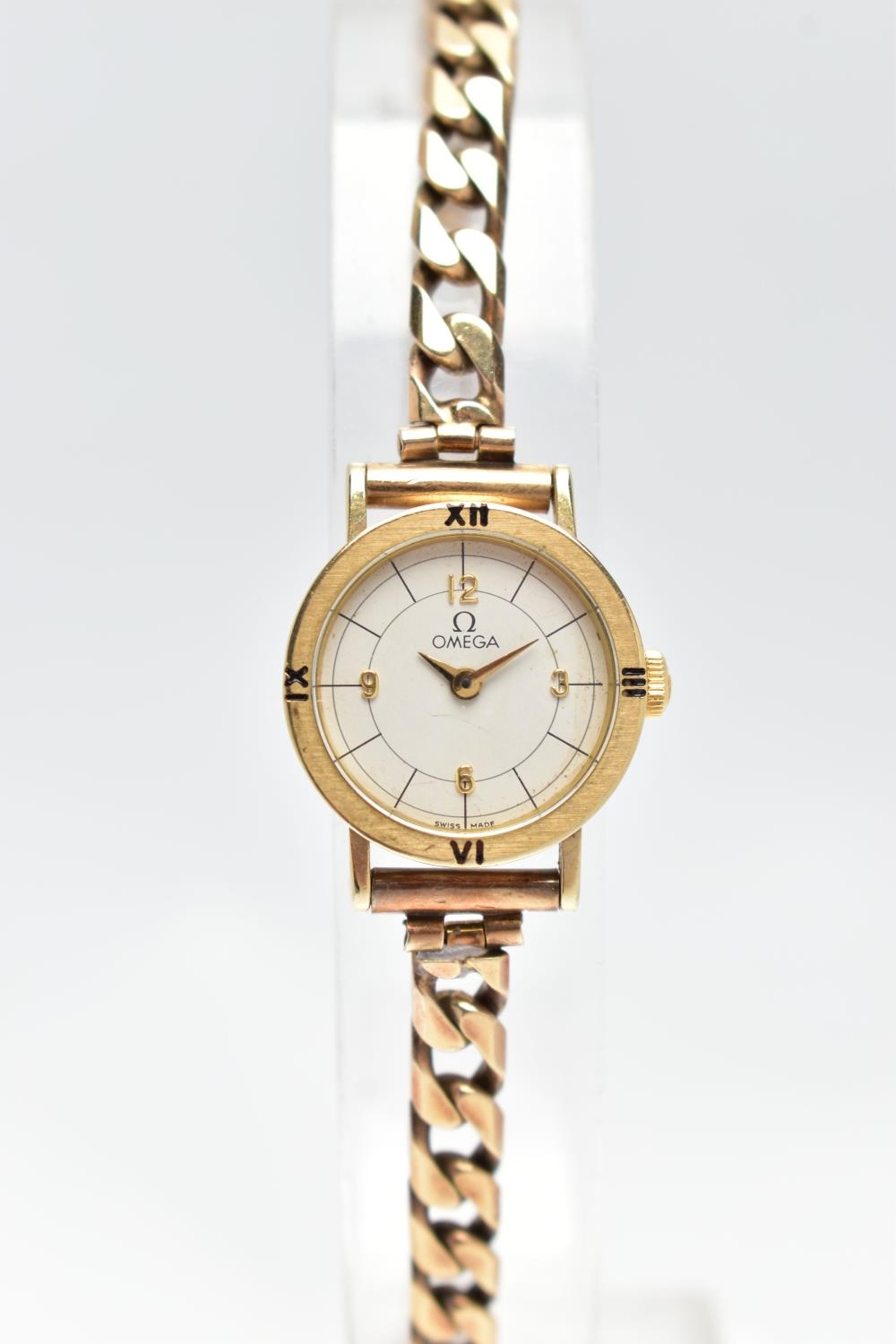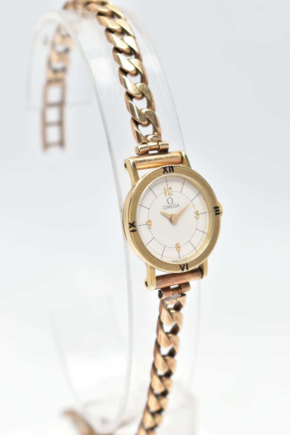 A LADIES 9CT GOLD 'OMEGA' QUARTZ WRISTWATCH, quartz movement, round white dial signed 'Omega', Arabic quarter numerals, interspaced with baton markers, gold hands, polished case, inside case back signed 'Omega Watch Co, 9K 375, 591101 FZ', movement stamped 'Swiss 6 jewels, 976.001', Roman quarter numerals to the bezel, approximate case width 10.8mm, fitted with a 9ct gold curb link bracelet with folding clasp, hallmarked 9ct London 1987, length 190mm, approximate gross weight without movement 16.9 grams (condition report: watch winds, sets and runs at time of cataloguing, time keeping is untested, general light wear, clasp in working order)