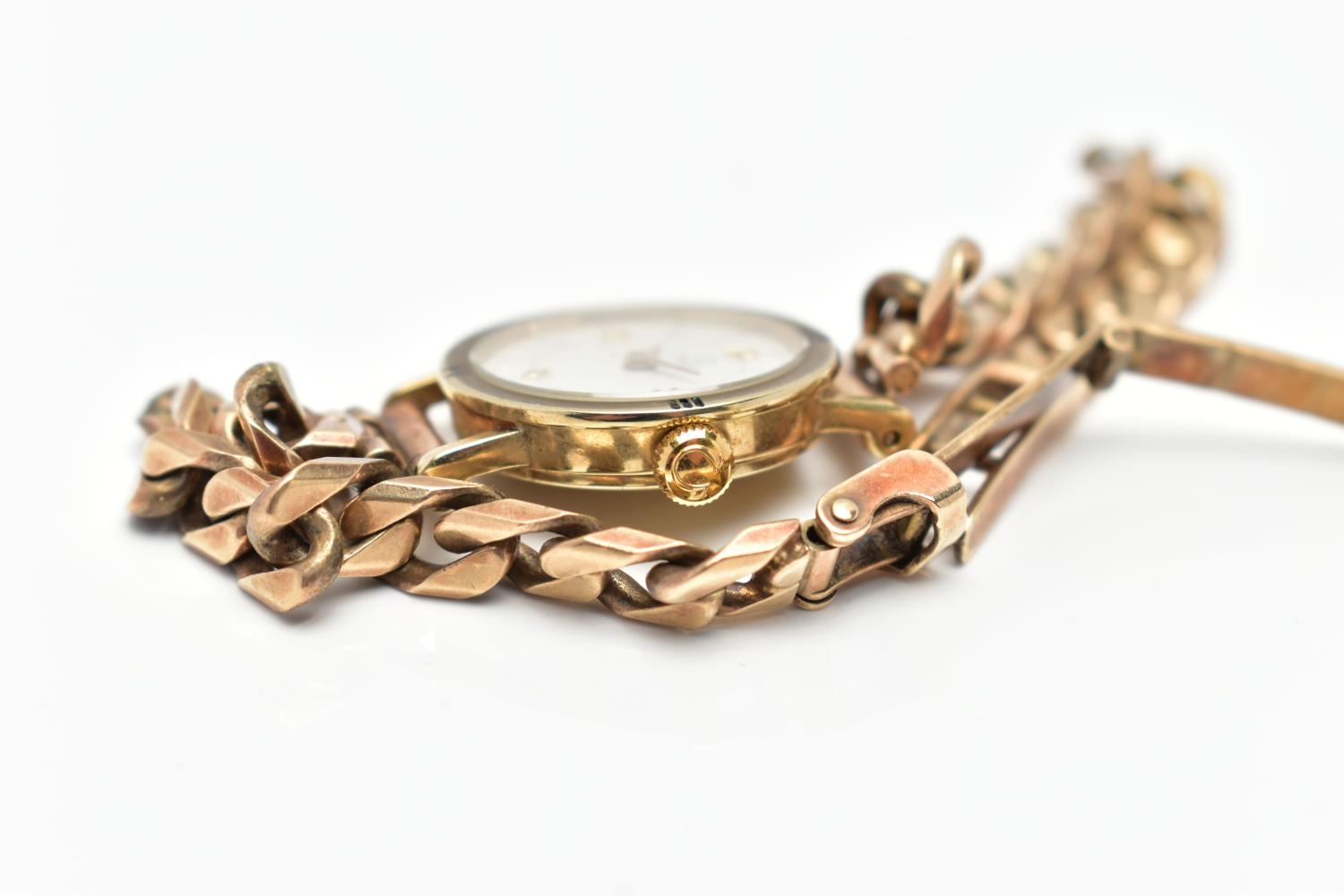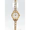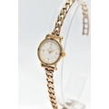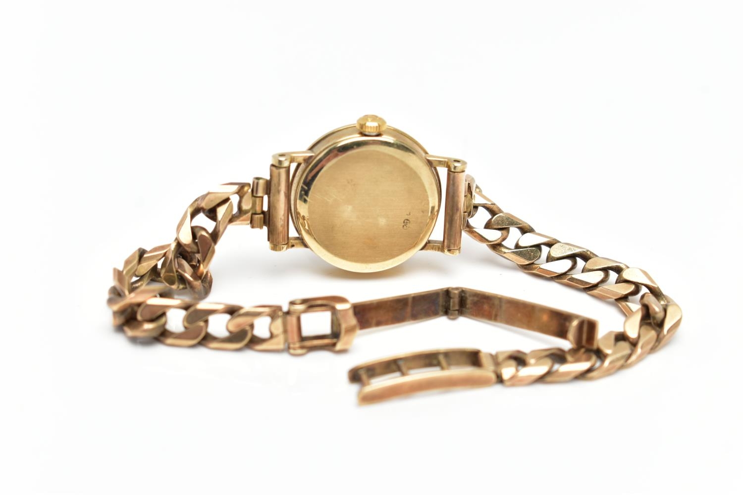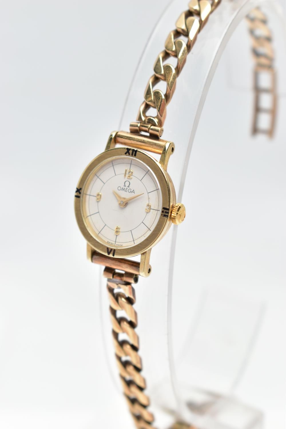A LADIES 9CT GOLD 'OMEGA' QUARTZ WRISTWATCH, quartz movement, round white dial signed 'Omega', Arabic quarter numerals, interspaced with baton markers, gold hands, polished case, inside case back signed 'Omega Watch Co, 9K 375, 591101 FZ', movement stamped 'Swiss 6 jewels, 976.001', Roman quarter numerals to the bezel, approximate case width 10.8mm, fitted with a 9ct gold curb link bracelet with folding clasp, hallmarked 9ct London 1987, length 190mm, approximate gross weight without movement 16.9 grams (condition report: watch winds, sets and runs at time of cataloguing, time keeping is untested, general light wear, clasp in working order)