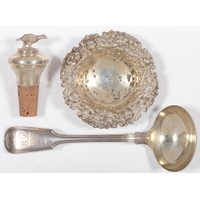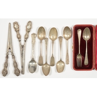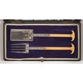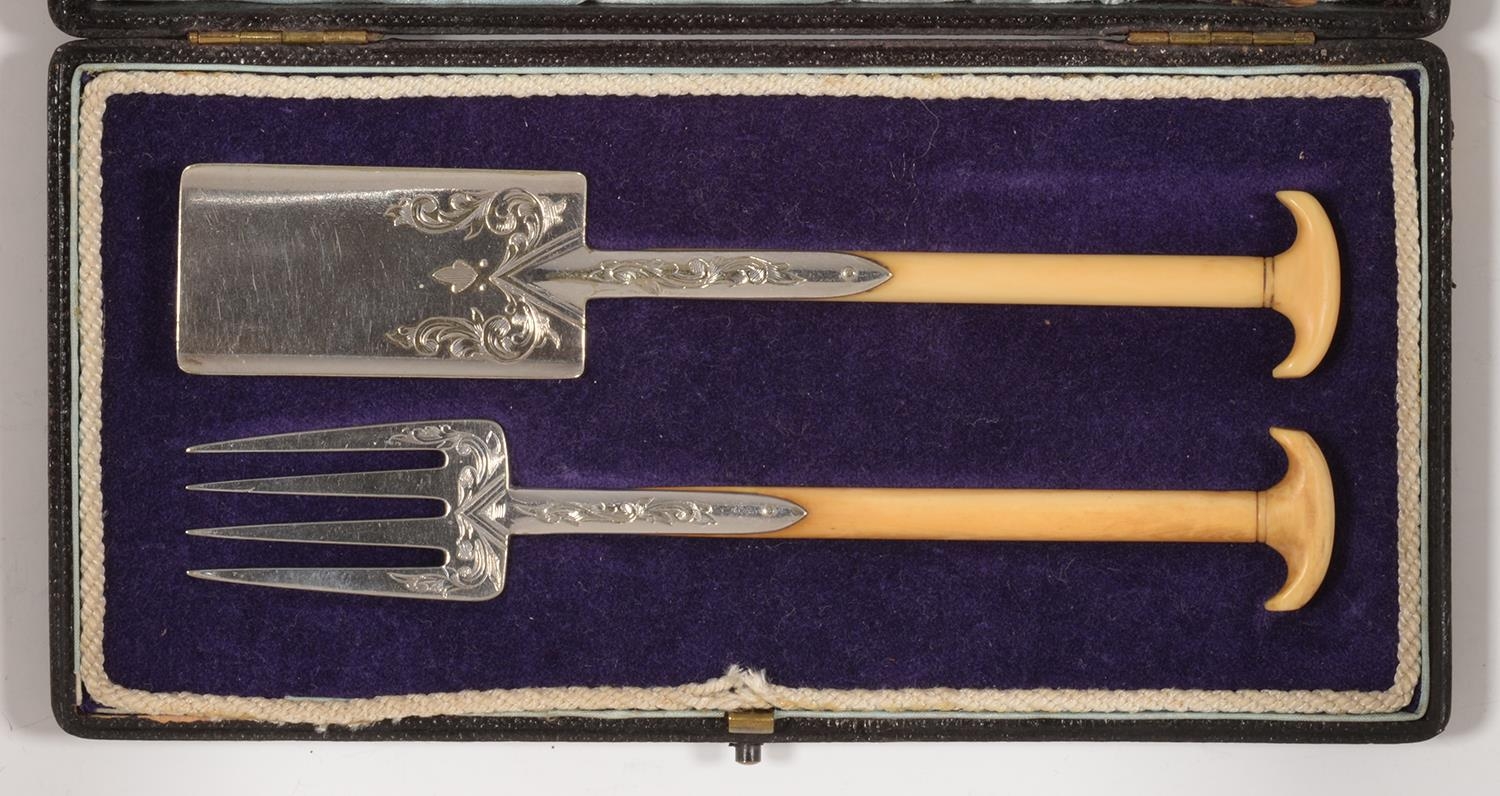 A PAIR OF VICTORIAN EPNS GARDENER’S FORK AND SPADE NOVELTY SARDINE SERVERS, BONE HANDLED, 14CM L, MAKER A.B/M, CASED