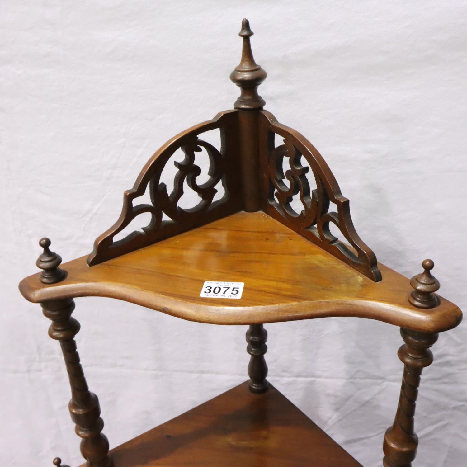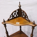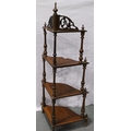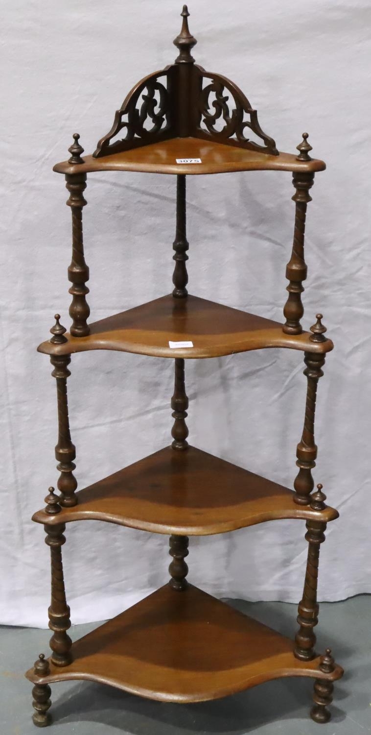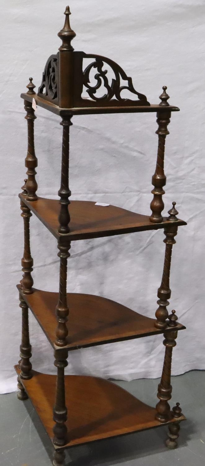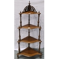 Victorian four tier corner etagere, with turned supports and pierced frets, H: 131 cm. Not available for in-house P&P, contact Paul O'Hea at Mailboxes on 01925 659133