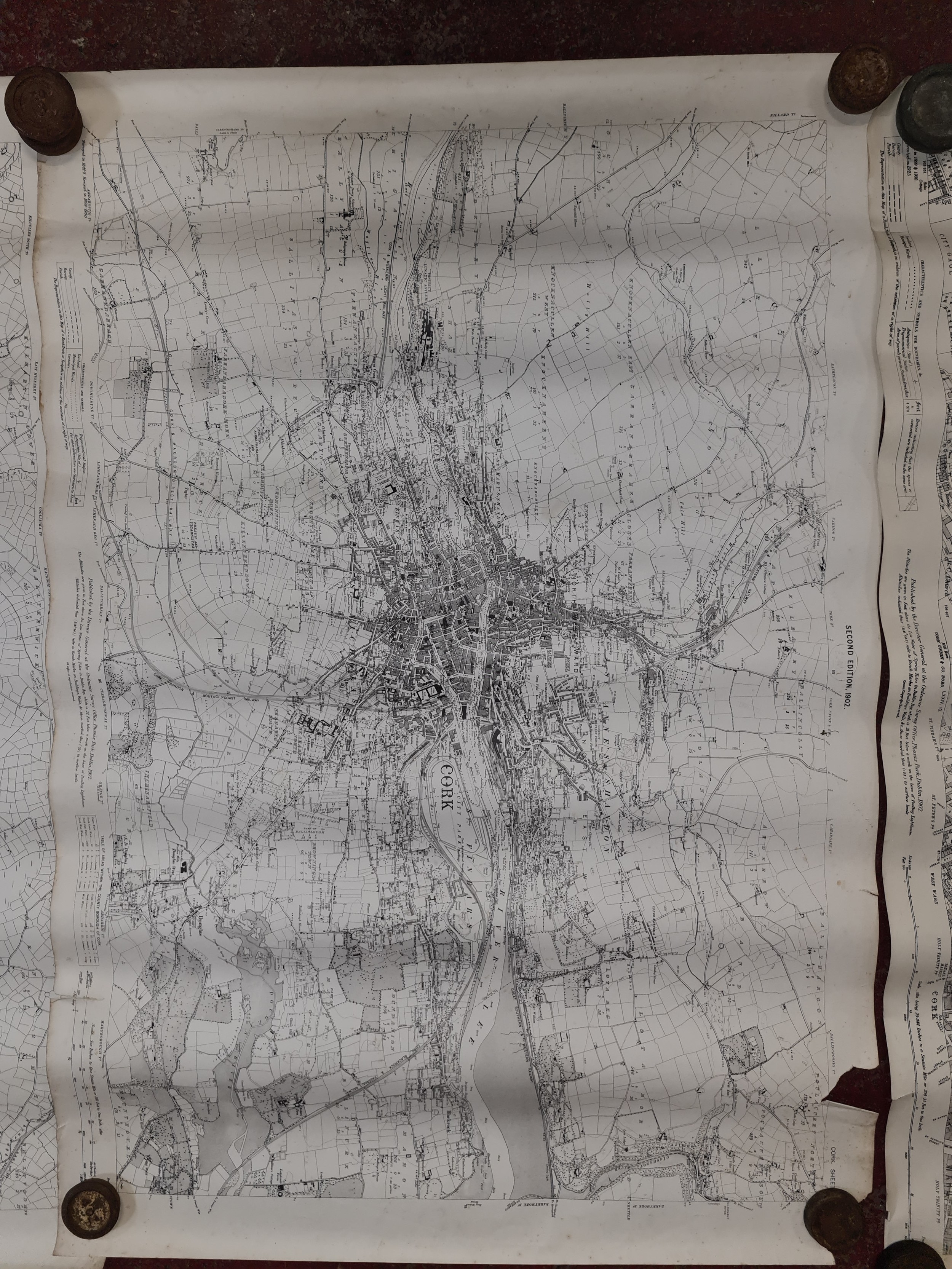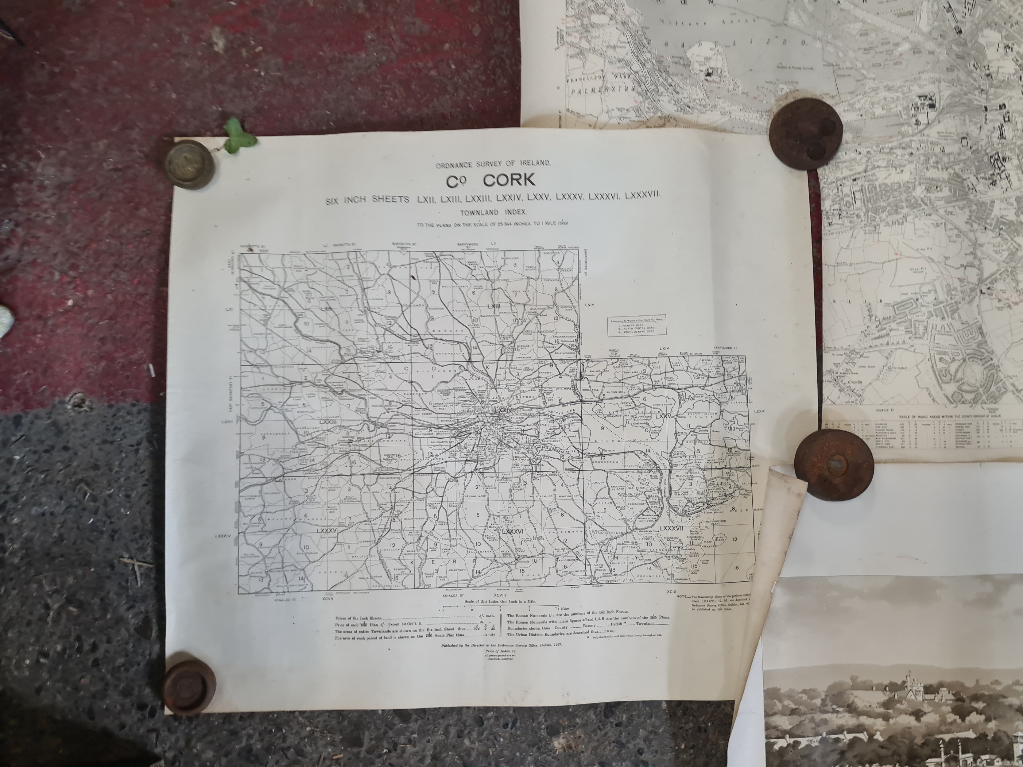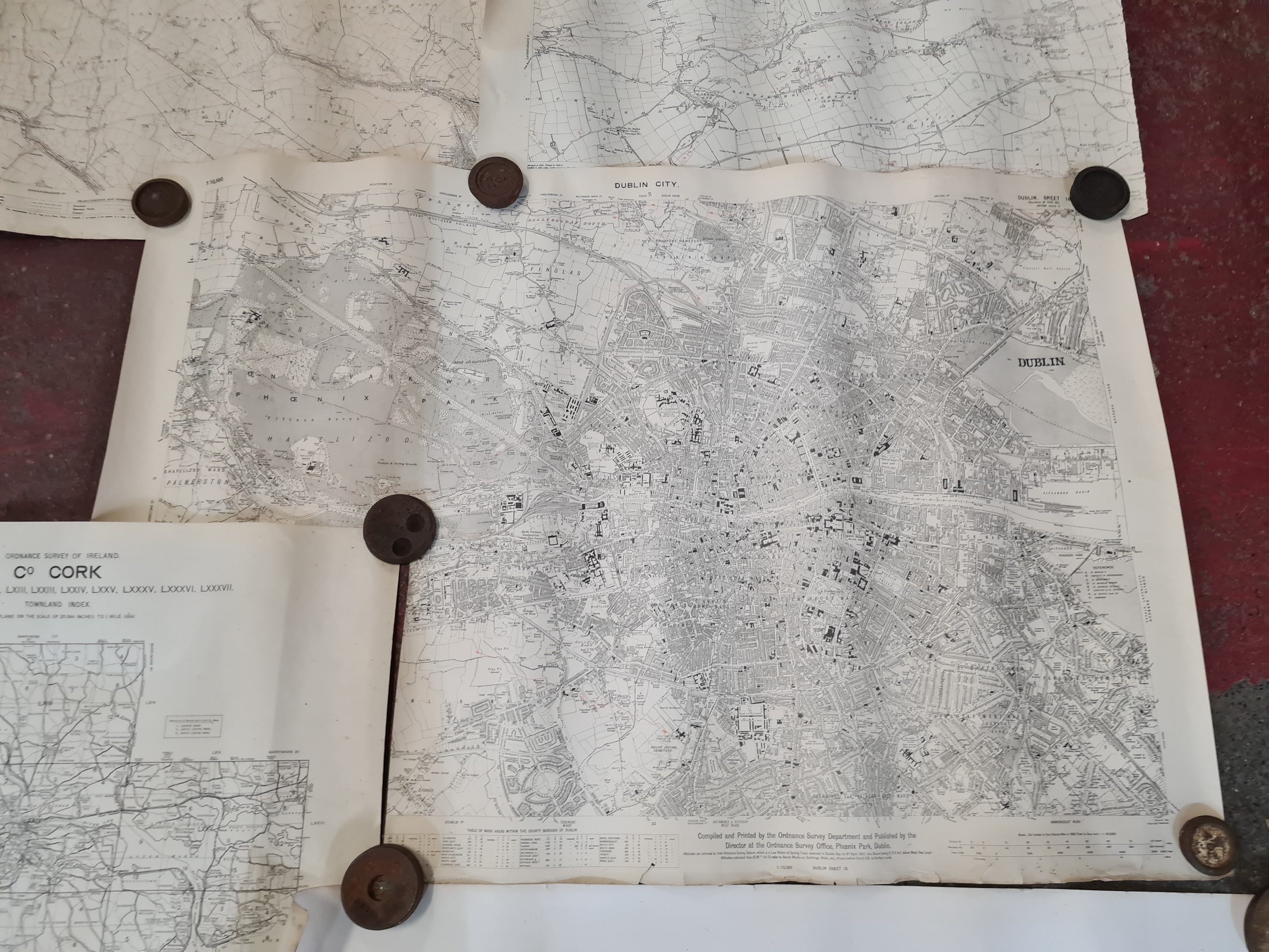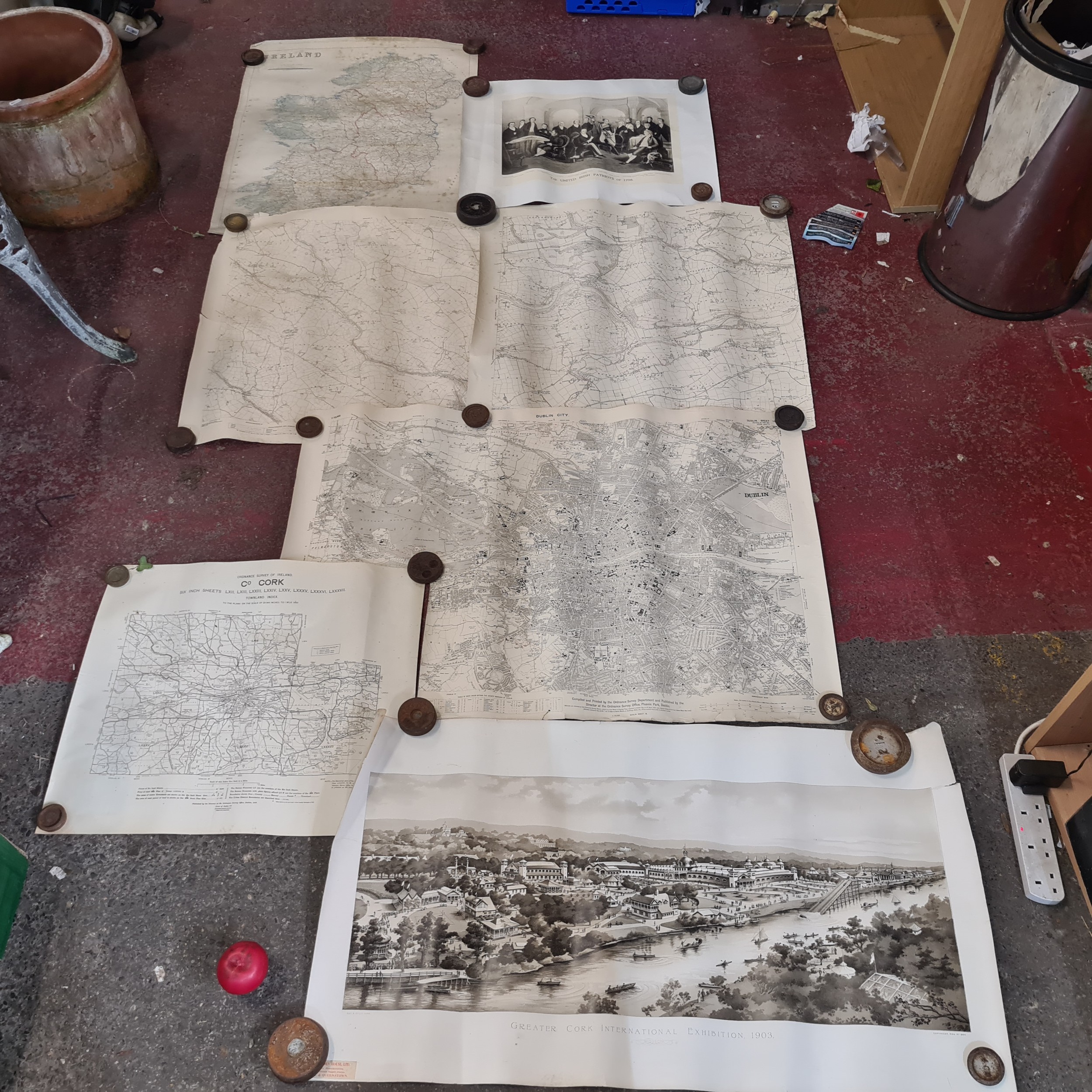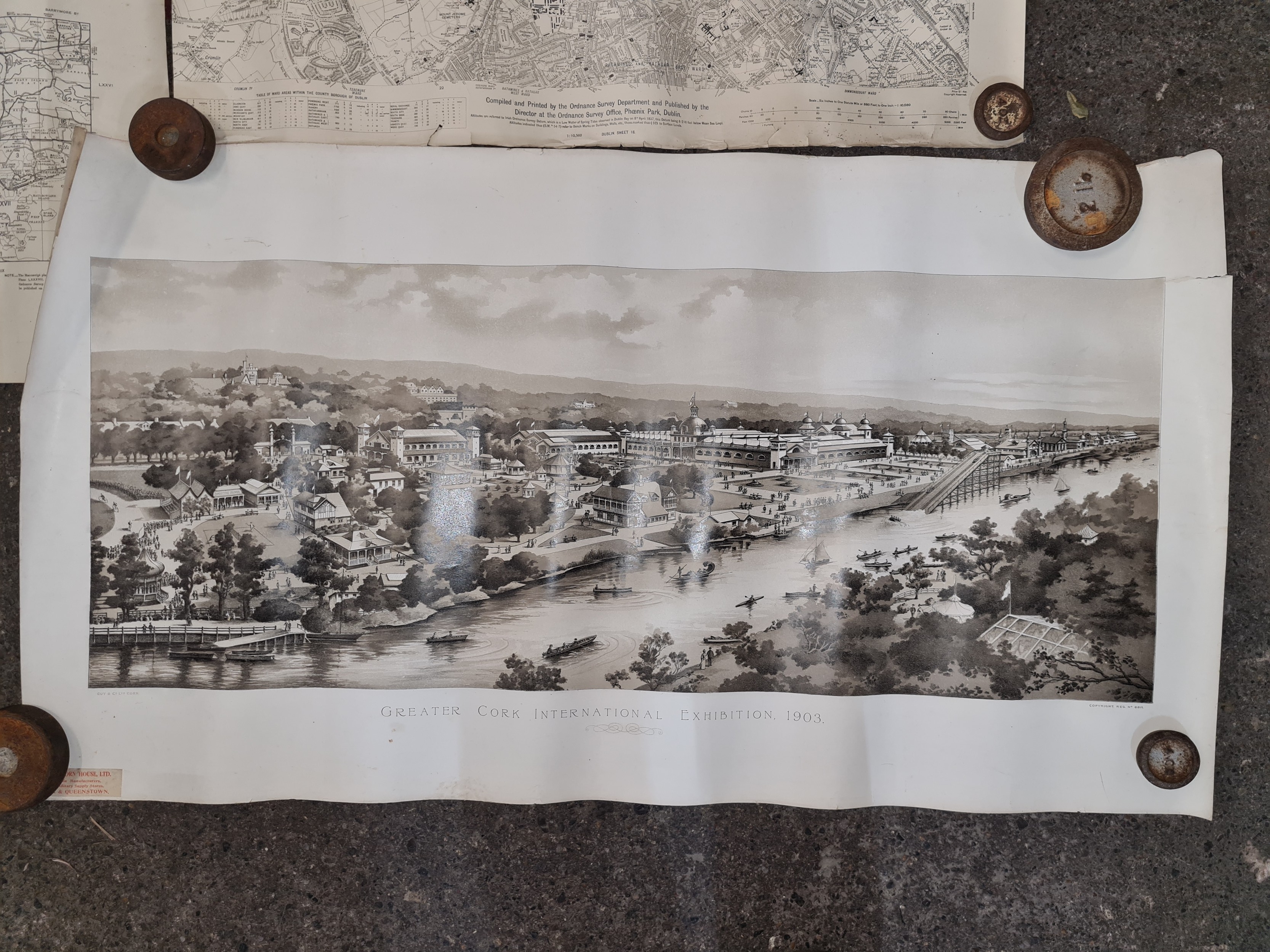 Seven antique Irish maps and photographs, including an ordnance survey map of county Cork, An ordonnance survey of Dublin City, a print of The Cork International exhibition 1903 etc. All in very good condition and collector's sought after as collector items in antiques.