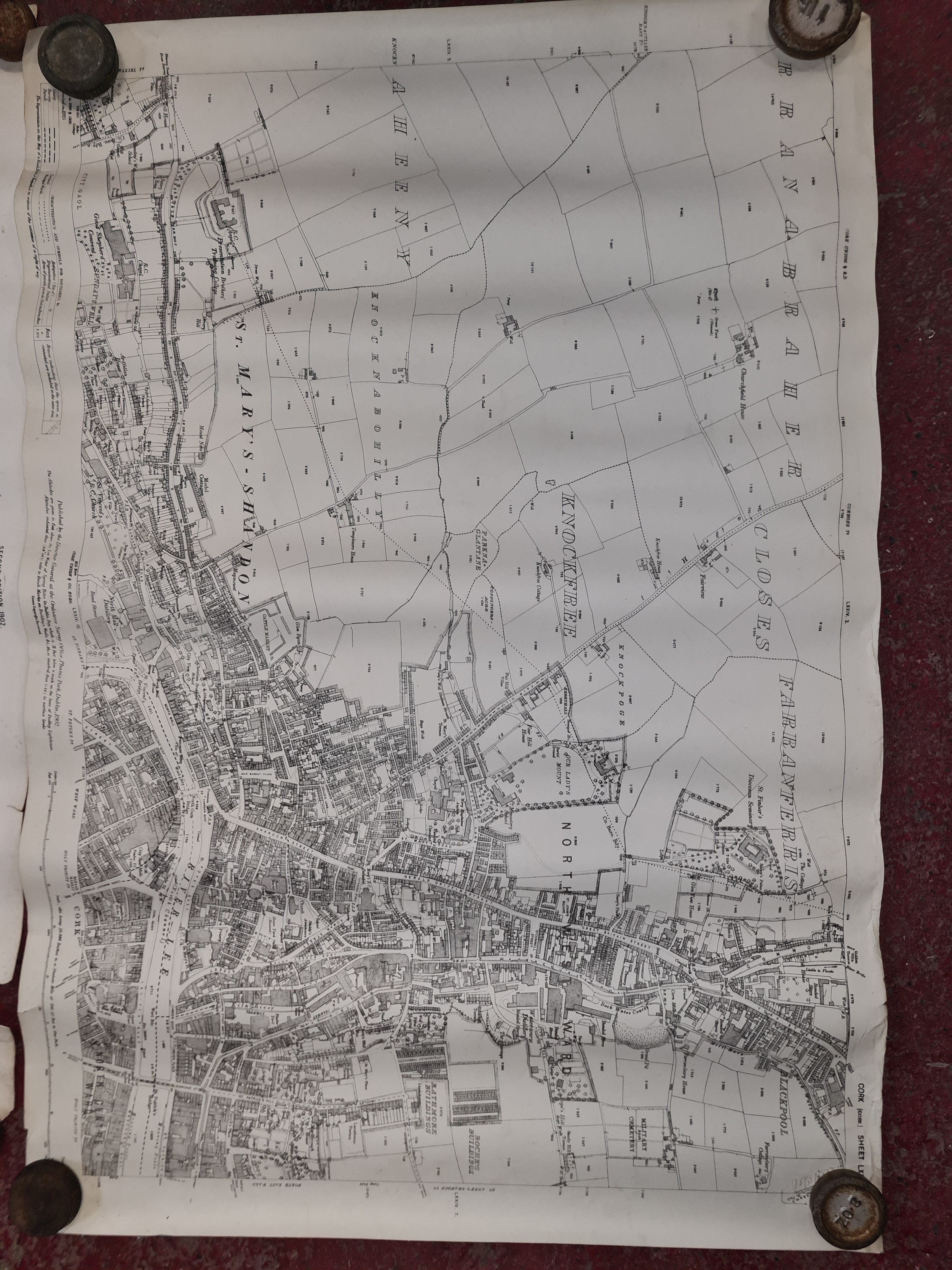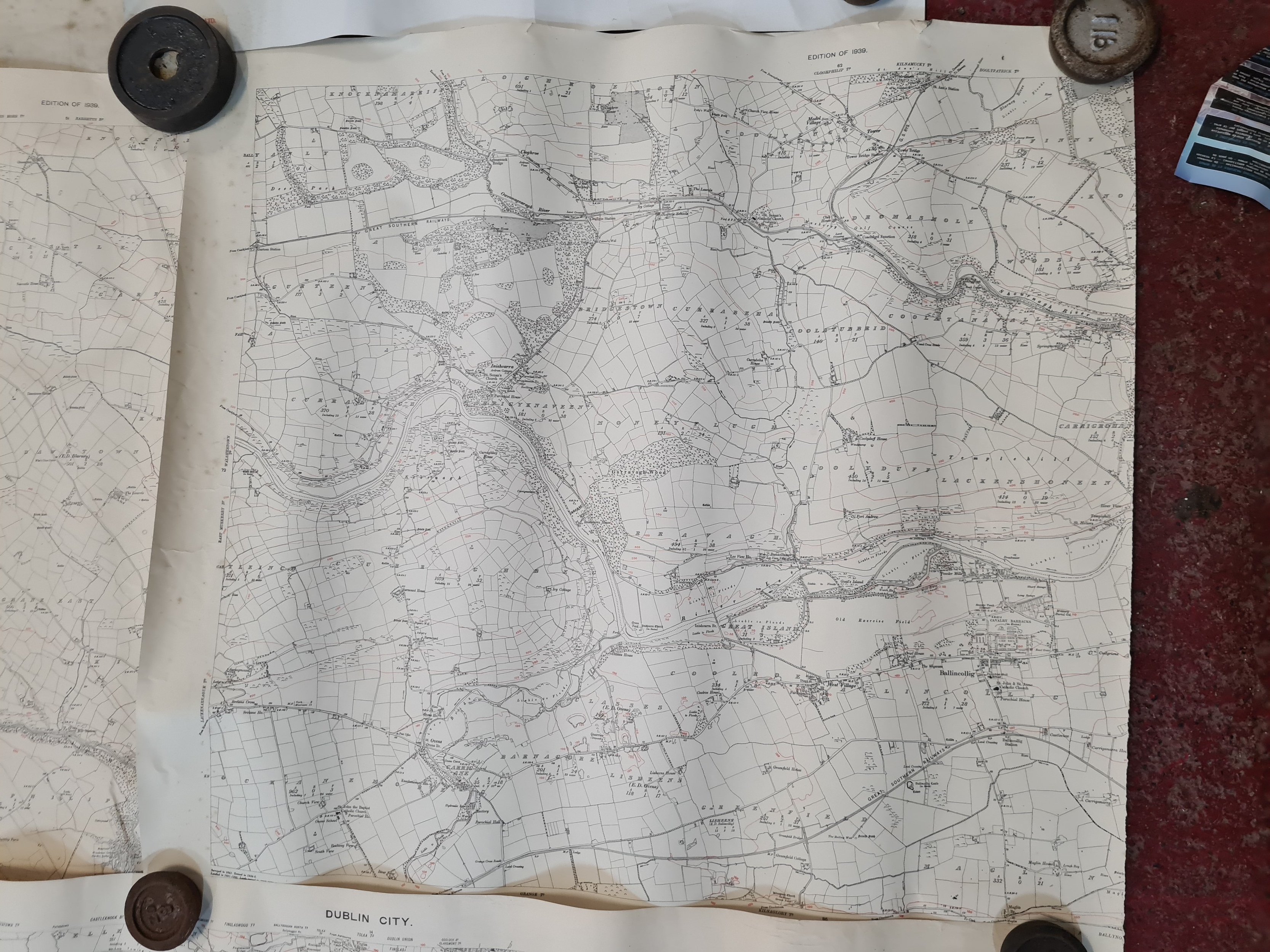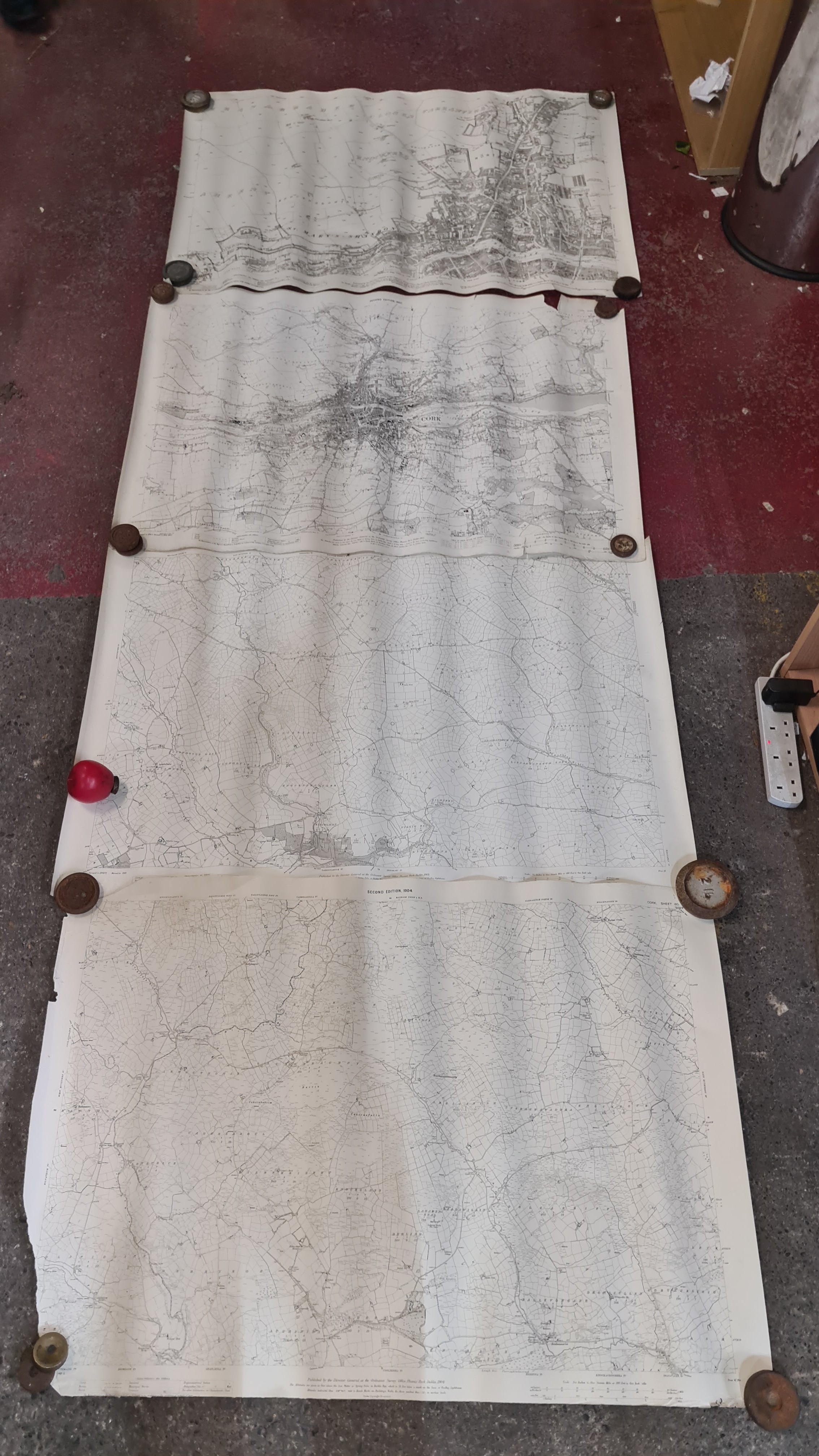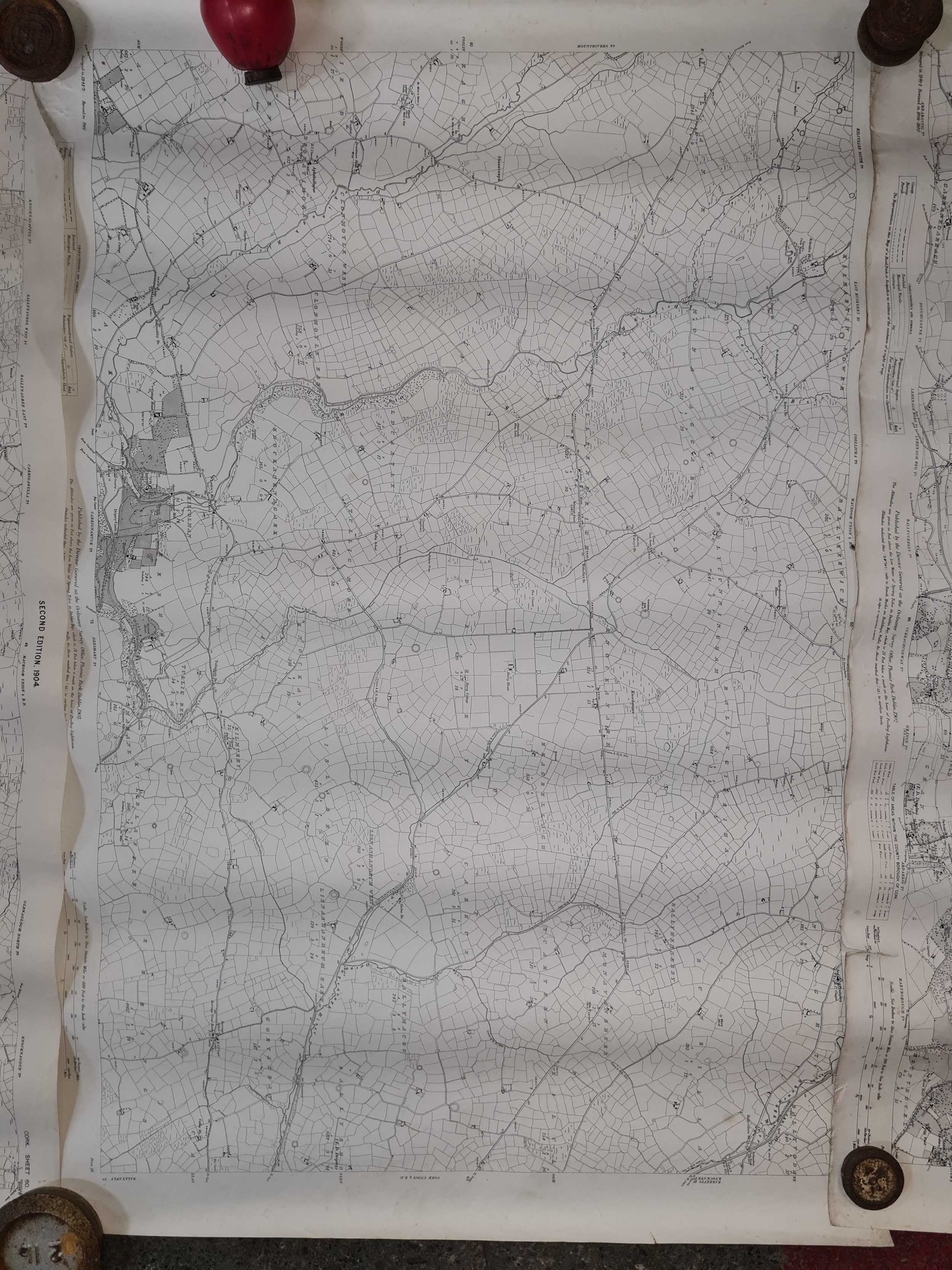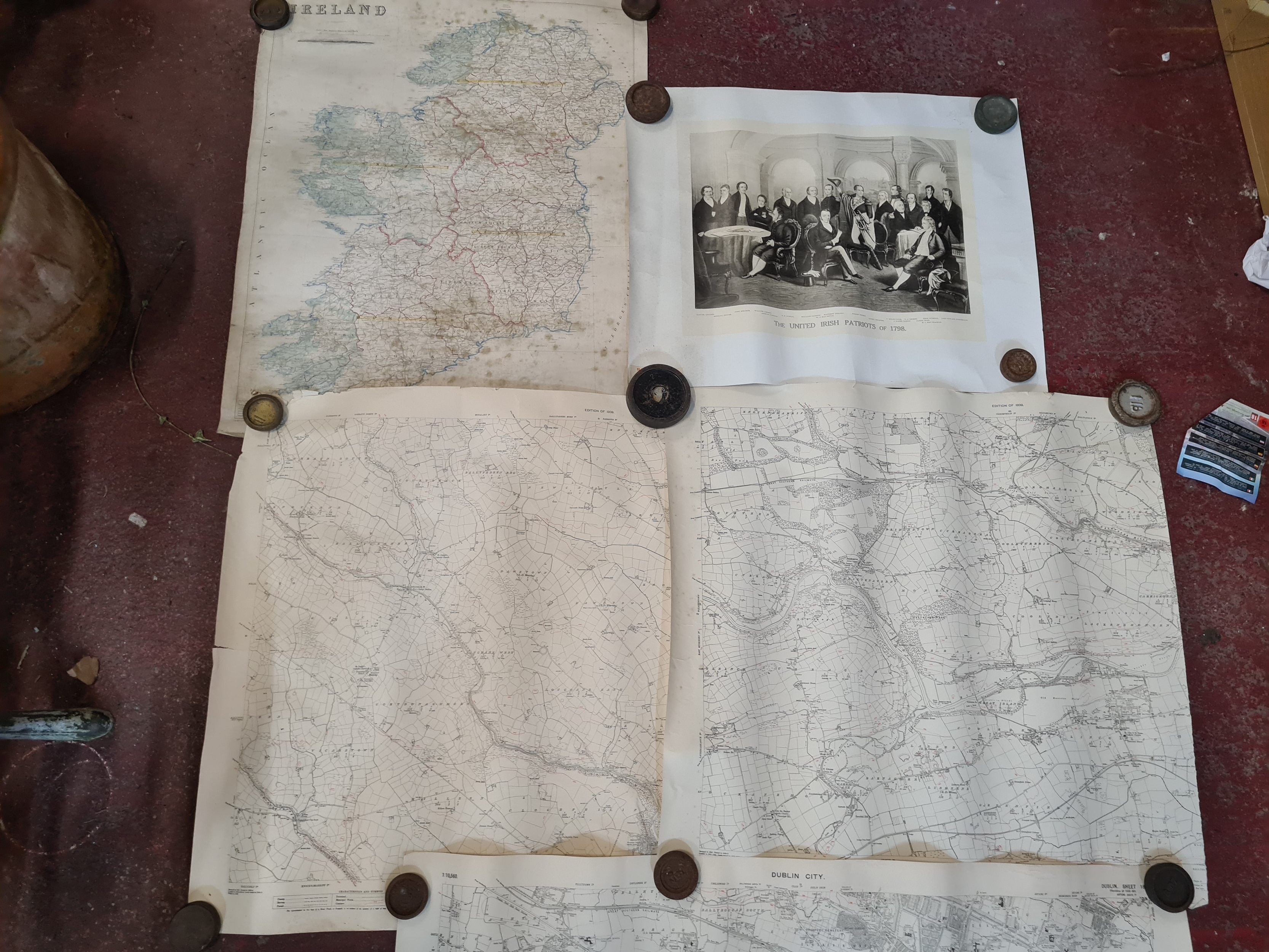 Seven antique Irish maps and photographs, including an ordnance survey map of county Cork, An ordonnance survey of Dublin City, a print of The Cork International exhibition 1903 etc. All in very good condition and collector's sought after as collector items in antiques.