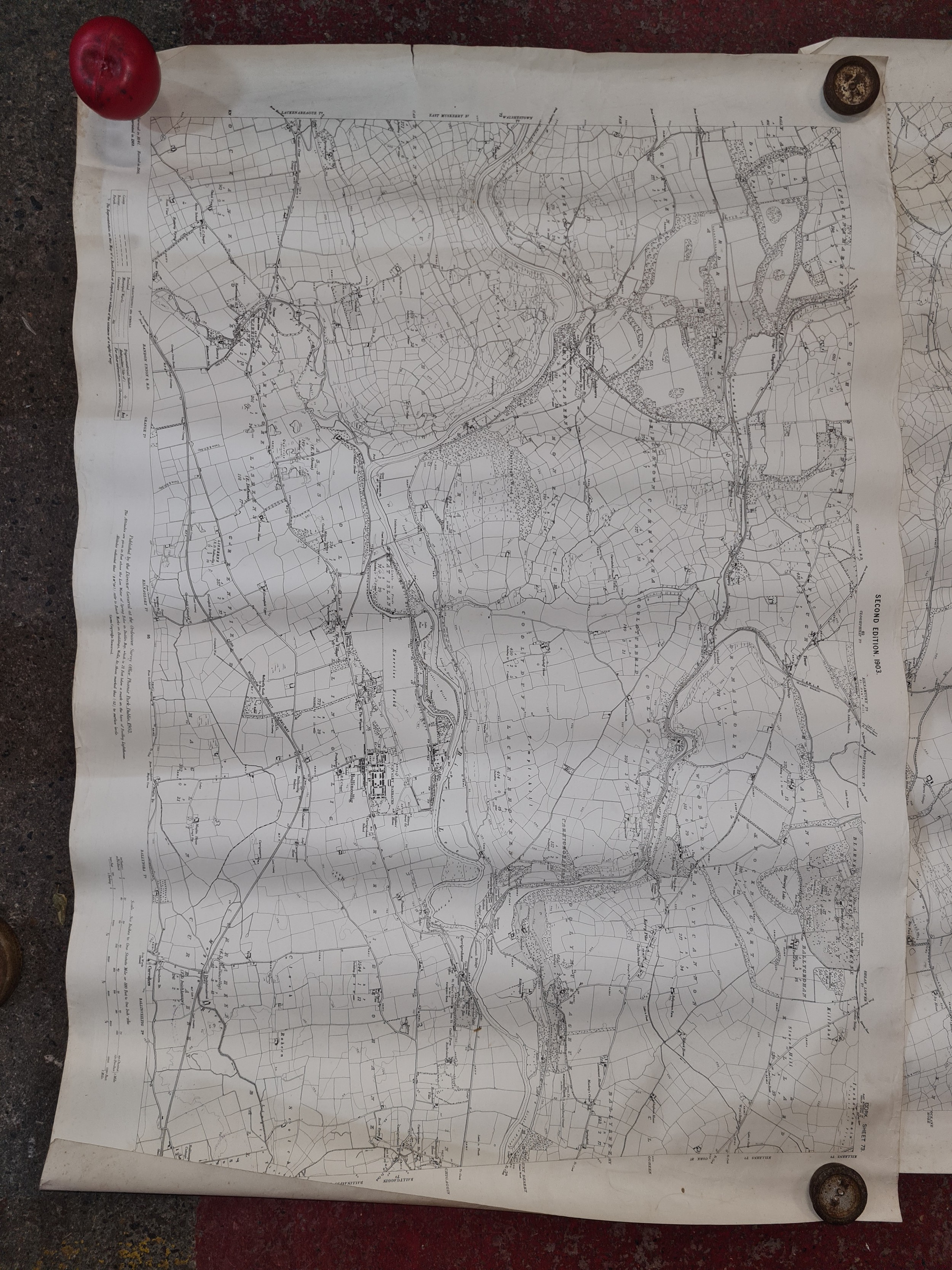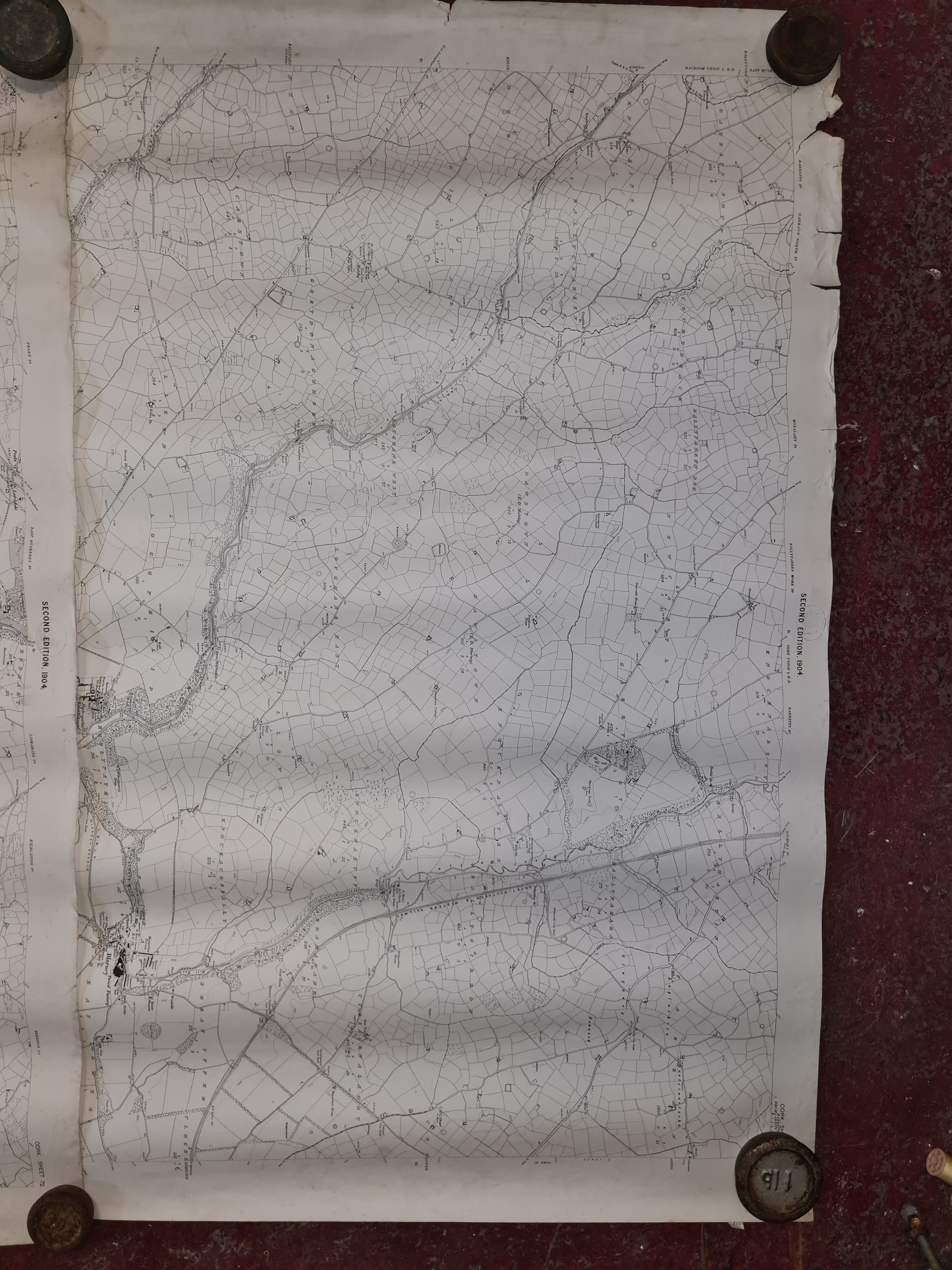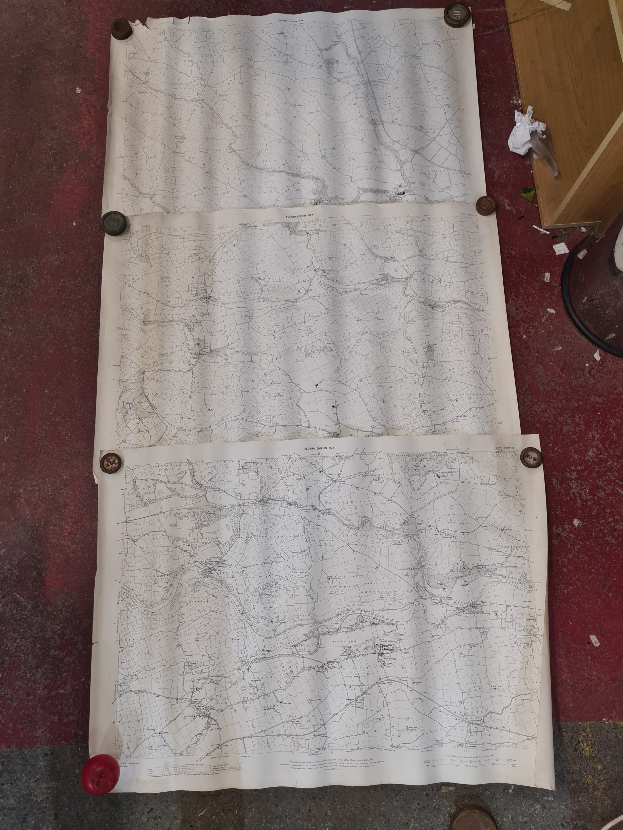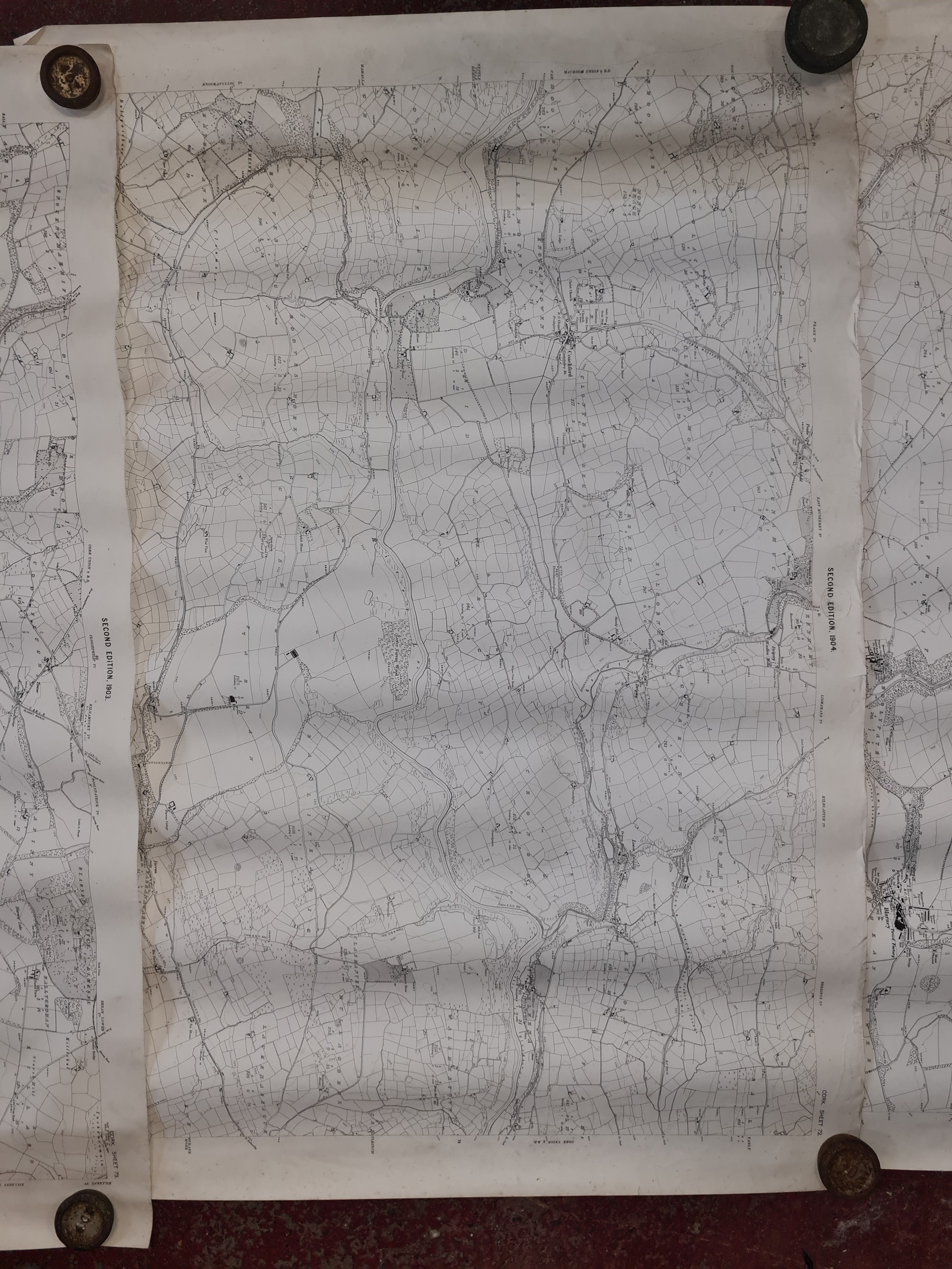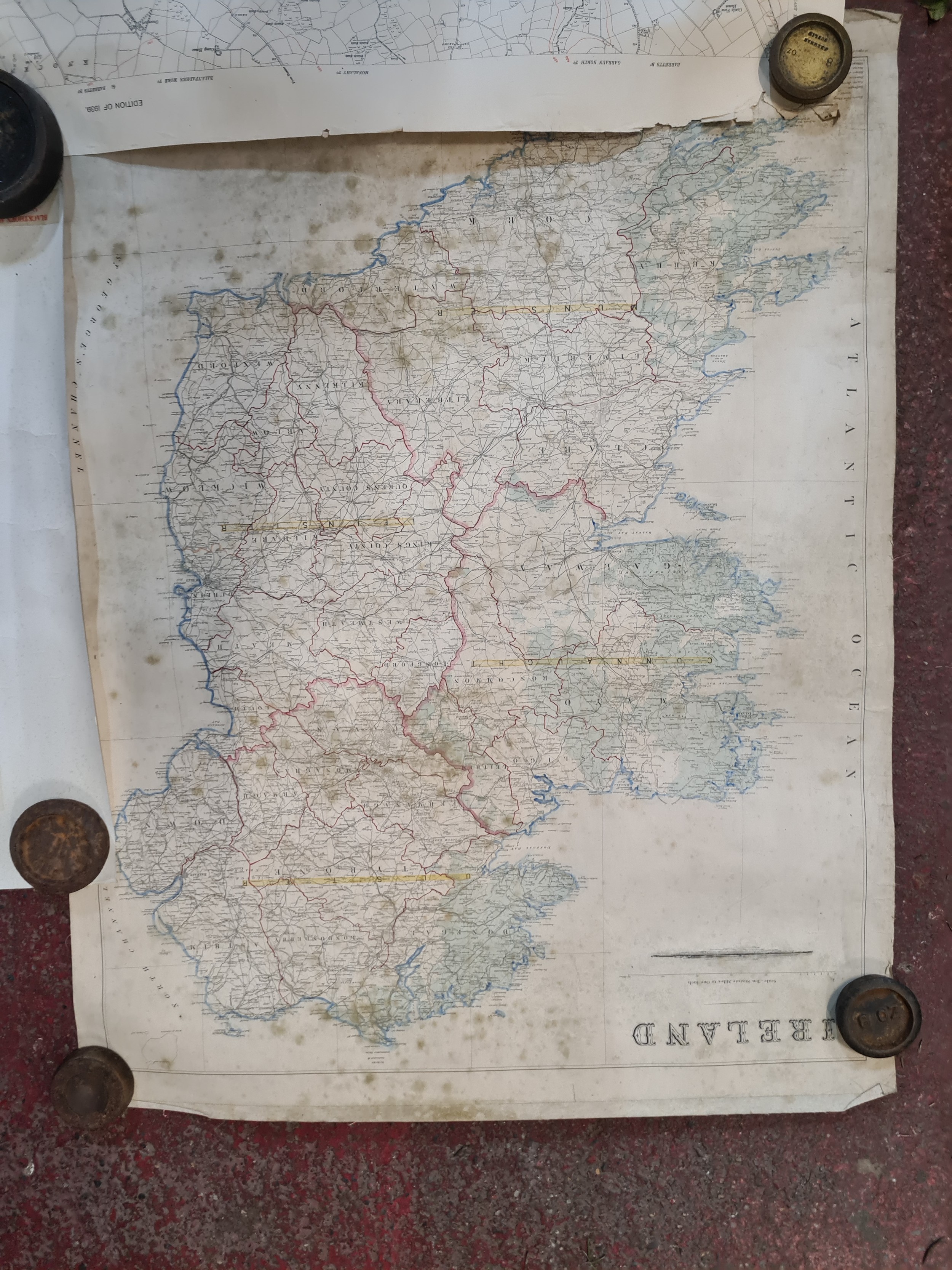 Seven antique Irish maps and photographs, including an ordnance survey map of county Cork, An ordonnance survey of Dublin City, a print of The Cork International exhibition 1903 etc. All in very good condition and collector's sought after as collector items in antiques.