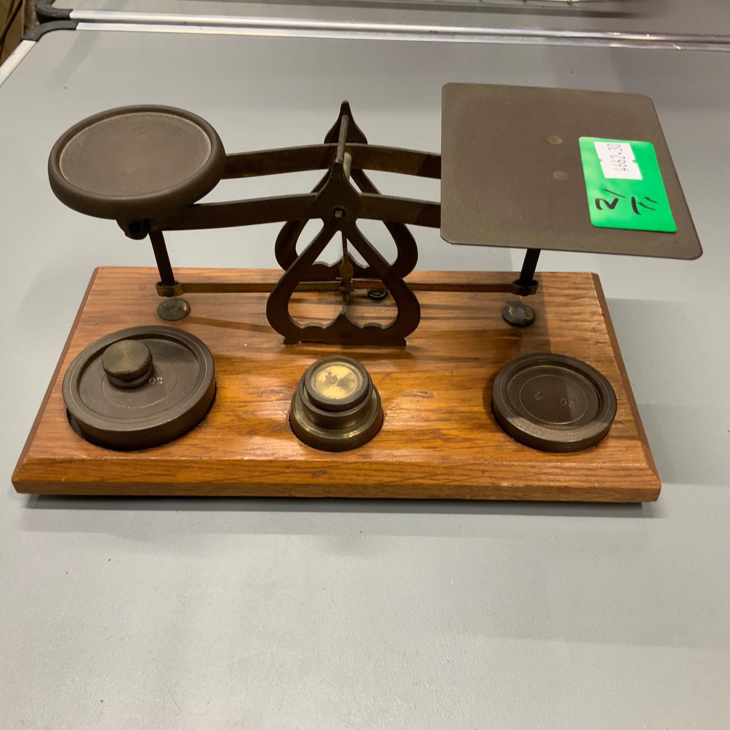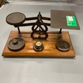 A set of vintage brass postage scales and weights.