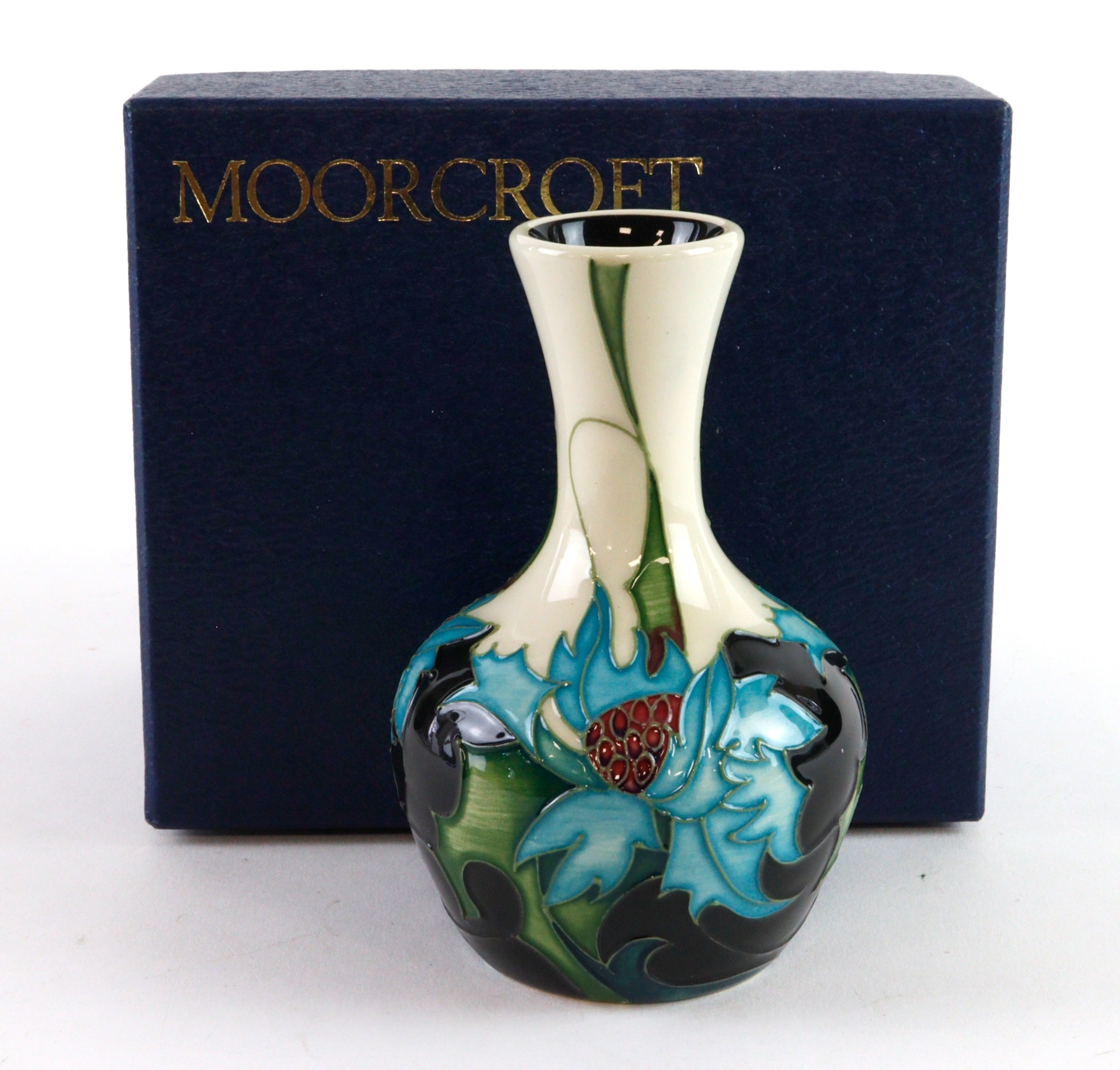 Moorcroft 'Sea Holly' pattern vase, dated 2006, makers marks to base, height 10cm approx., contained in a Moorcroft box