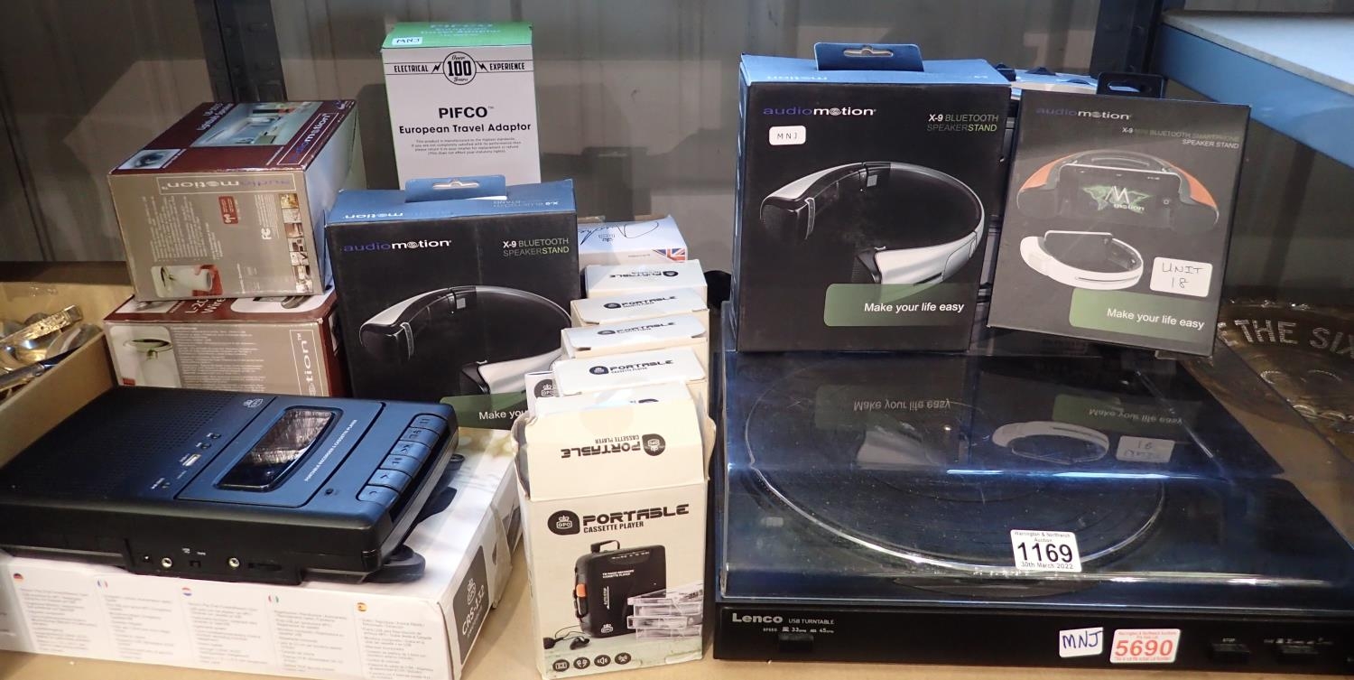 Mixed electrical items including Lenco electrical turntable, Bluetooth speakers, cassette players, cassette radios, box of 20 travel adaptors and other items. Not available for in-house P&P, contact Paul O'Hea at Mailboxes on 01925 659133