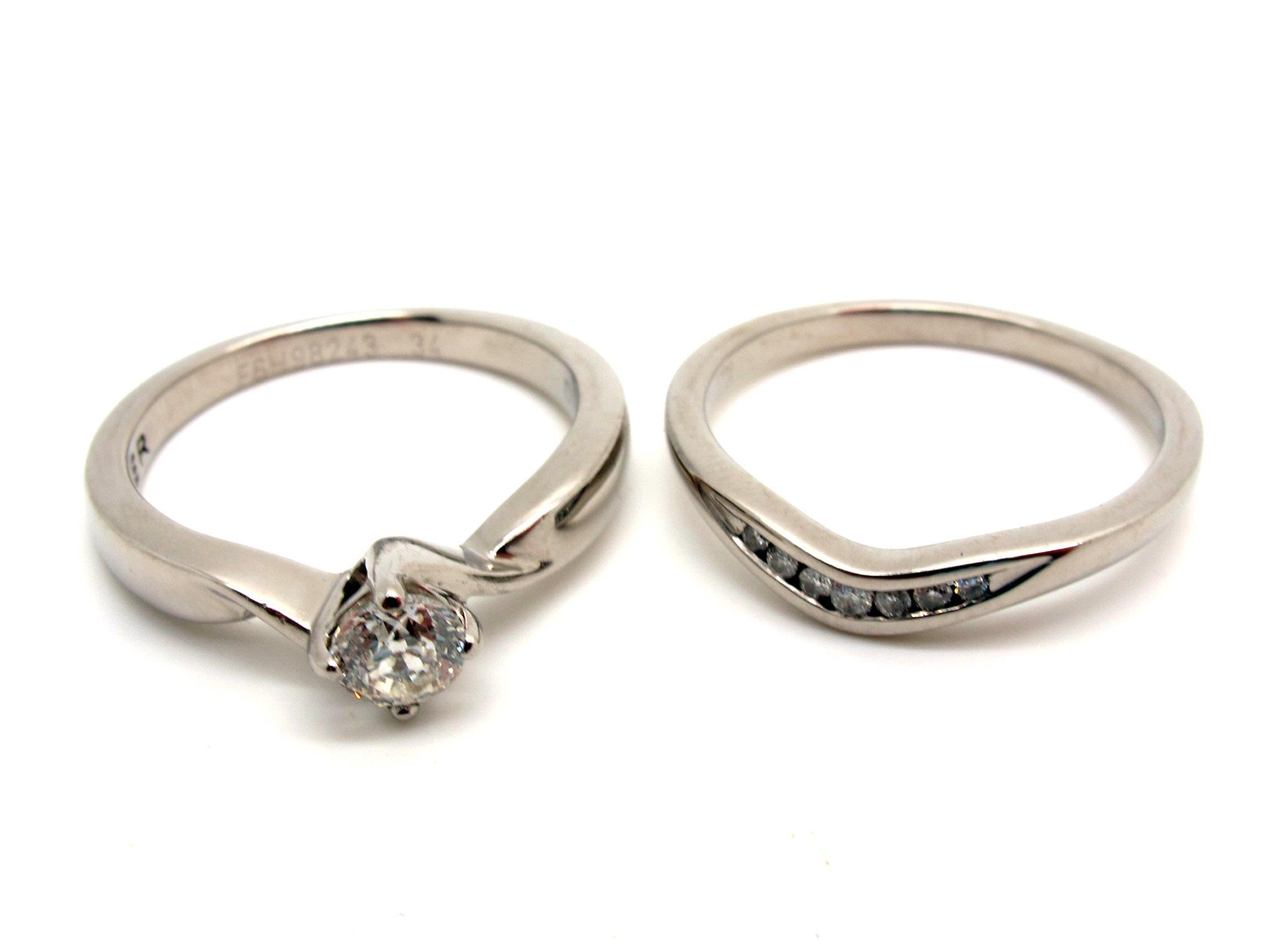 A Modern (950) Palladium Single Stone Diamond Ring, four claw set between crossover style twisted shoulders, inside shank stamped "Forever" with inset detail, also stamped "F6H98243 34" "DIA" (finger size L1/2); Together with A Modern (950) Palladium Diamond Set Shaped Band, graduated channel set, stamped "PD950" "0.05" (finger size L1/2) (total weight . (2)