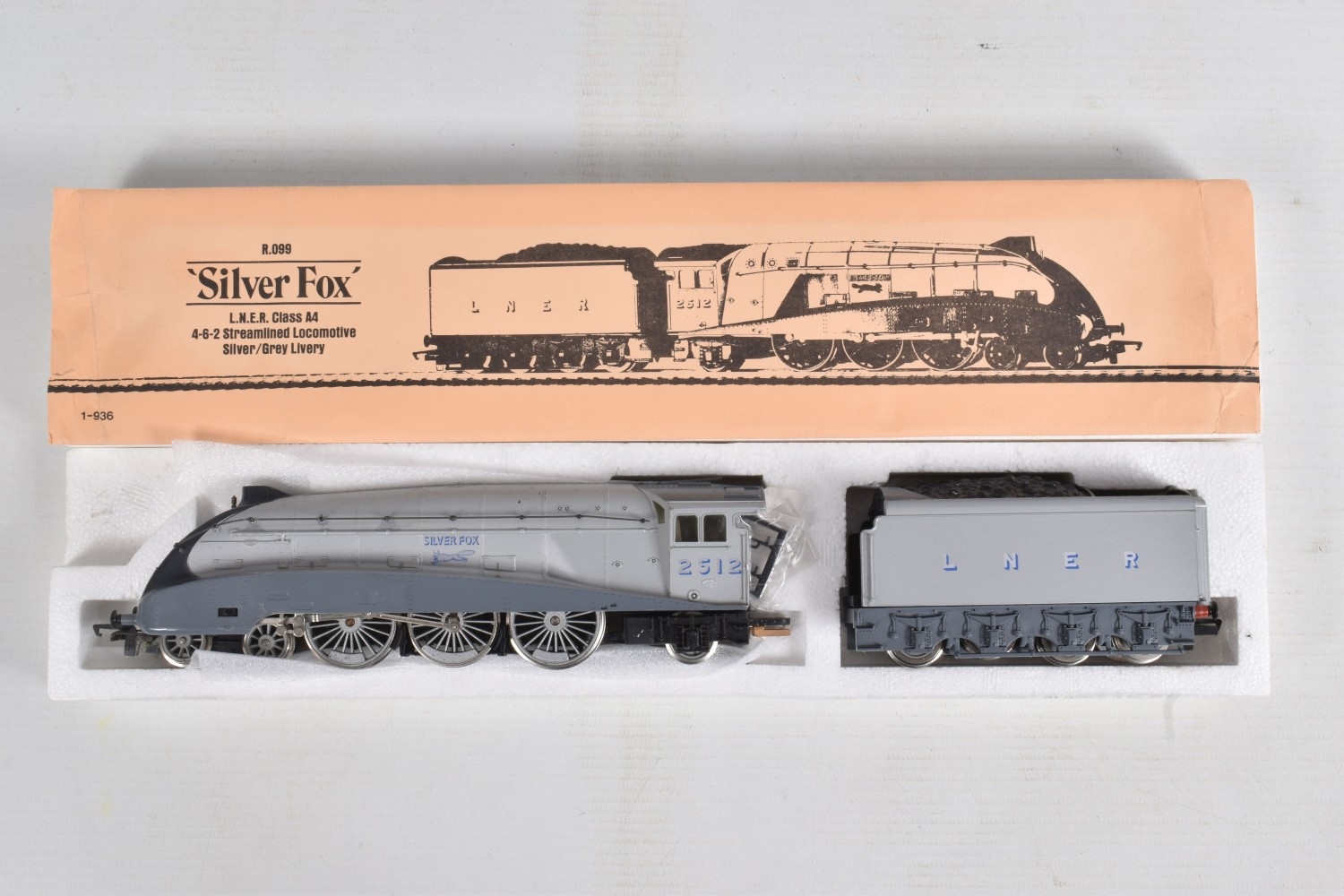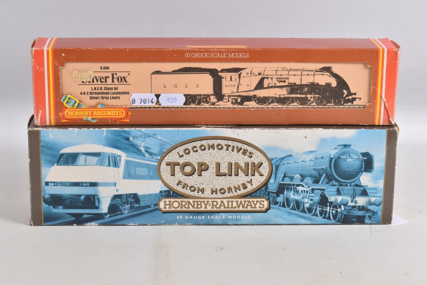 TWO BOXED HORNBY RAILWAYS OO GAUGE A4 CLASS LOCOMOTIVE AND TENDER, 'Silver Fox' No.2512, L.N.E.R silver grey livery, hand rail re-glued on one side (R099) and Top Link 'Mallard' No.4468, L.N.E.R. blue livery (R304), both appear complete and in good condition except as noted above, Mallard with instructions, boxes both complete but with fading, damage, marking and wear
