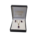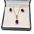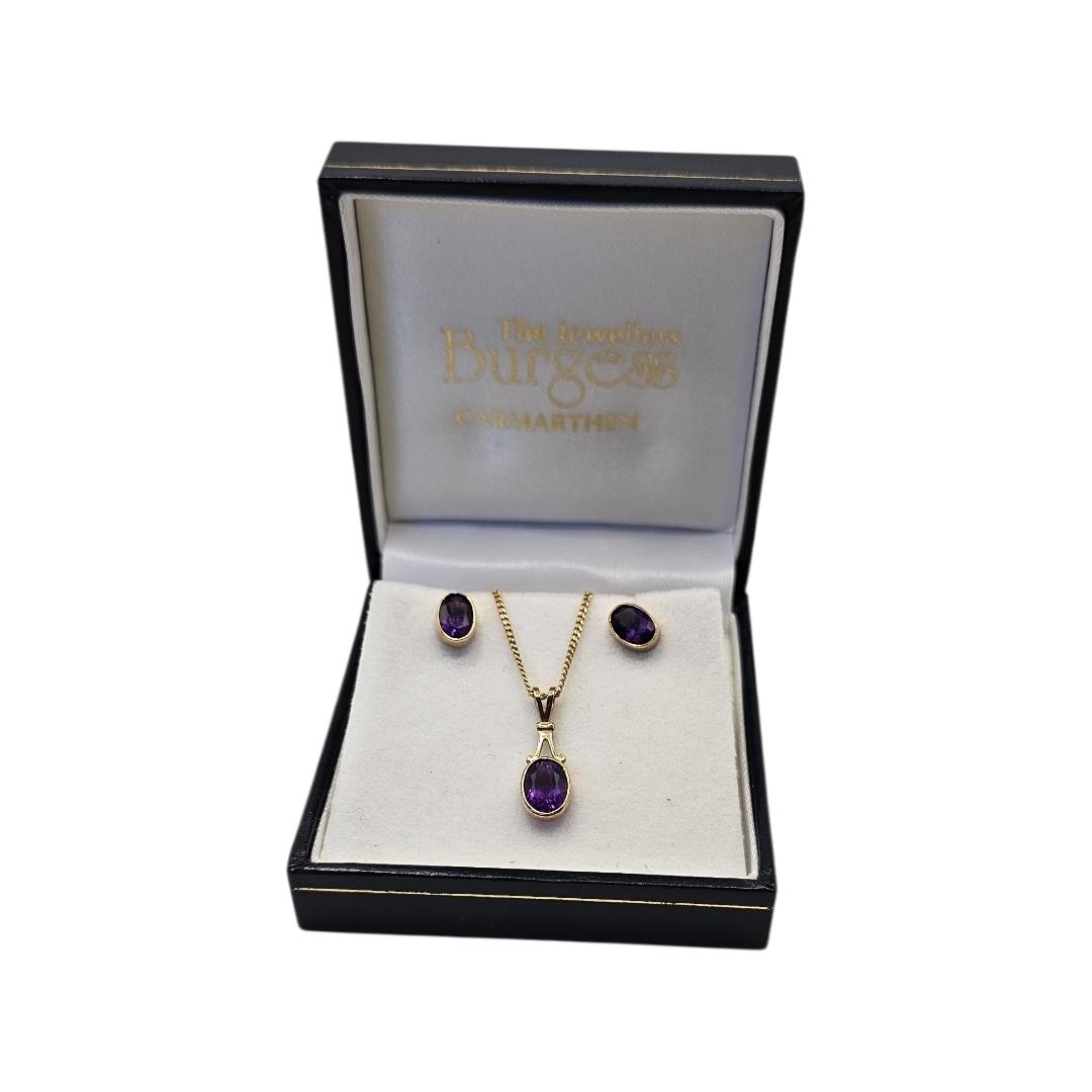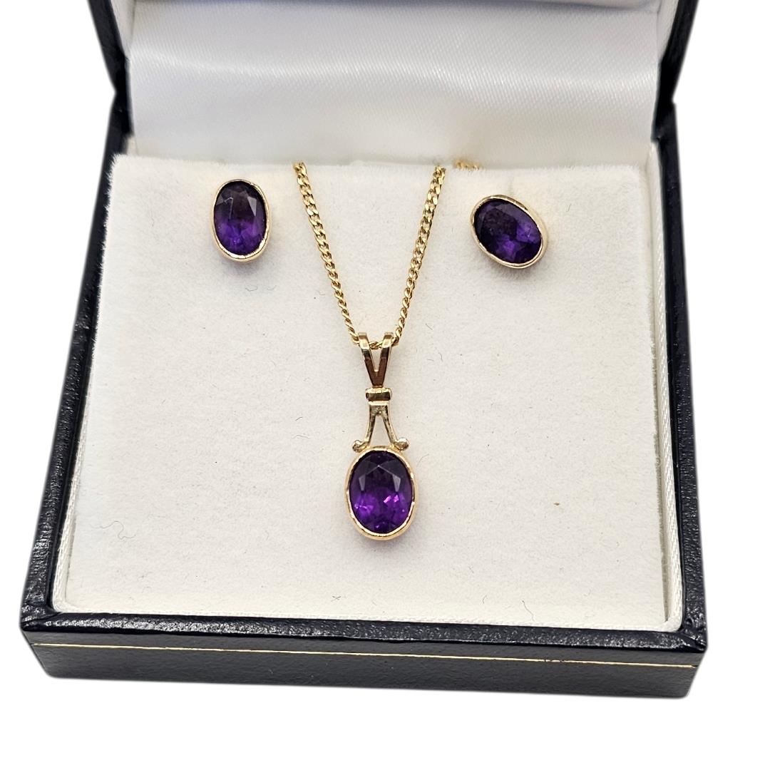 The single oval cut amethyst on a fine 9ct gold necklace chain with matching stud earrings, in a velvet lined box.