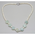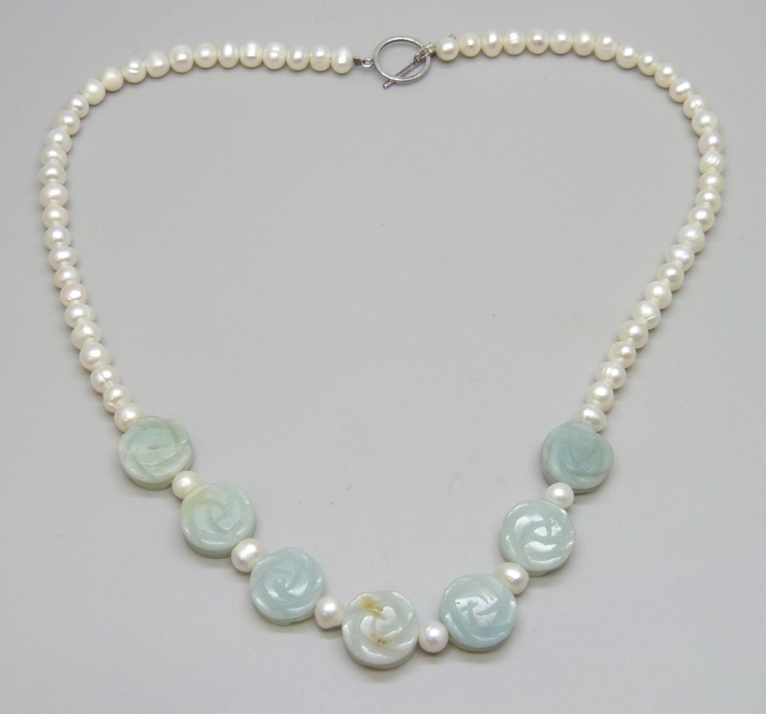 A pearl and carved flower design jade/jadeite necklace with a silver T bar clasp, 32g, 47cm