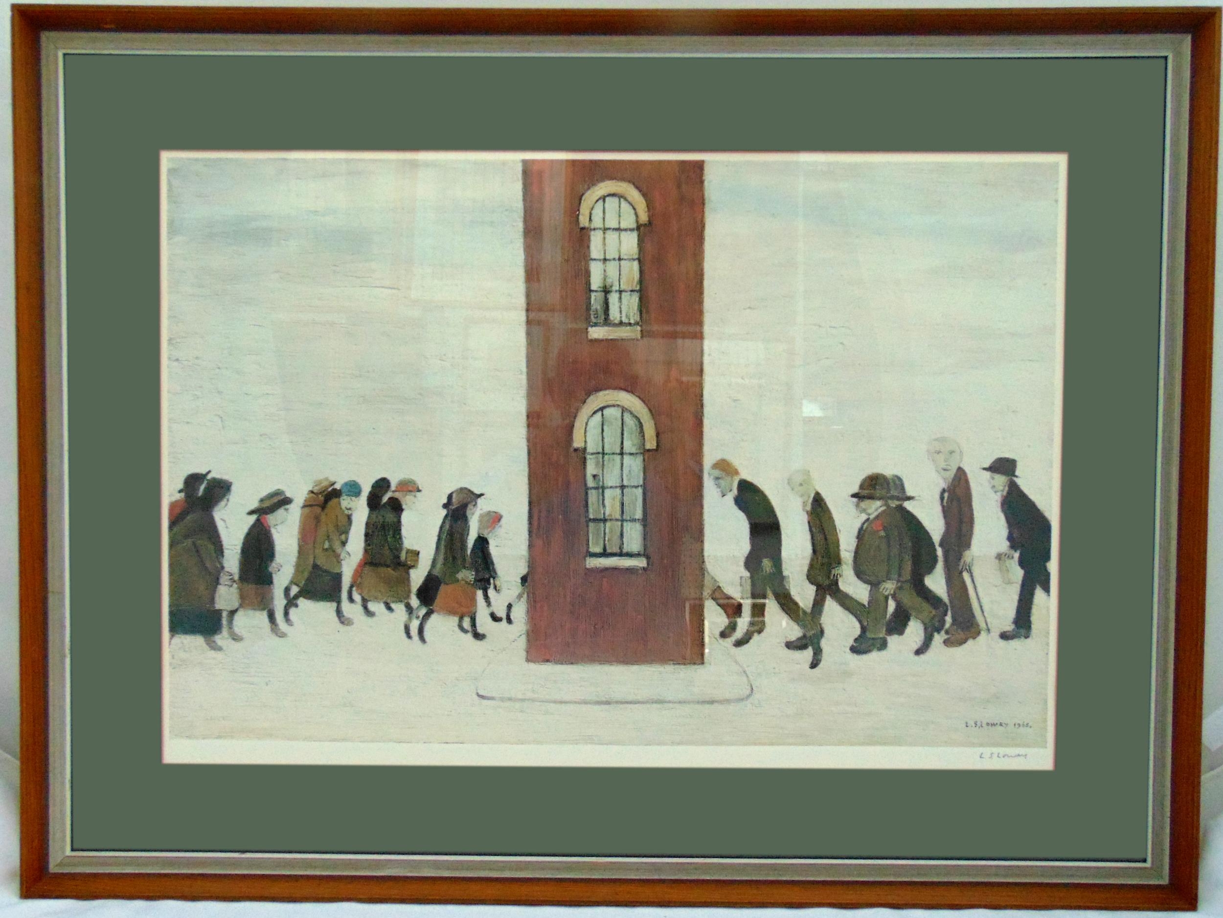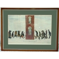 L.S. Lowry framed and glazed polychromatic print, signed bottom right and blind stamped bottom left titled The Meeting Point, Renoir Galleries Limited of Harrogate label to verso, 47 x 71cm
