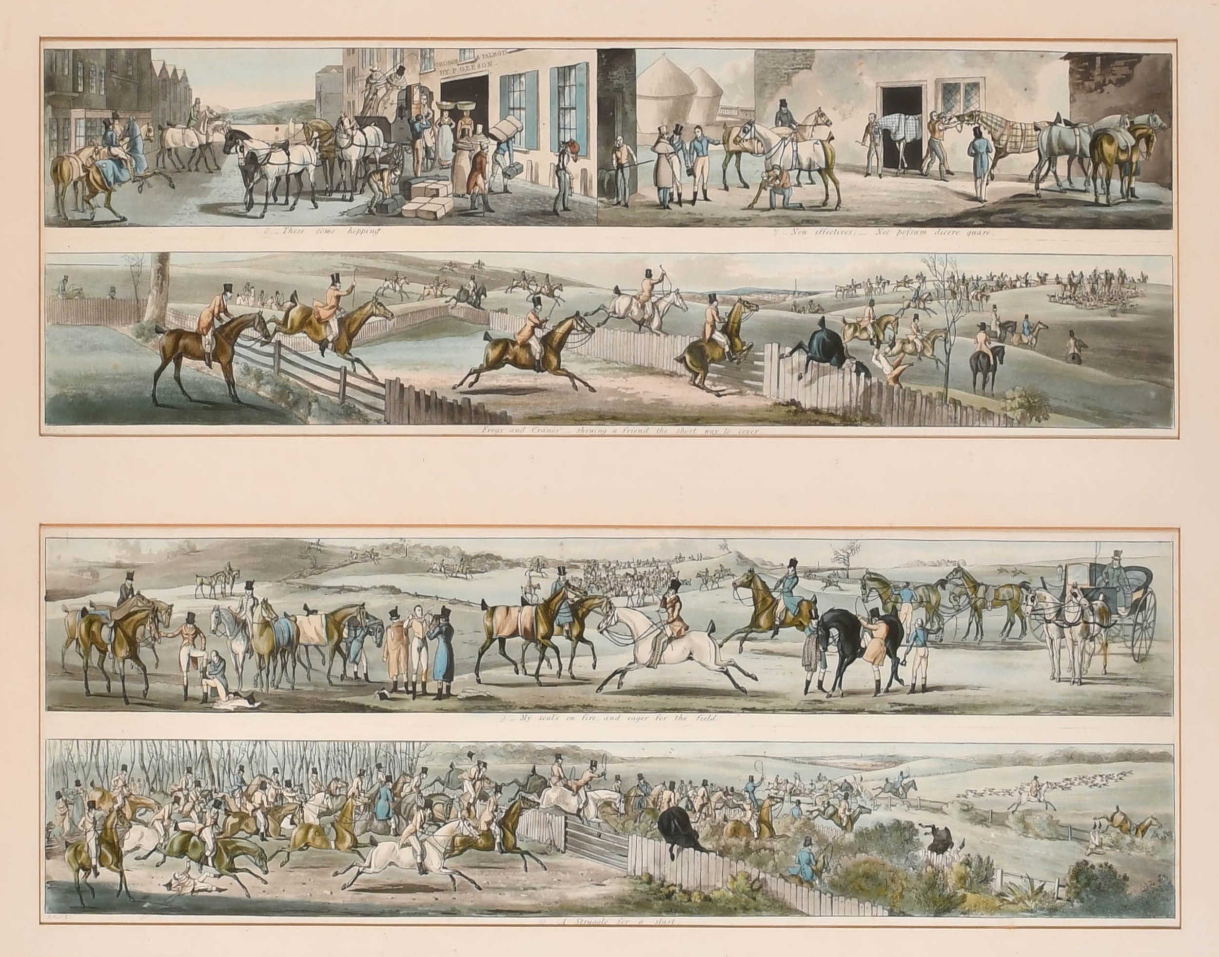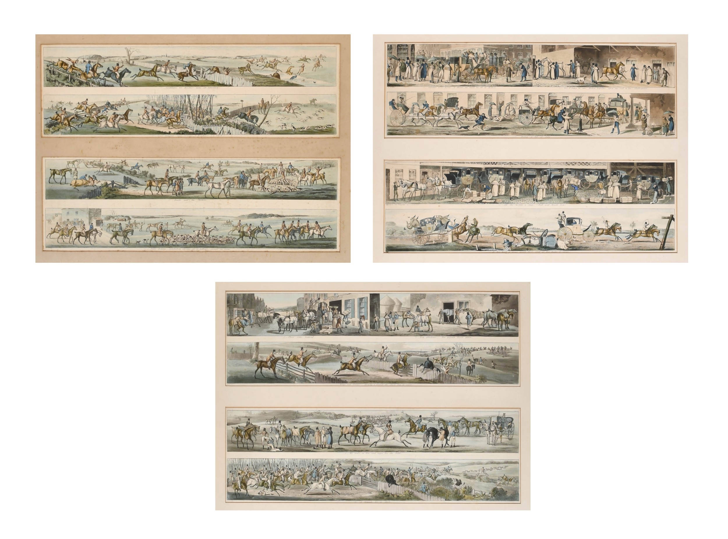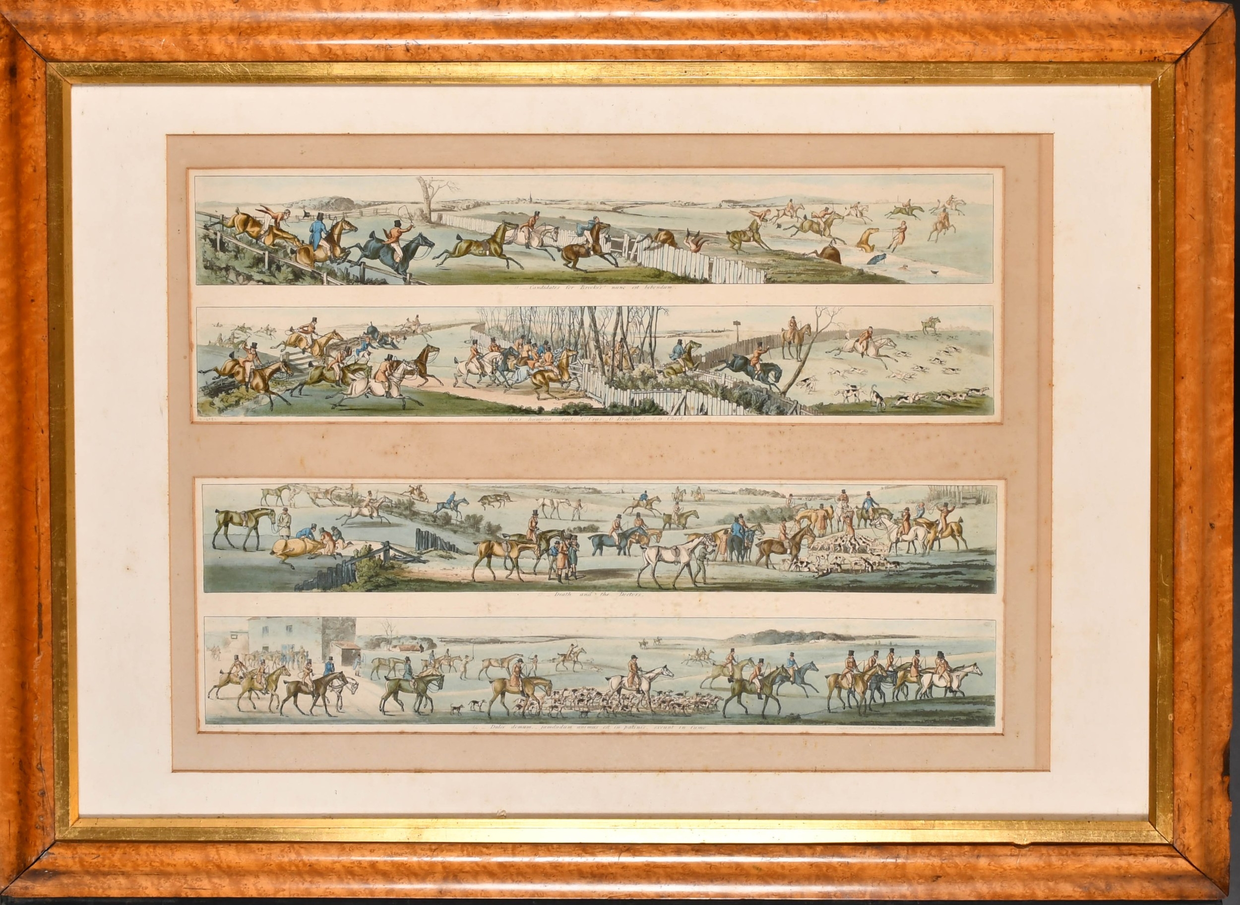 After Henry Alken (1785-1851) British. A Set of Twelve Racing Scenes, Two sets of pairs in each frame, Prints, In maple frames Overall for pair 16" x 21.75" (40.6 x 55.3cm)