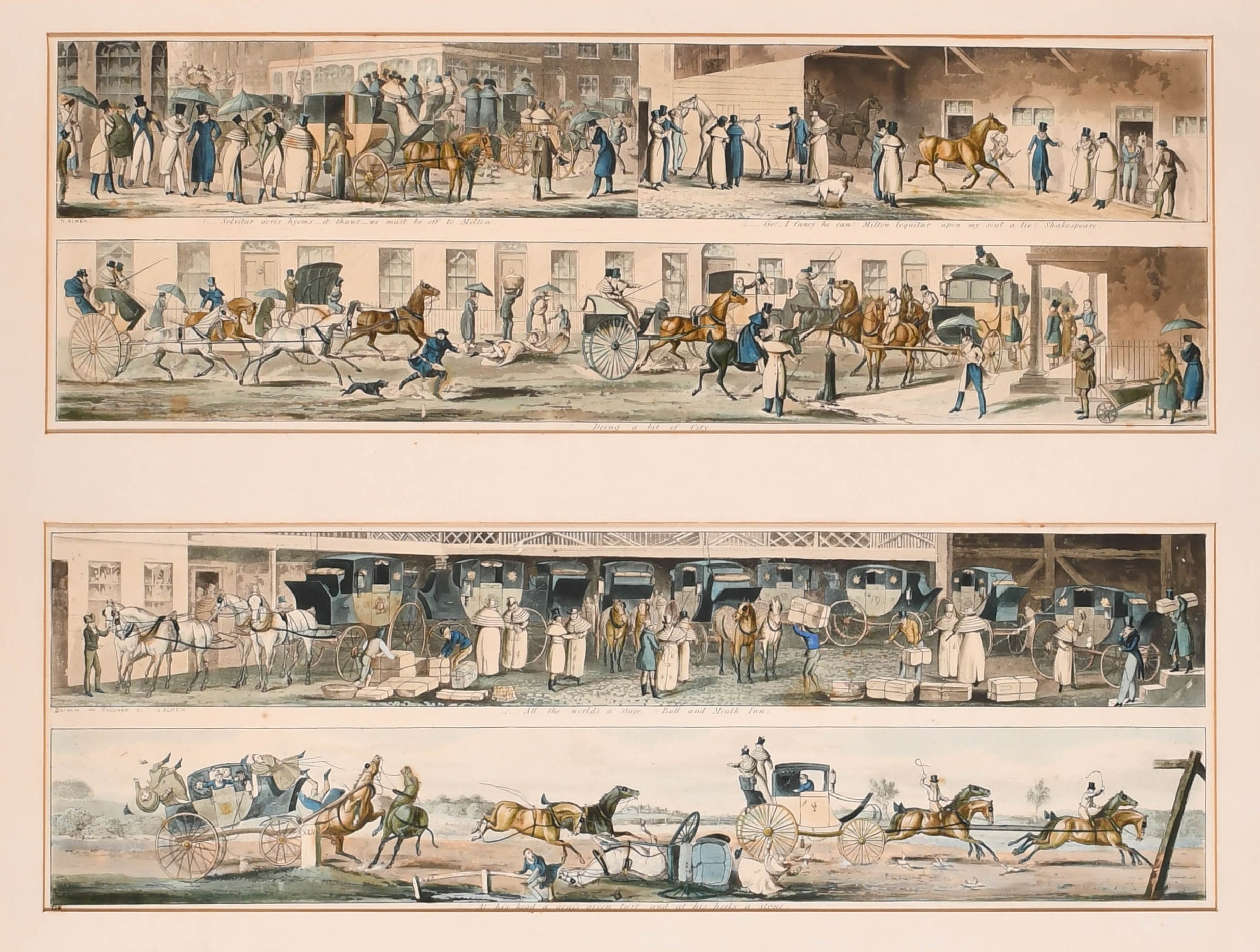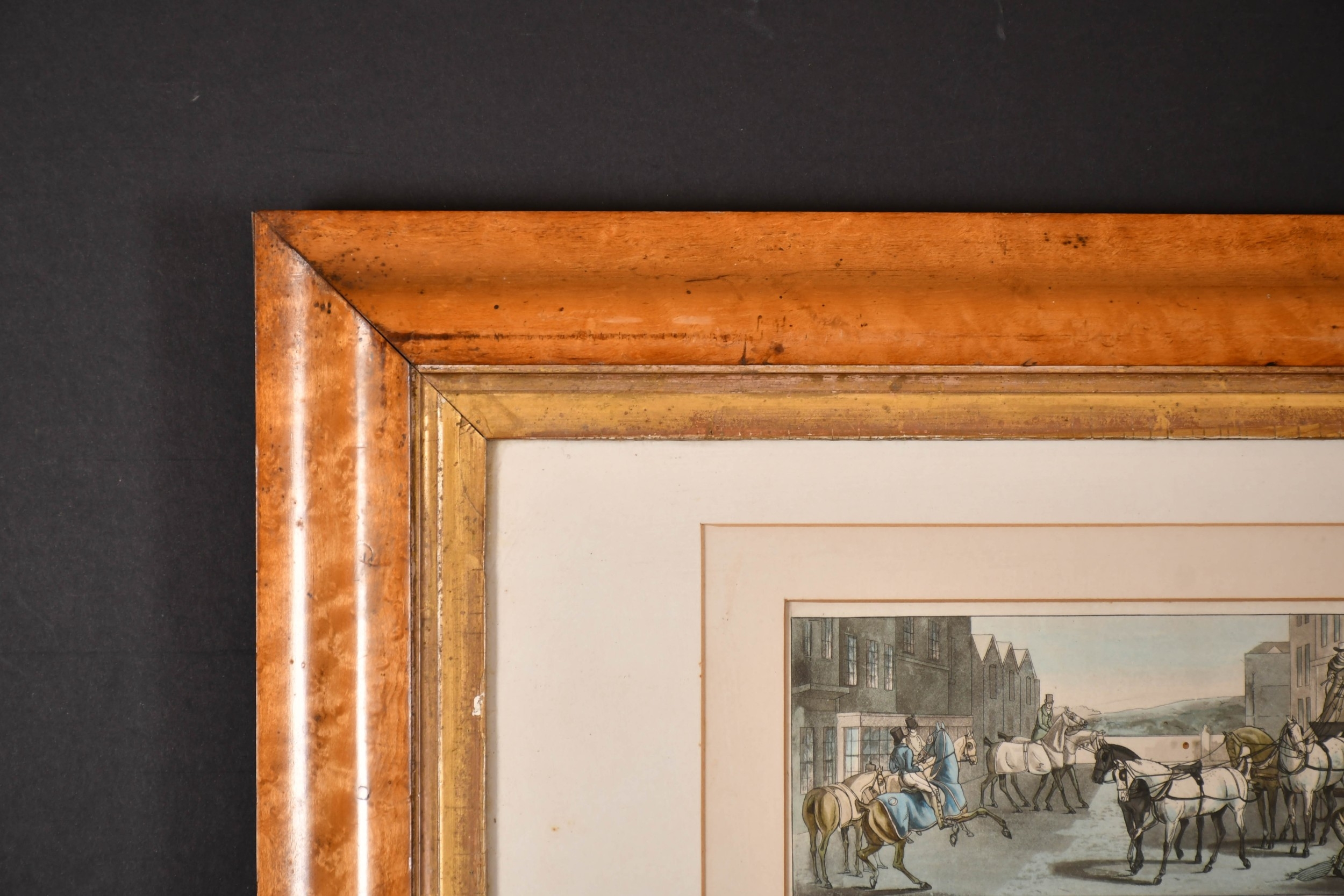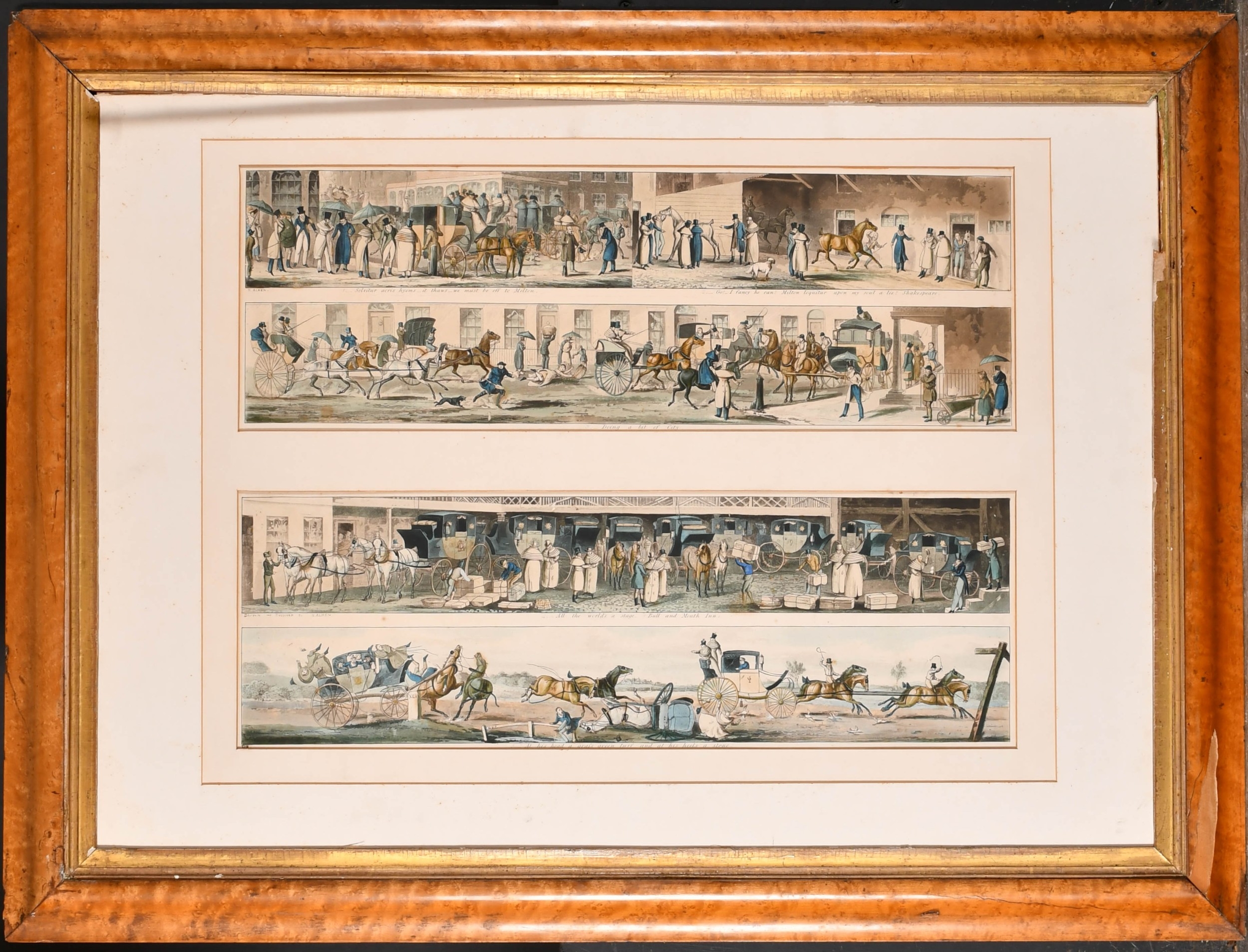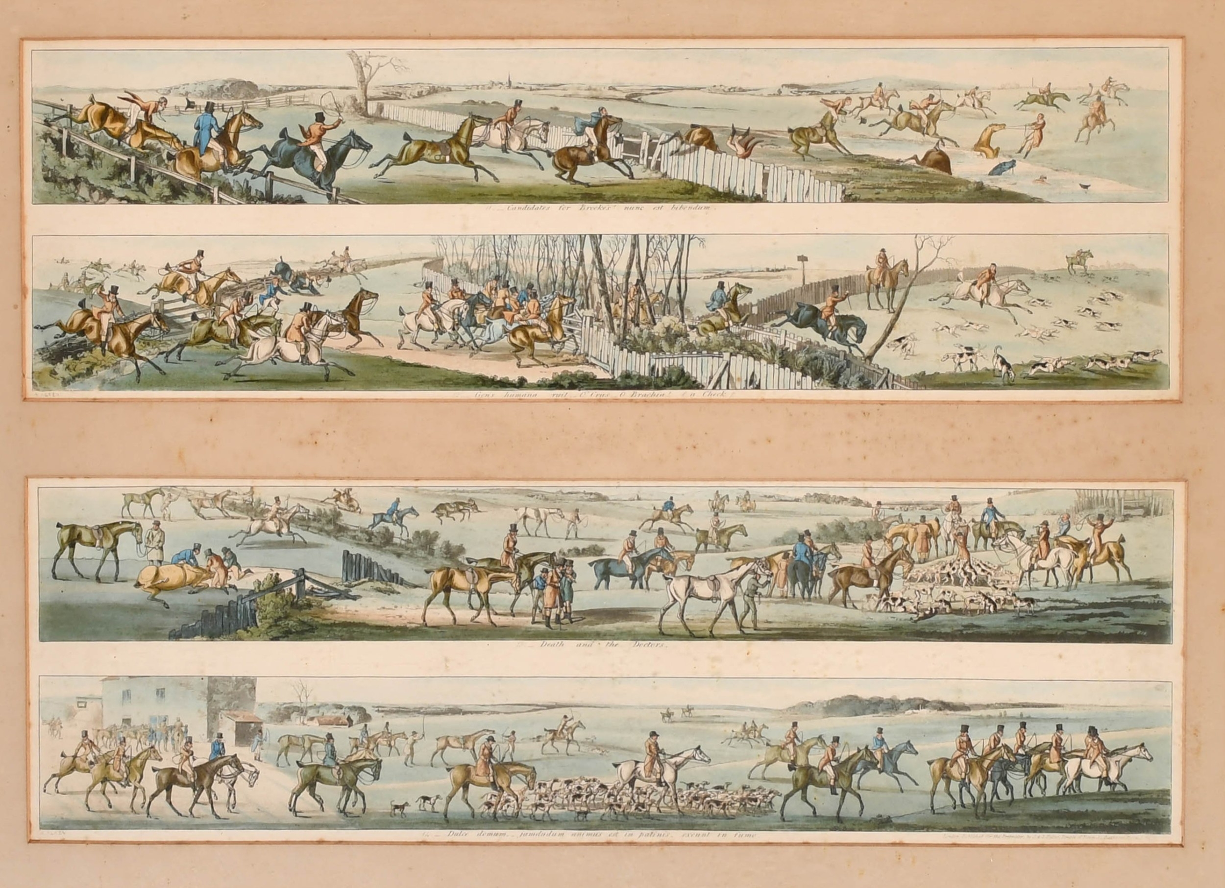 After Henry Alken (1785-1851) British. A Set of Twelve Racing Scenes, Two sets of pairs in each frame, Prints, In maple frames Overall for pair 16" x 21.75" (40.6 x 55.3cm)