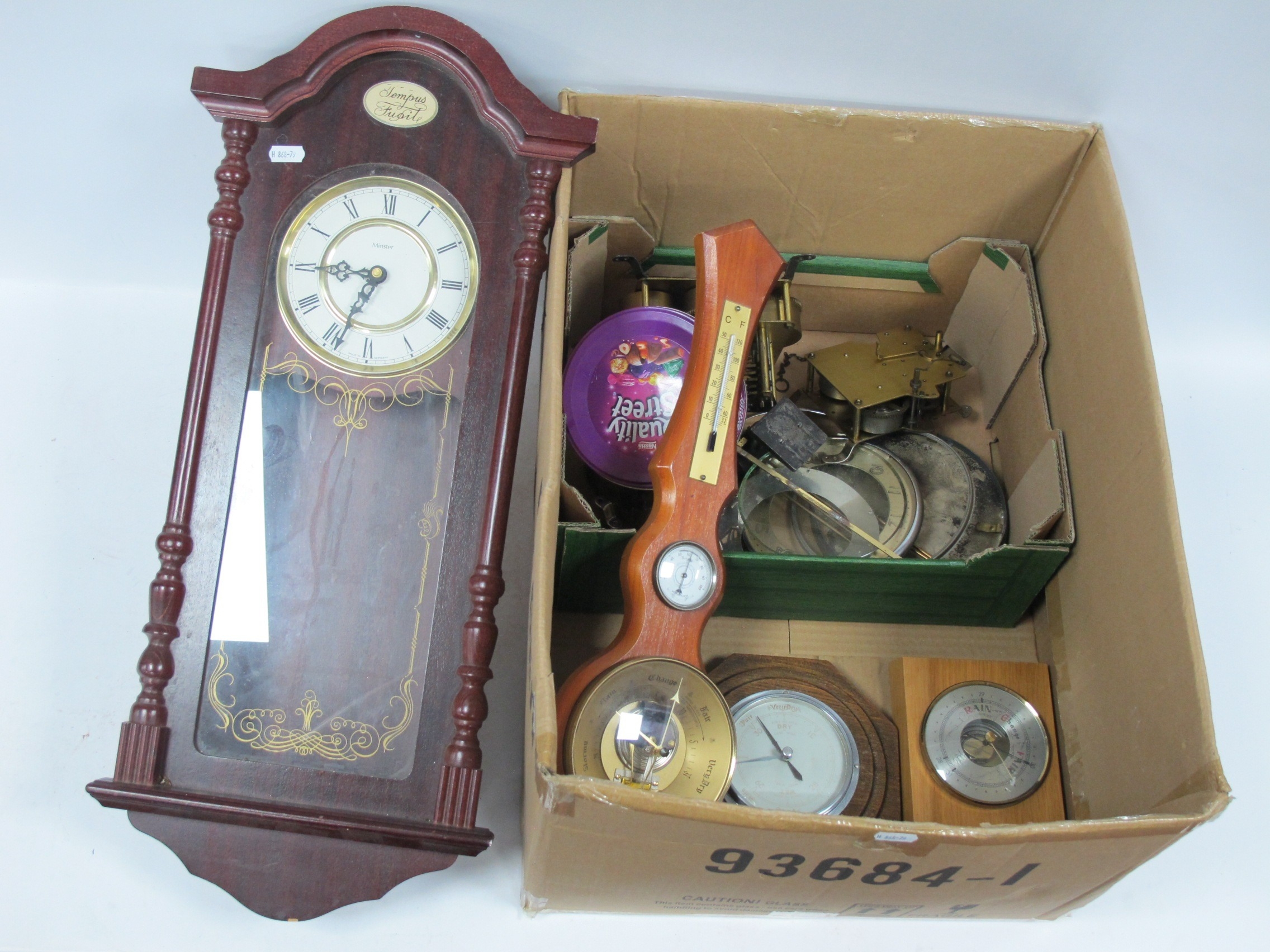 Clocks and Barometers, including a German Minster battery-powered wall clock, a quantity of mantel clock parts and assorted wooden barometers:- One box.