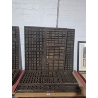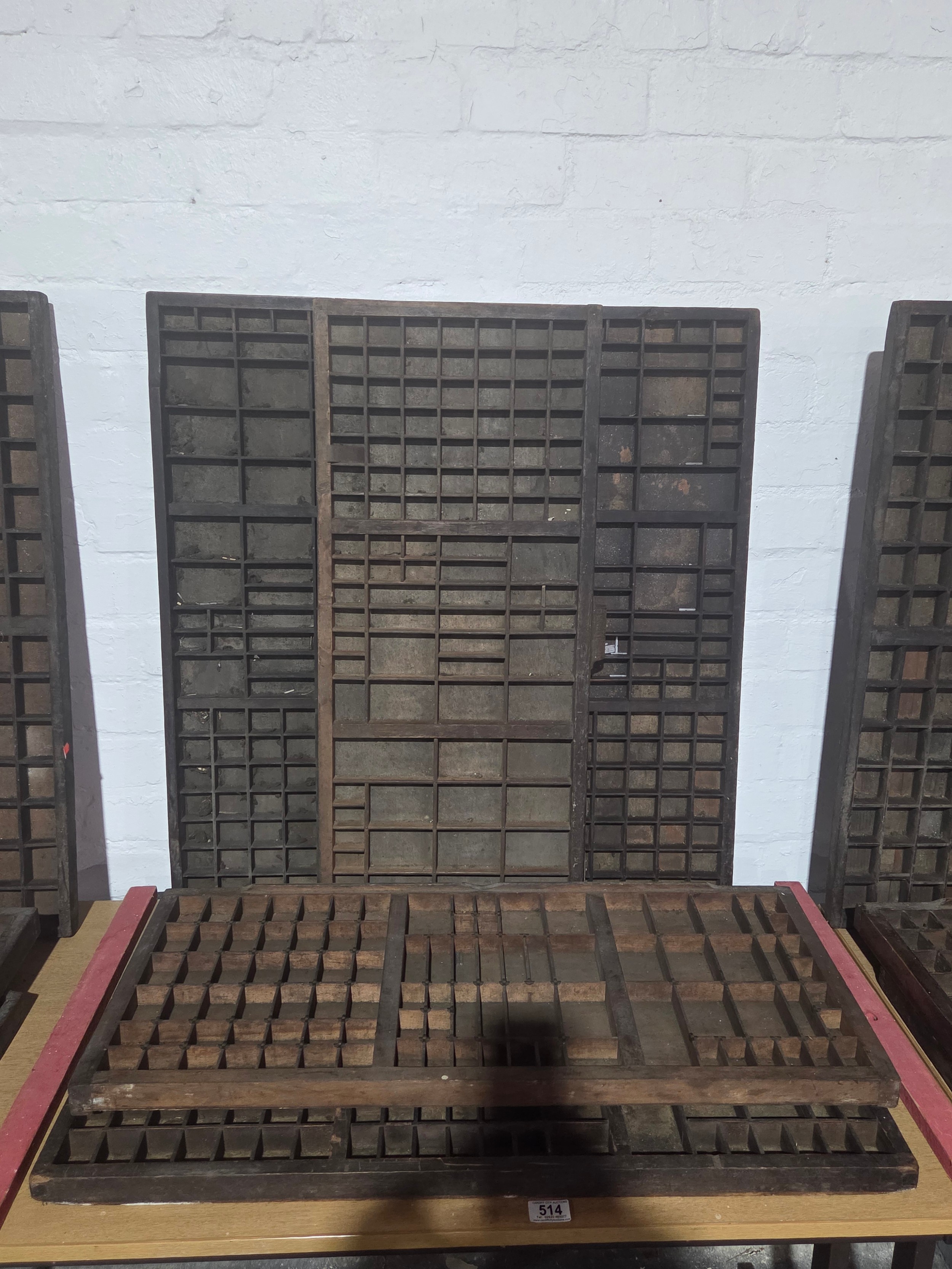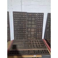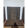 Five wooden printer's trays with compartments