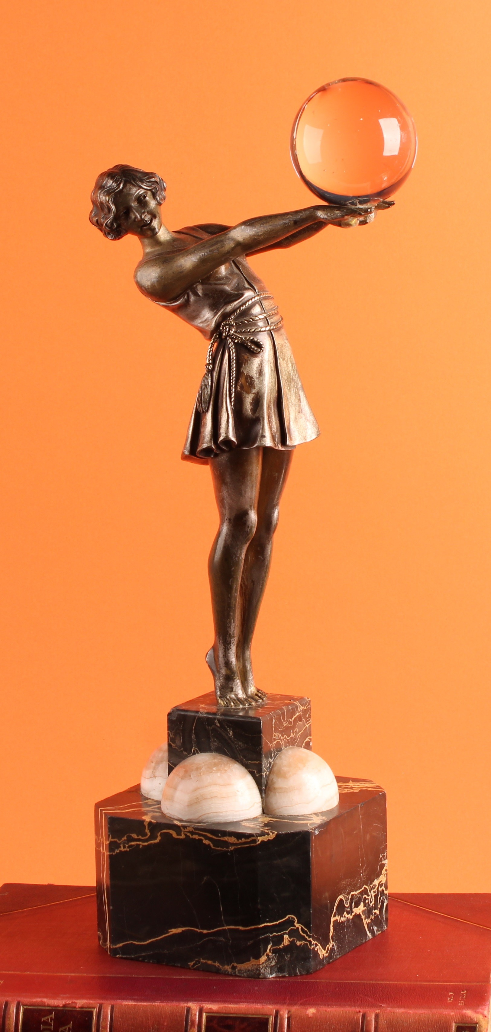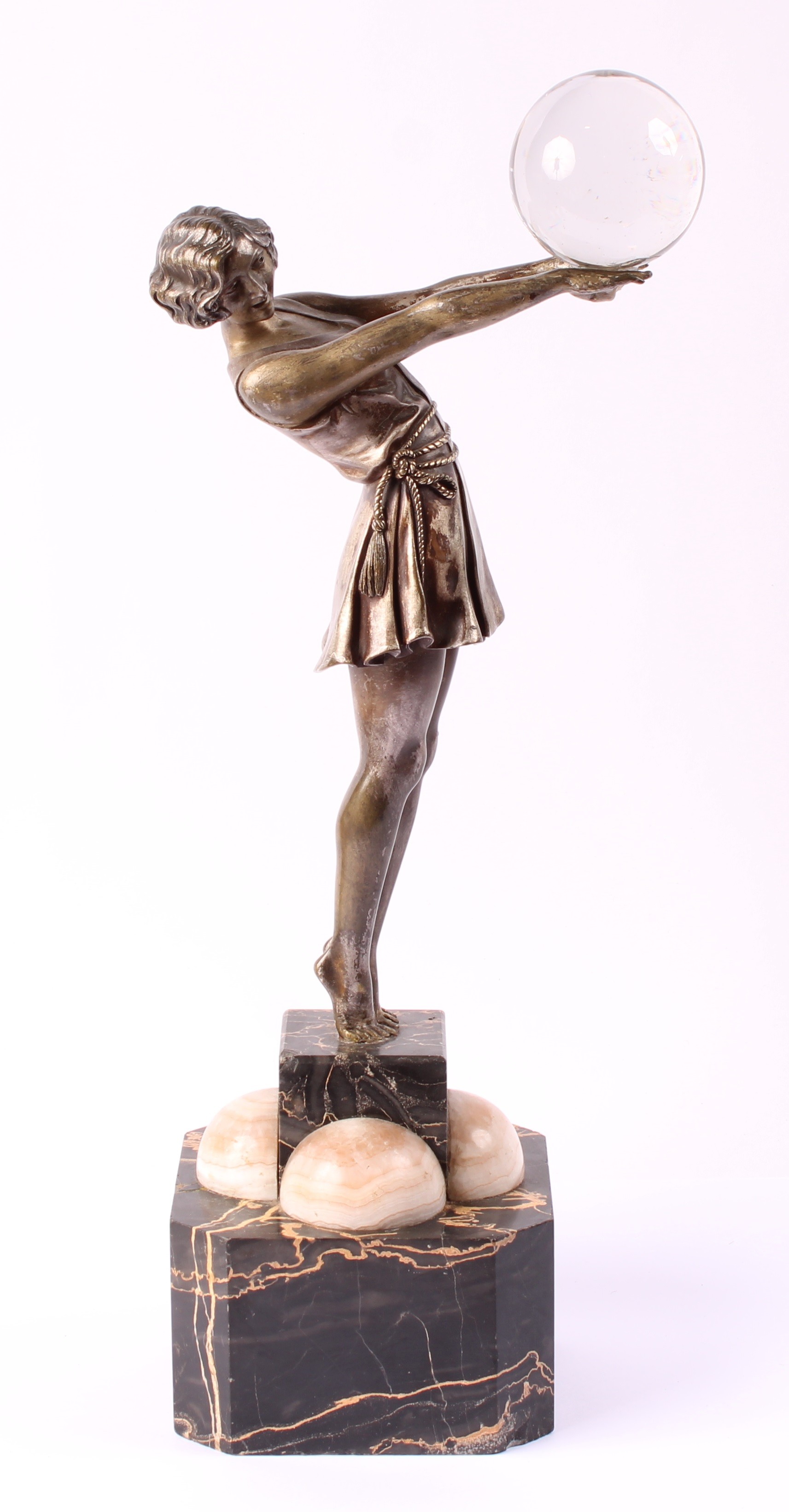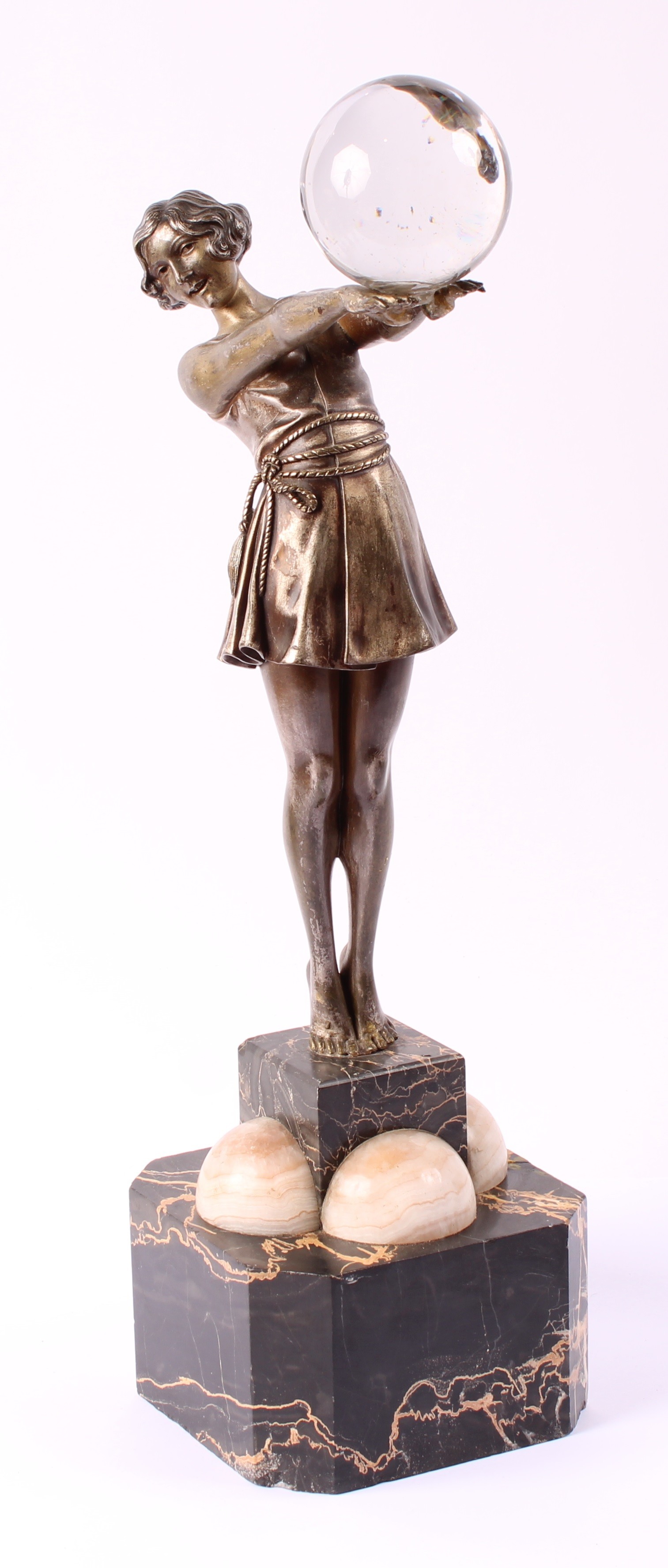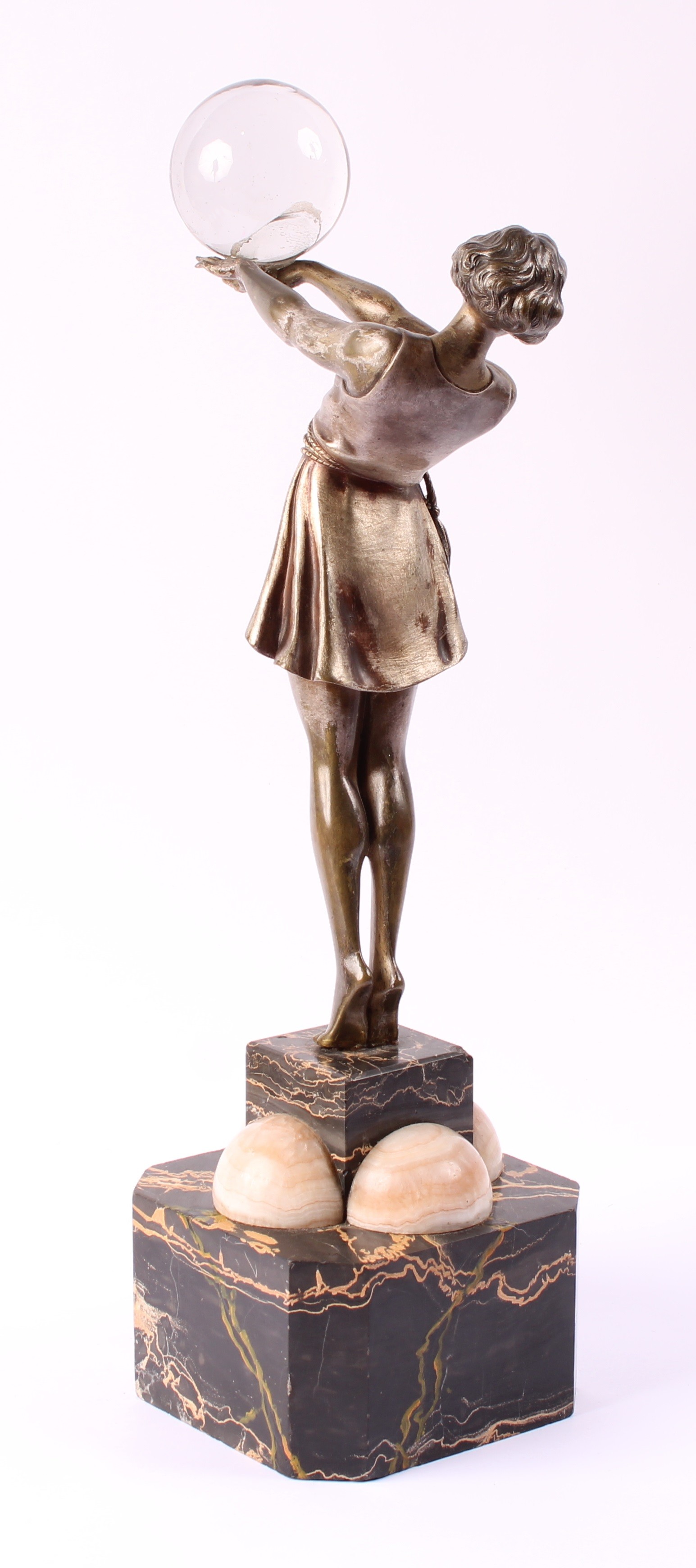 The figure herself good, just some loss to silvering, the crystal ball attached with glue, repairs to marble base