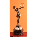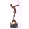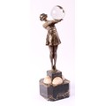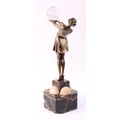 Continental School (20th century), an Art Deco silvered bronze, of a fashionable dancing girl, arms outstretched holding a glass ball, canted square base with spherical caps, 49cm high, c.1930