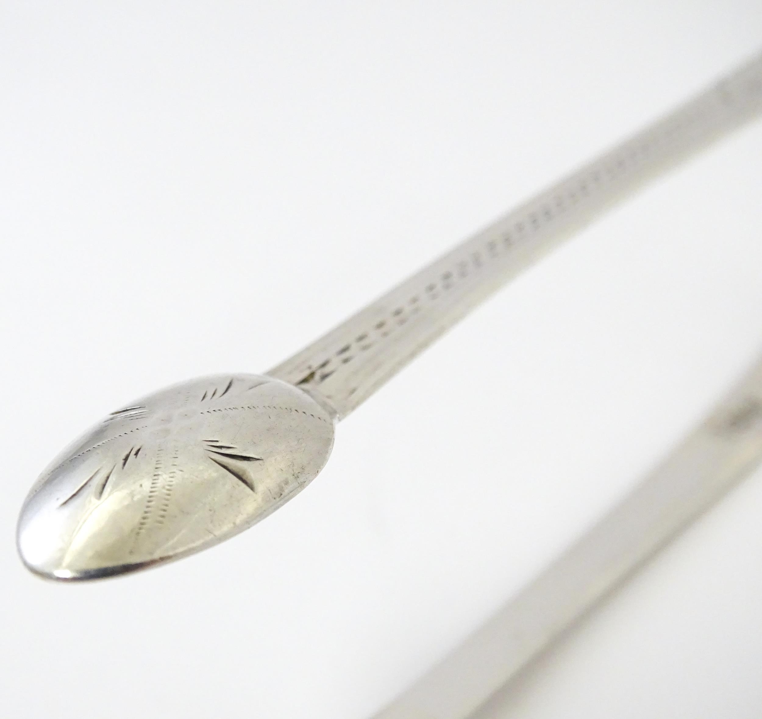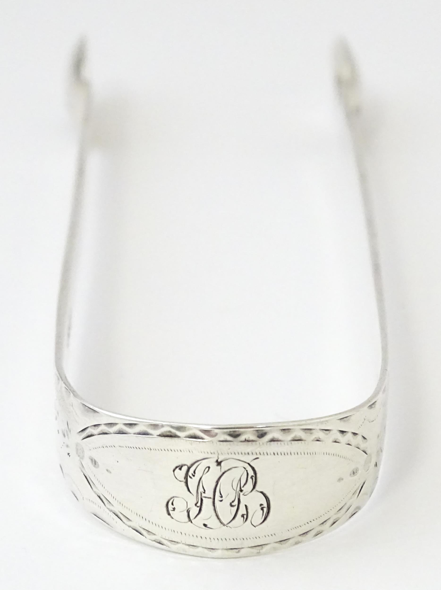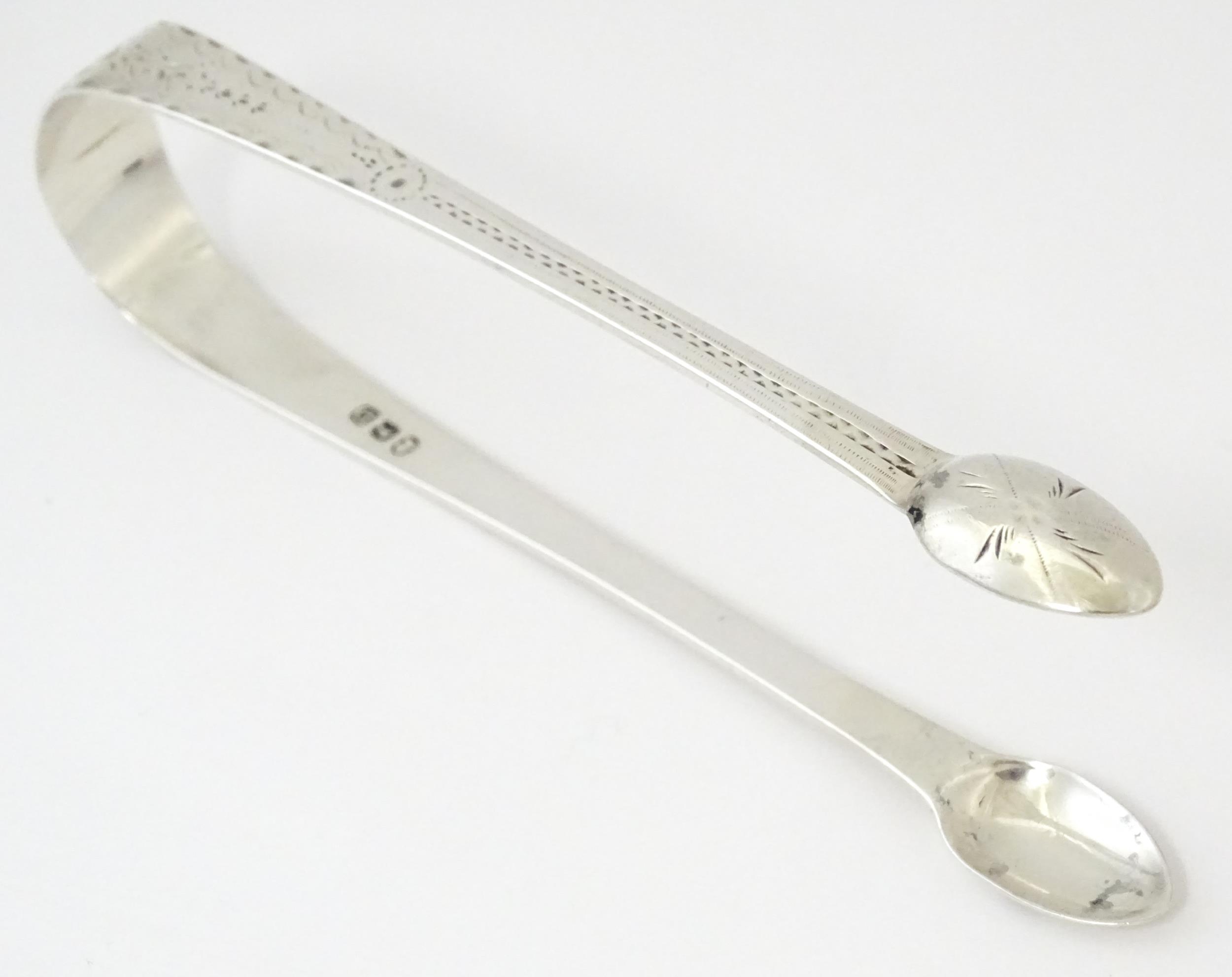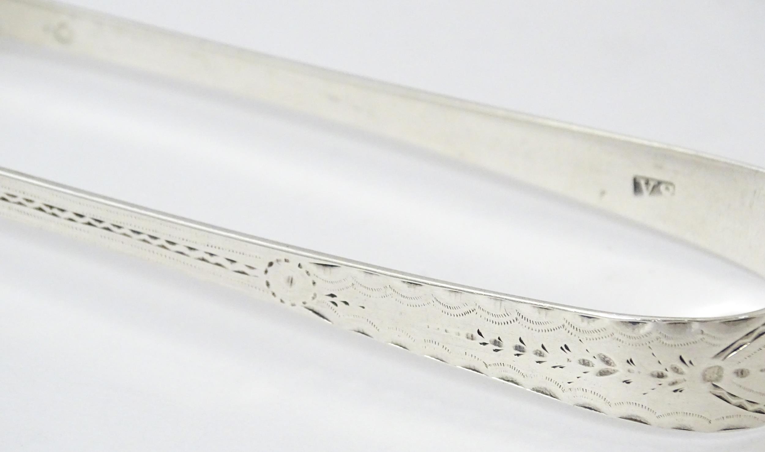 George III silver sugar tongs with bright cut decoration. London 1799 maker Stephen Adams. Approx. 5 1/2" long