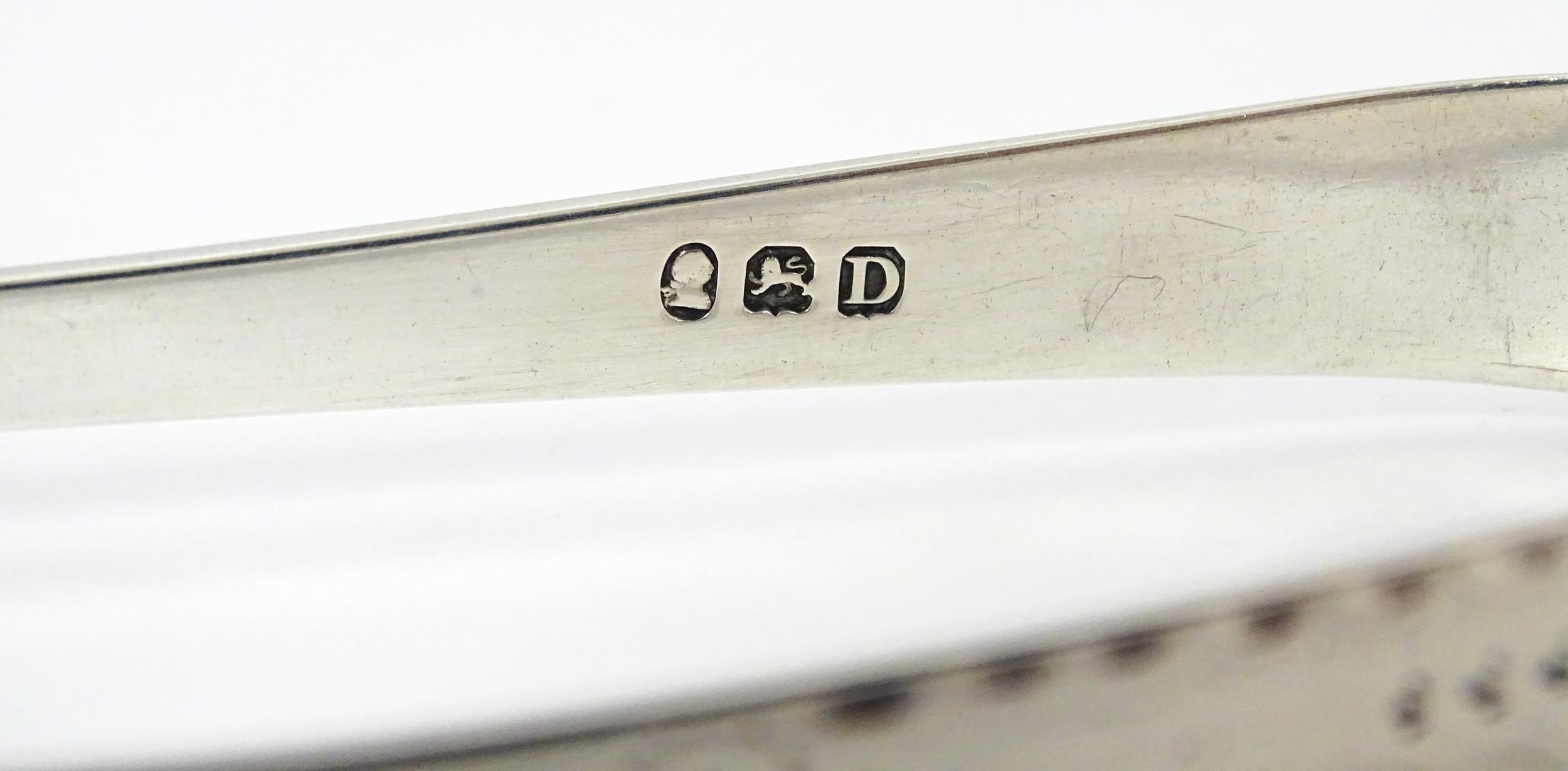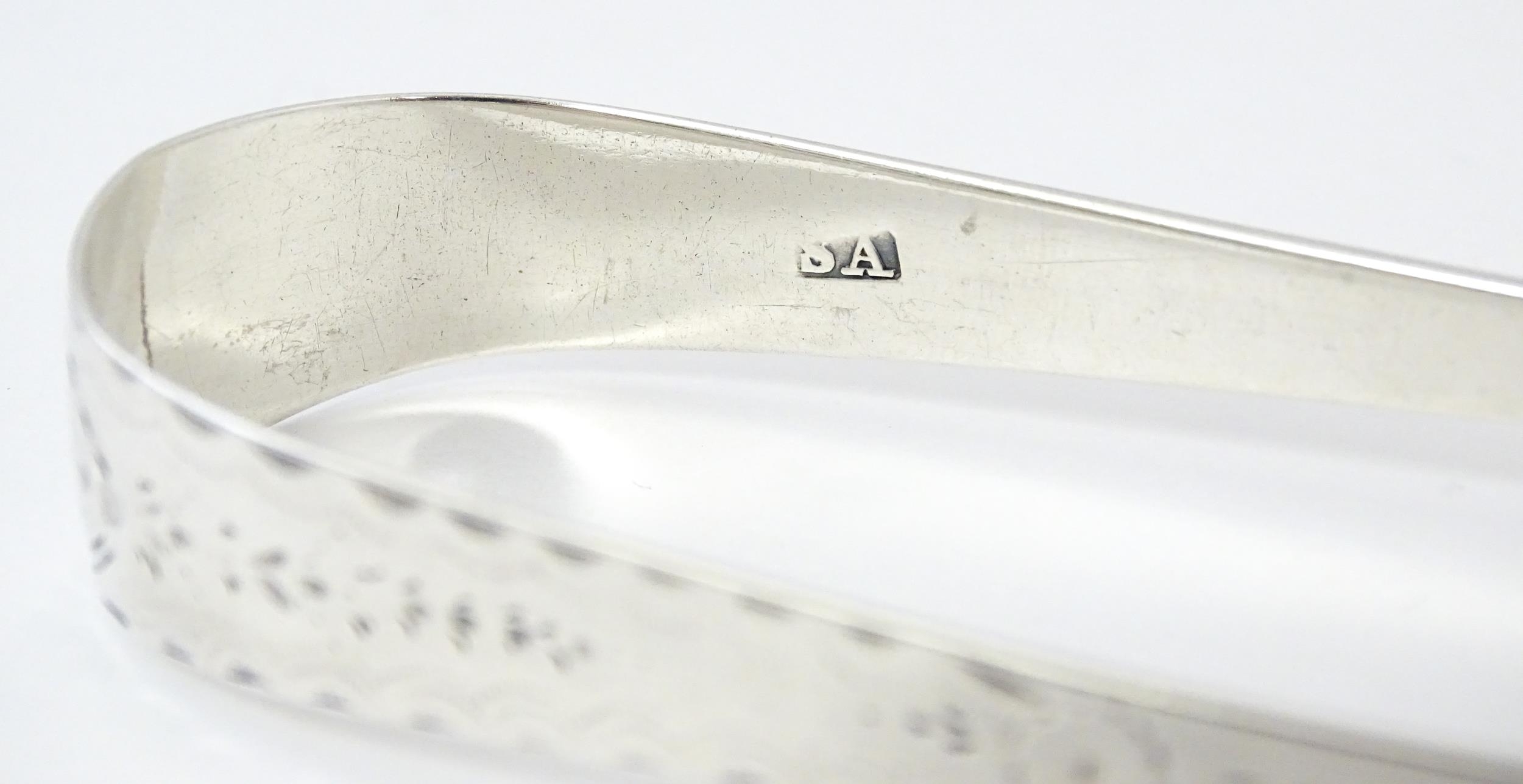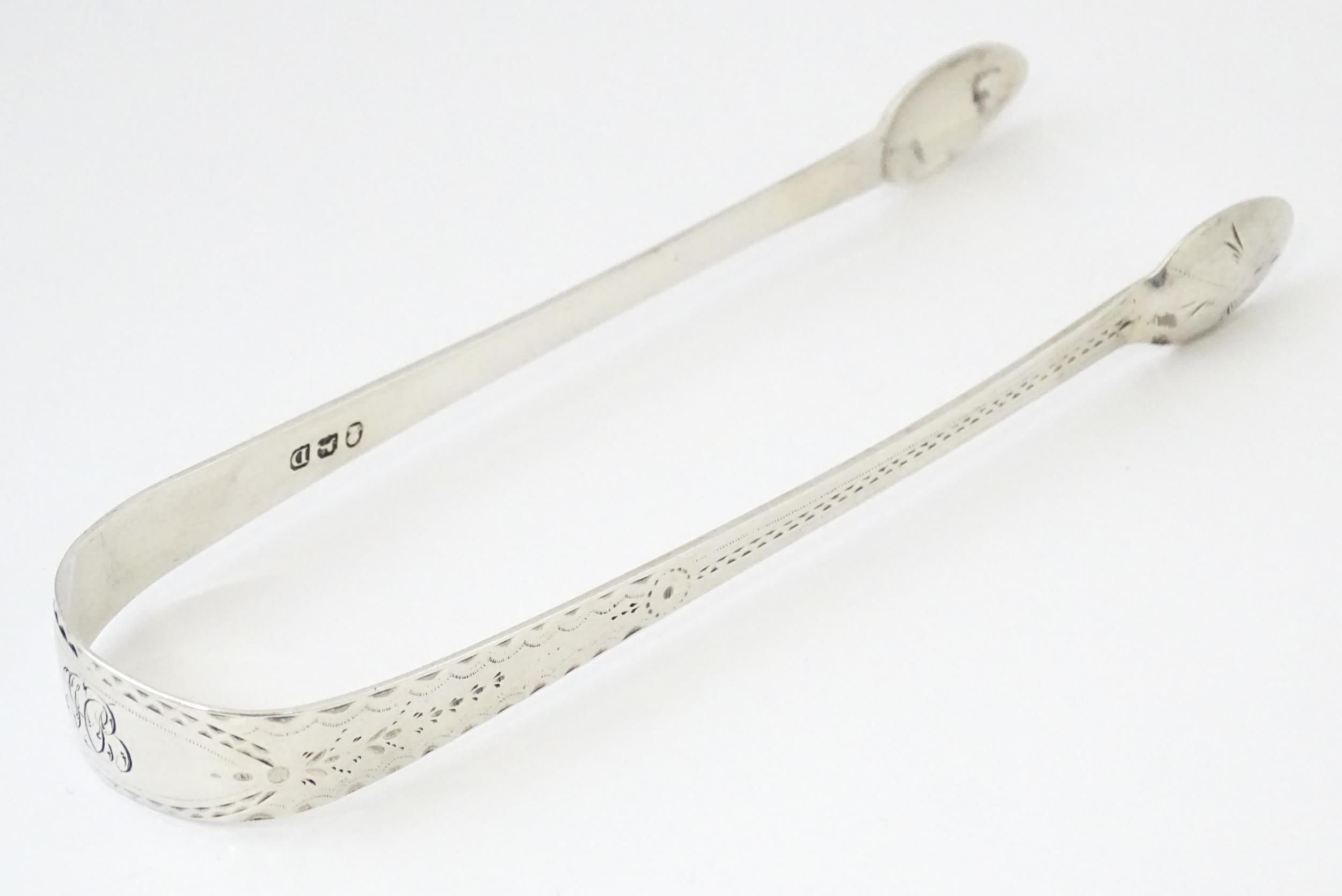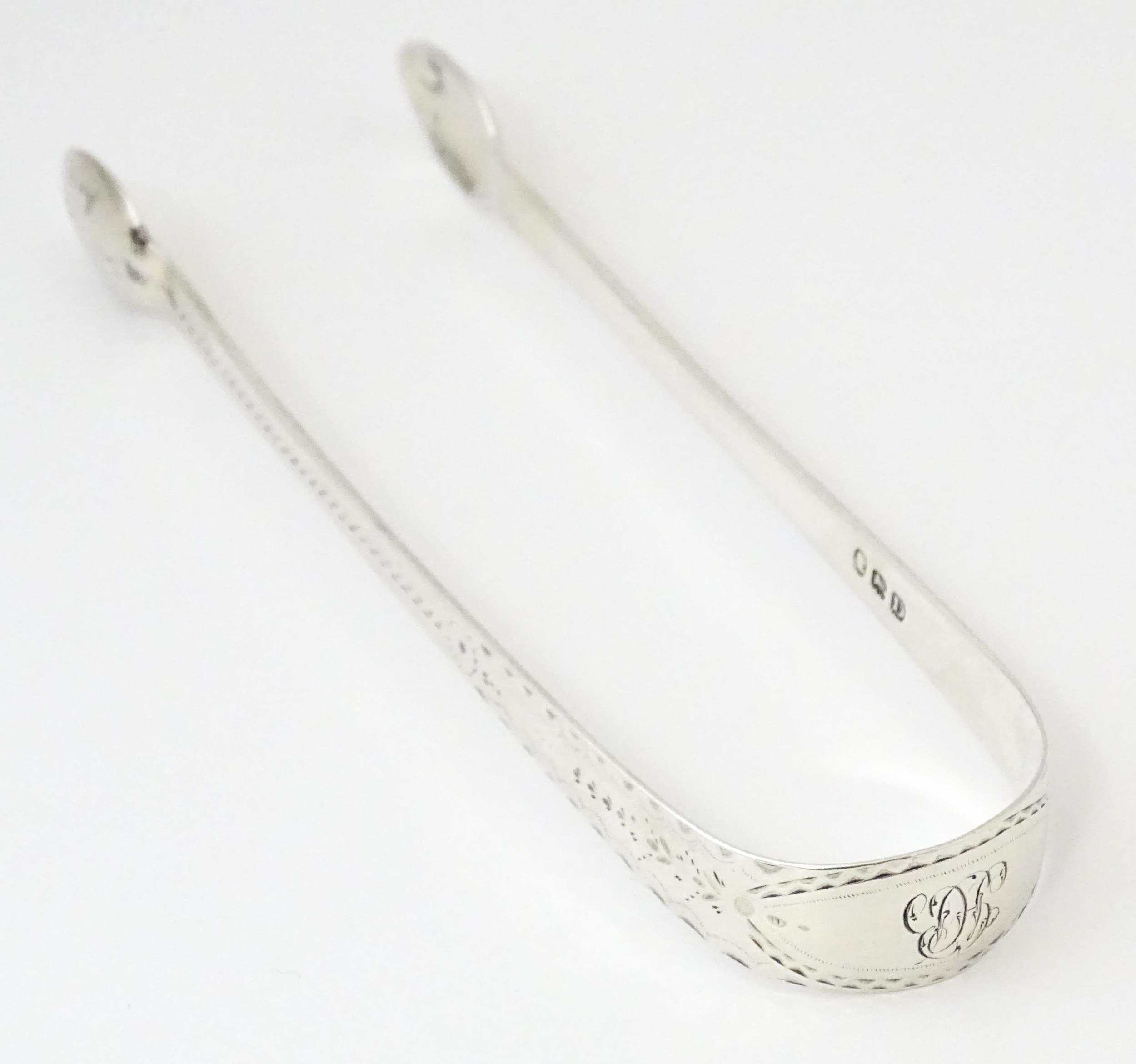 George III silver sugar tongs with bright cut decoration. London 1799 maker Stephen Adams. Approx. 5 1/2" long