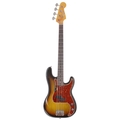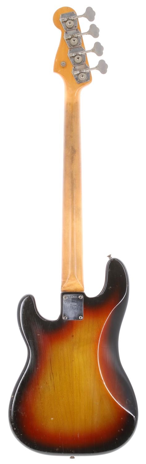 UK TV Interest - 1964 Fender Precision Bass guitar, made in USA; Body: three-tone sunburst finish, lacquer overspray, lacquer checking, dings and scratches throughout; Neck: maple, surface wear; Fretboard: rosewood, light wear; Frets: refret, light wear; Electrics: working, potentiometers dating to 1964; Hardware: generally good, missing pickup and bridge covers, finger rest repositioned to thumb position, divot wear to thumb position, screw holes slightly repositioned under guard, small split to pickguard beside jack, minor rusting to smaller metal screws; Case: fitted flight case; Overall condition: good for age