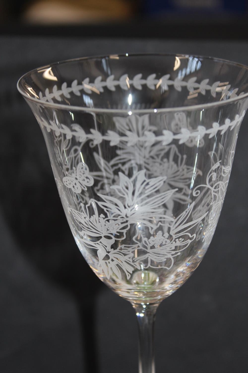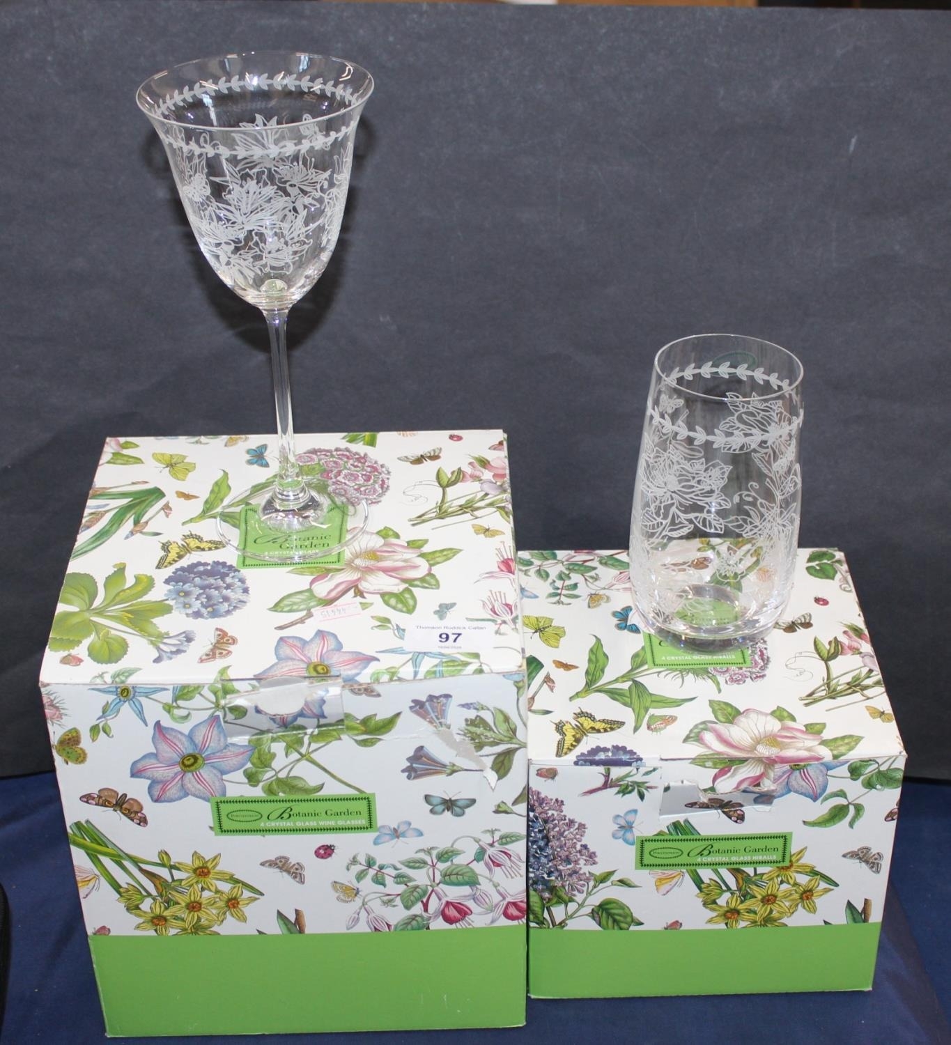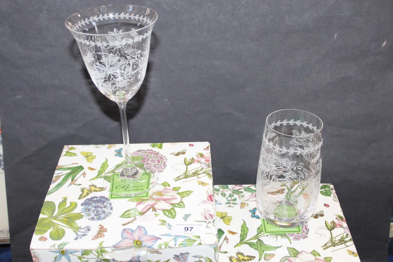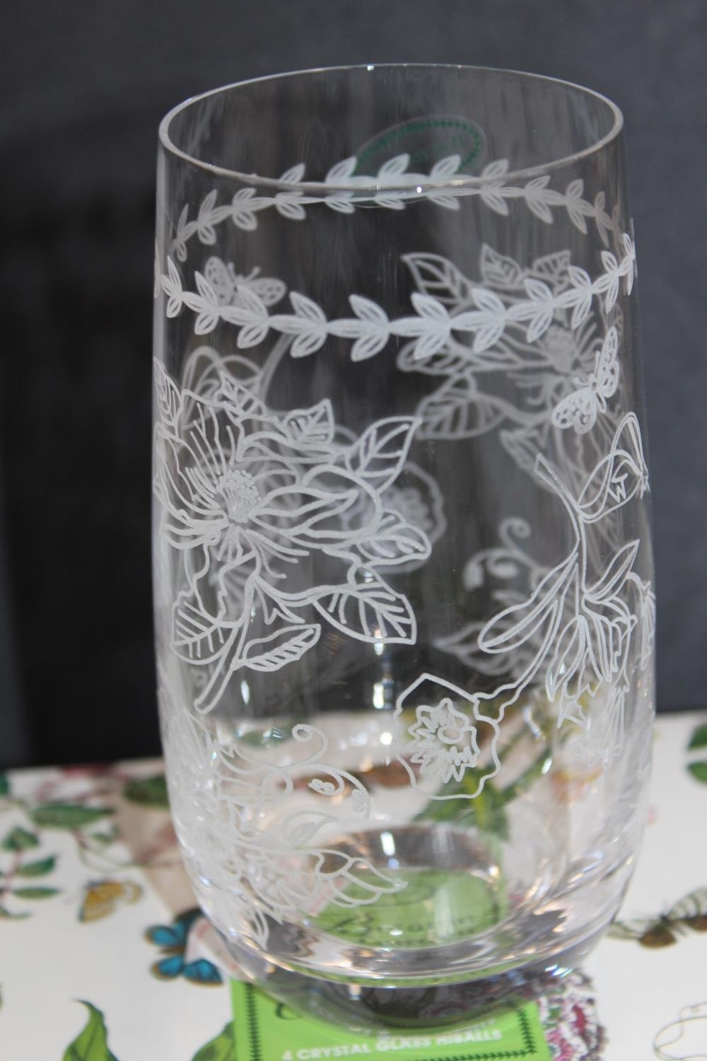 Portmeirion Botanic Garden pattern glassware to include a set of four wine glasses and a set of four highball glasses, boxed. (2)