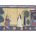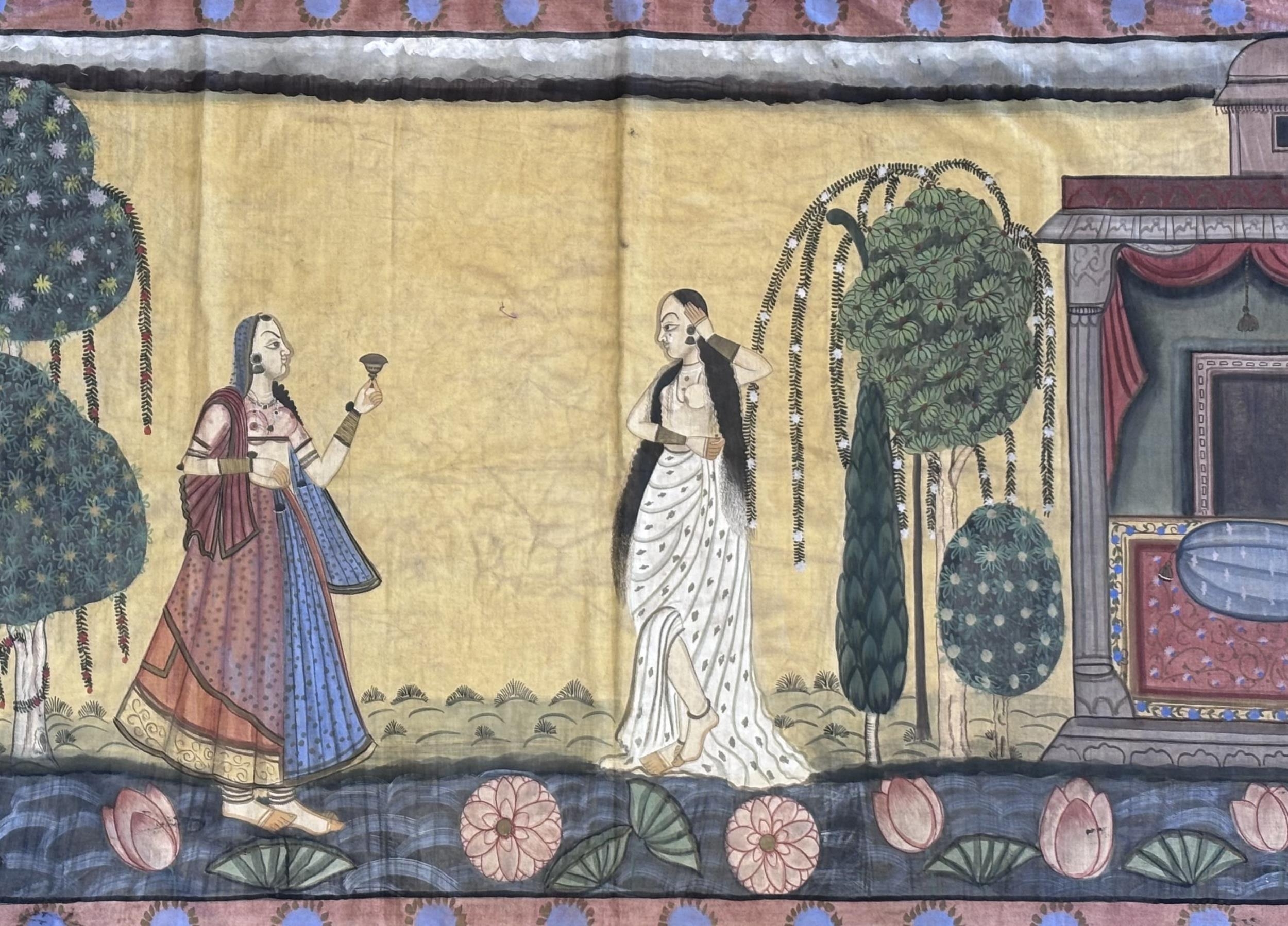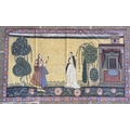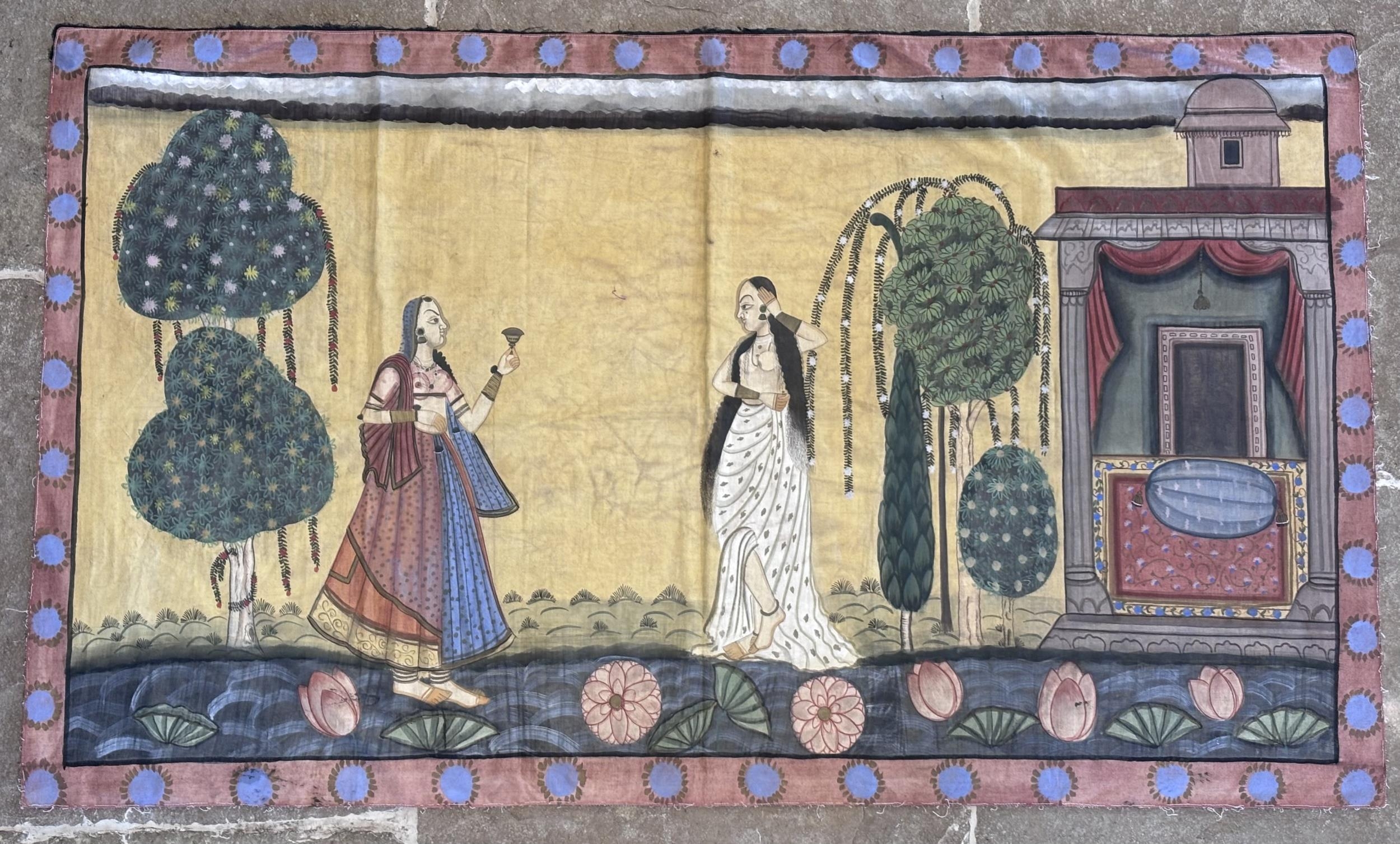 Rajastani School, late 19th century, painted textile panel (Pichwai), gouache, depicting Radah and a further Gopi within a pavilion and garden setting, 85cm x 145cm