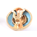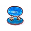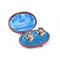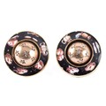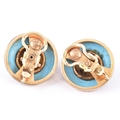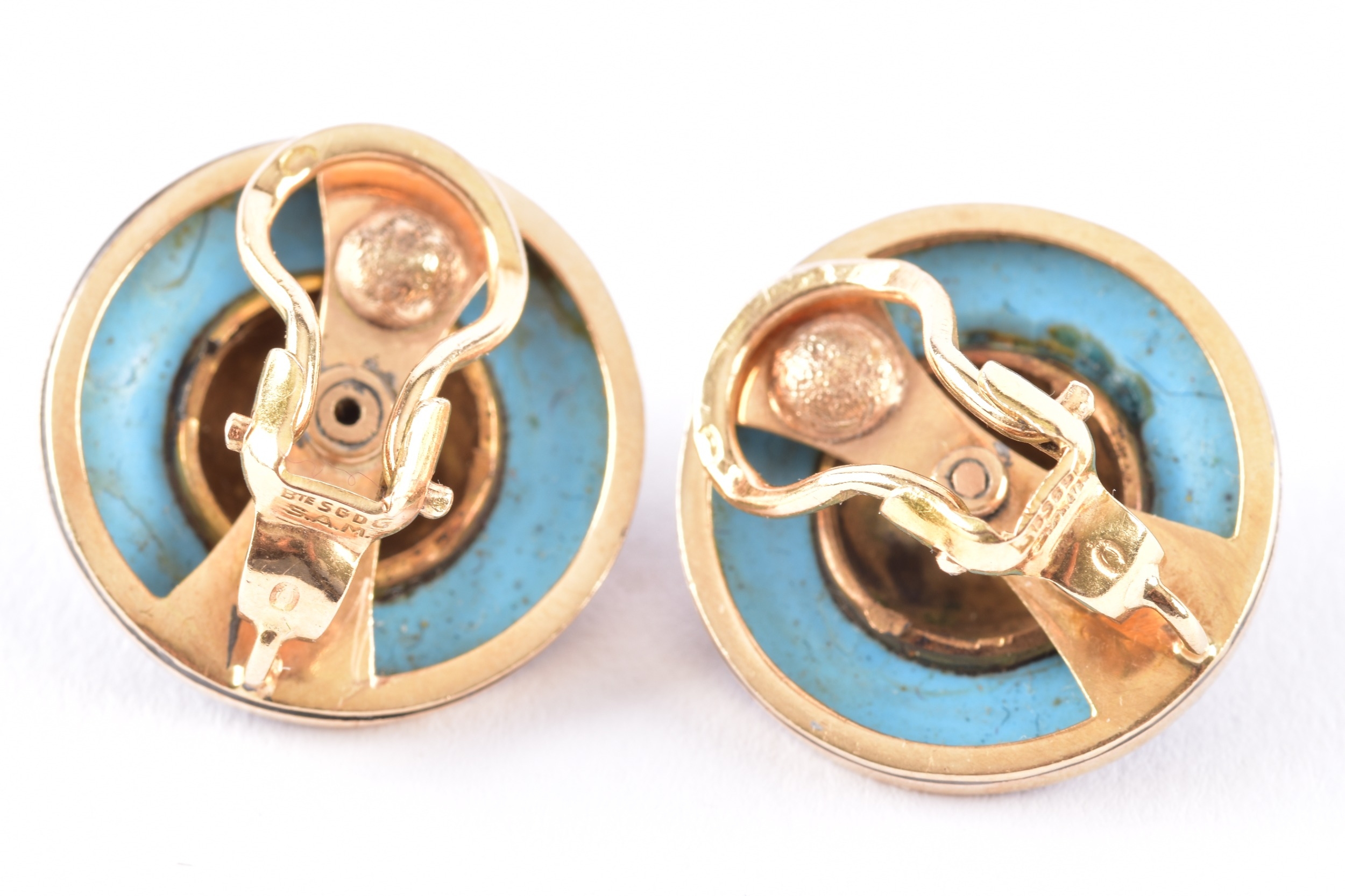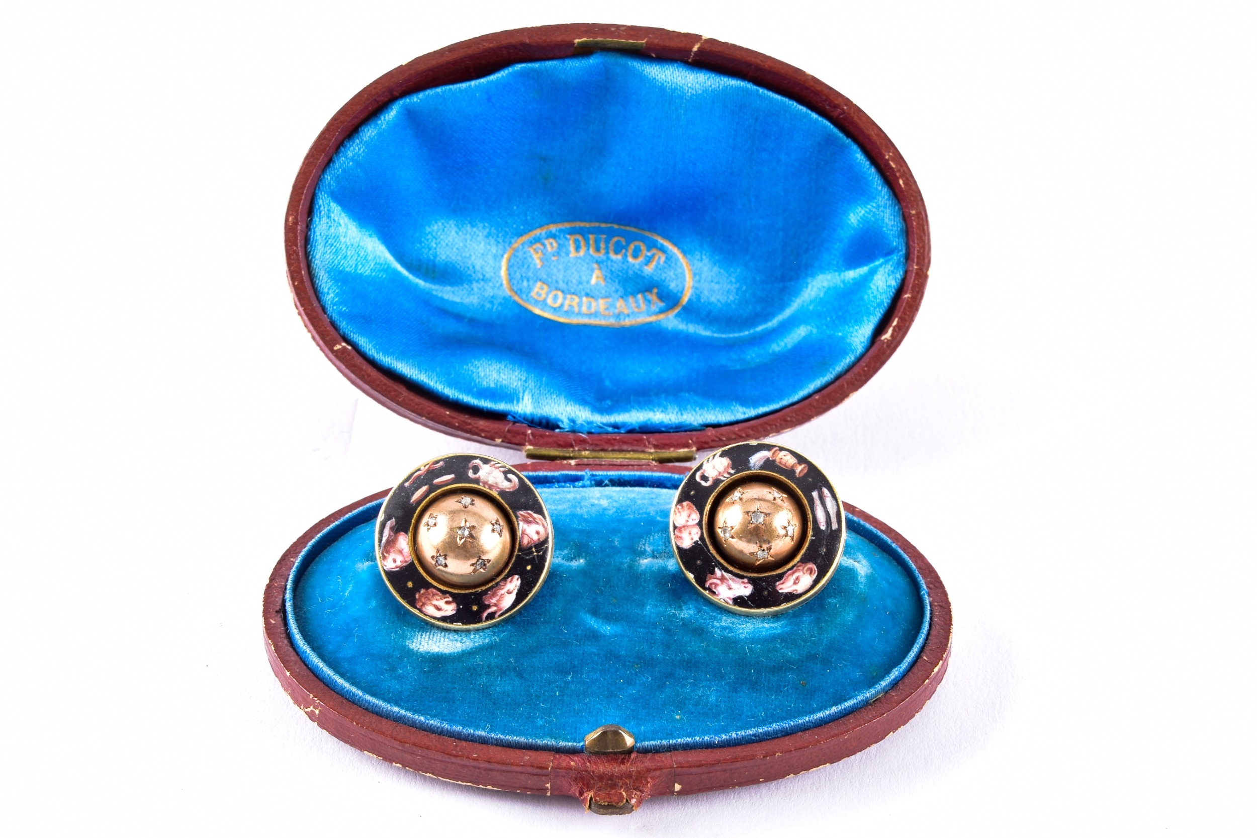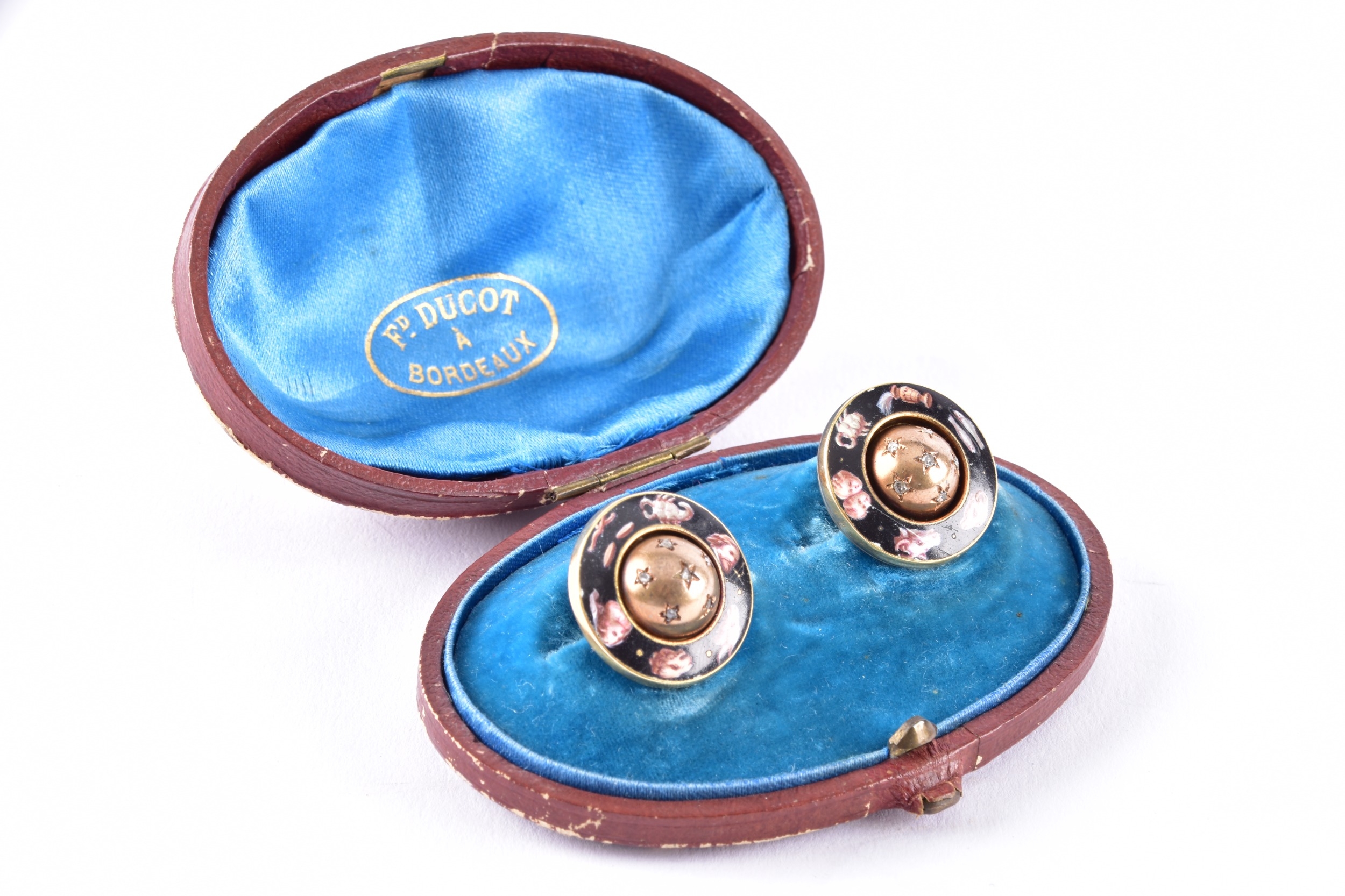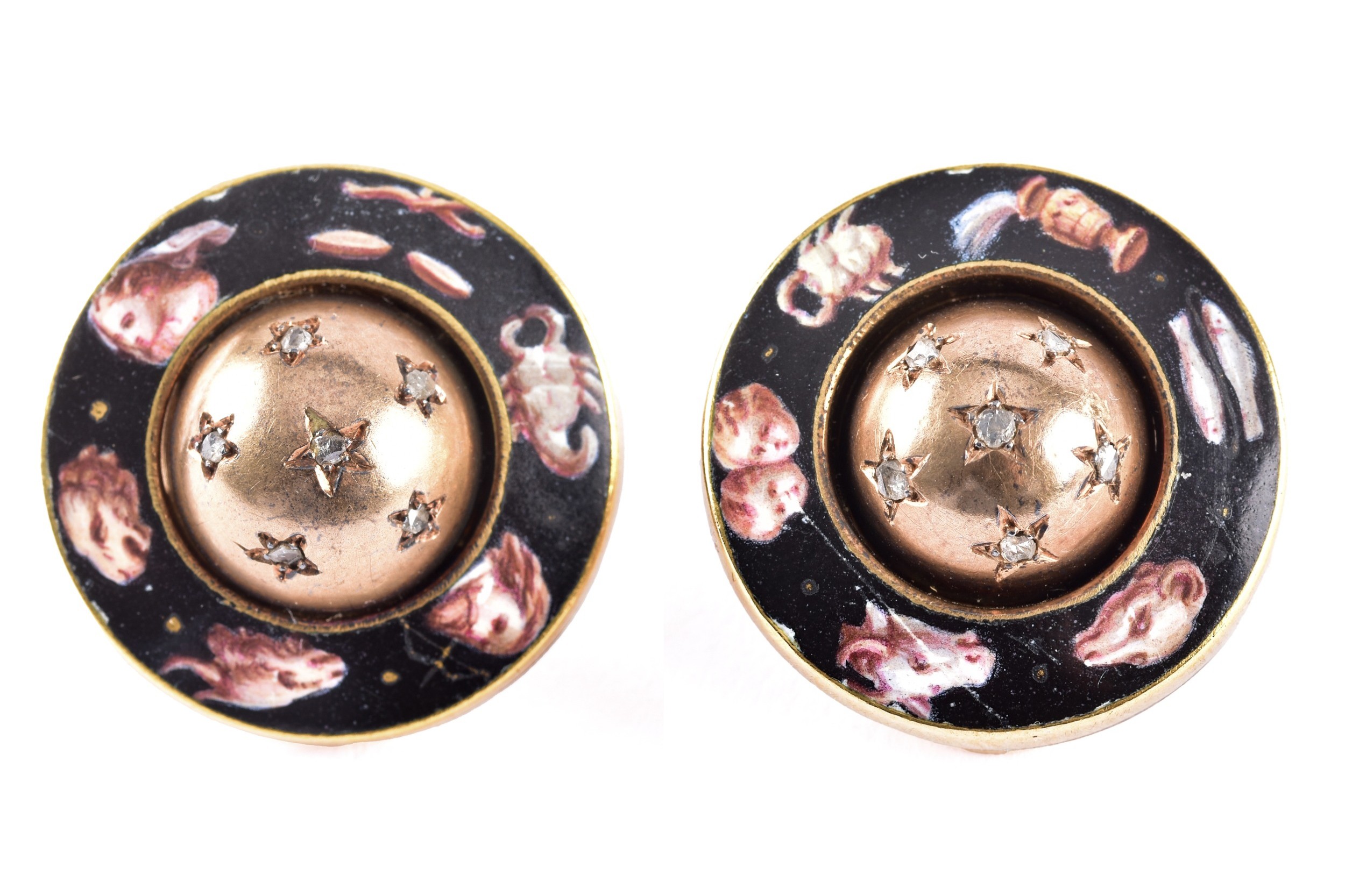 A pair of late 19th / early 20th century French enamel and 18ct gold clip earrings by Strauss, Allard & Meyer (SAM), each decorated with the signs of the zodiac on a black ground, each centred by a domed boss set with six rose-cut diamonds, the mounts with French import marks and clips stamped ‘Bte S.G.D.G.’, 2 cm diameter, presented in a fitted brown leather and blue lined box.