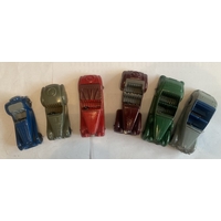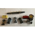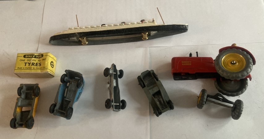 A collection of early Dinky Meccano models to include four miniature cars, tractor a/f, box of spare tyres & Cunard White Star liner. Unboxed, condition as photographed