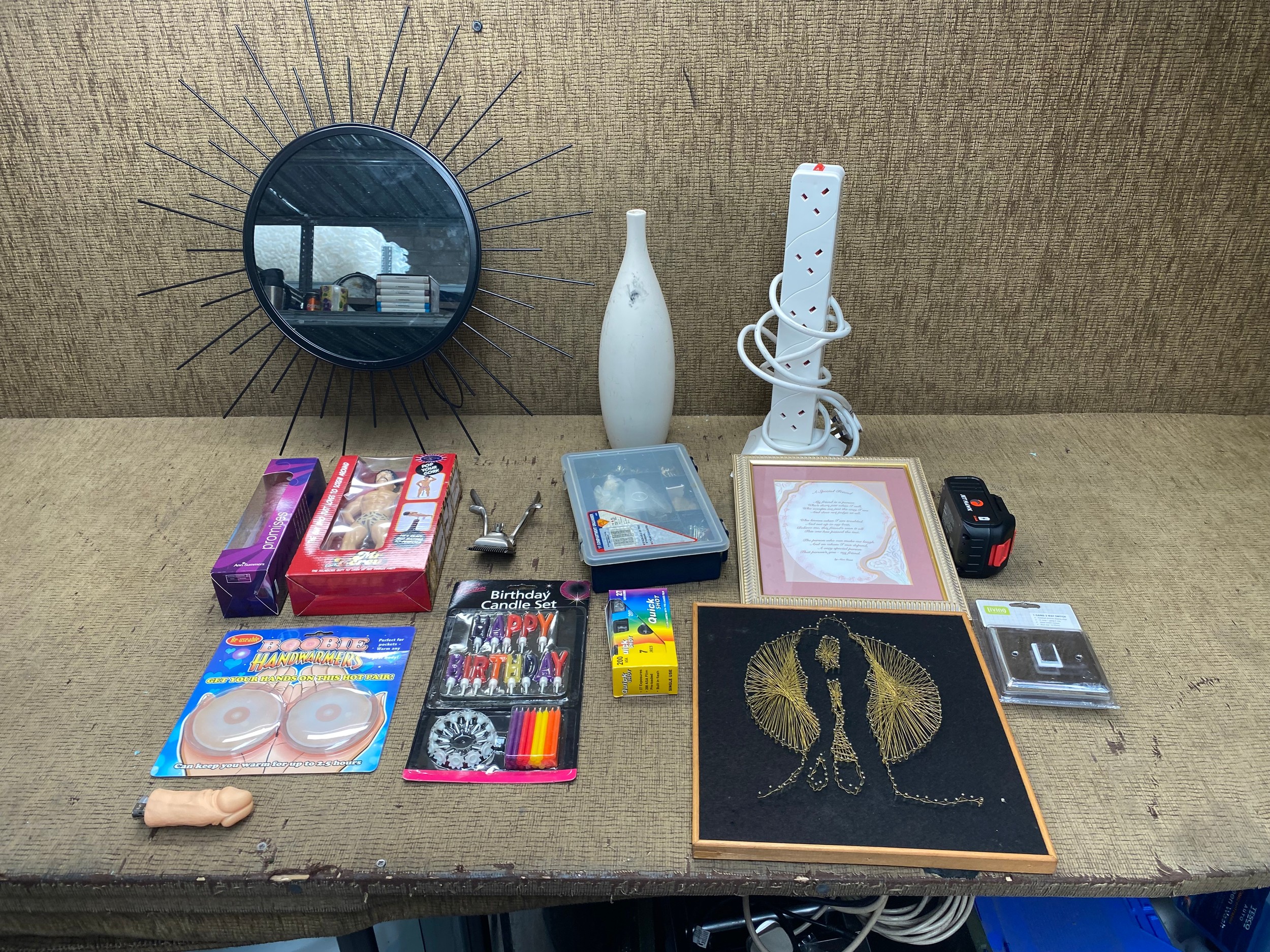 Mixed items including: Mirror, Adult toys and Mr. Screw bottle opener.