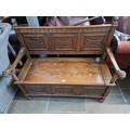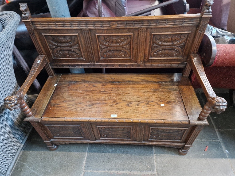 A carved oak monk's bench with lion's head terminals to the arms.